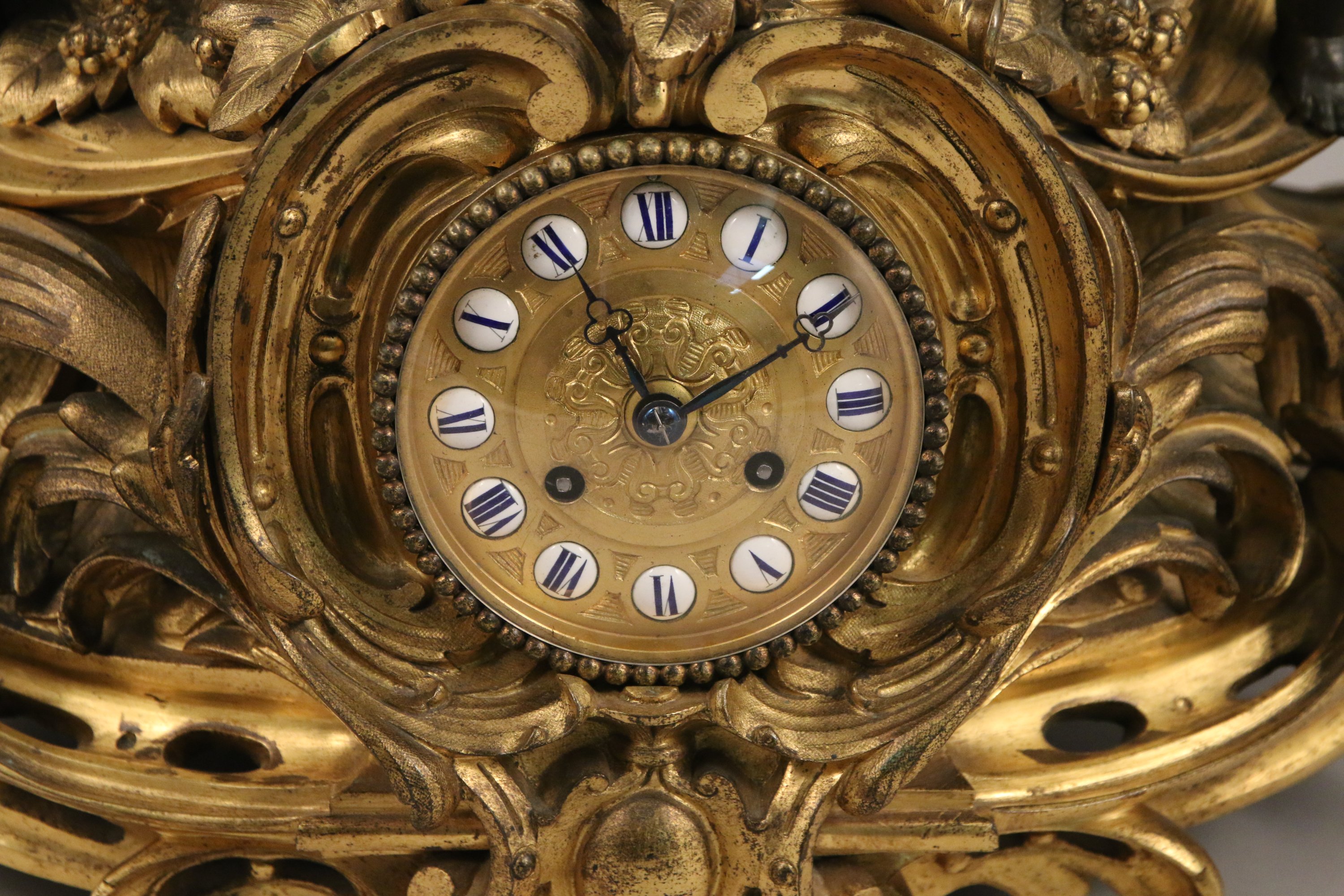 Le cadran circulaire en métal doré présente les heures en chiffres romains dans des cartouches émaillés. Mouvement à plaque signé "JAPY Médaille d'honneur" de l'Exposition universelle de Paris de 1855.
