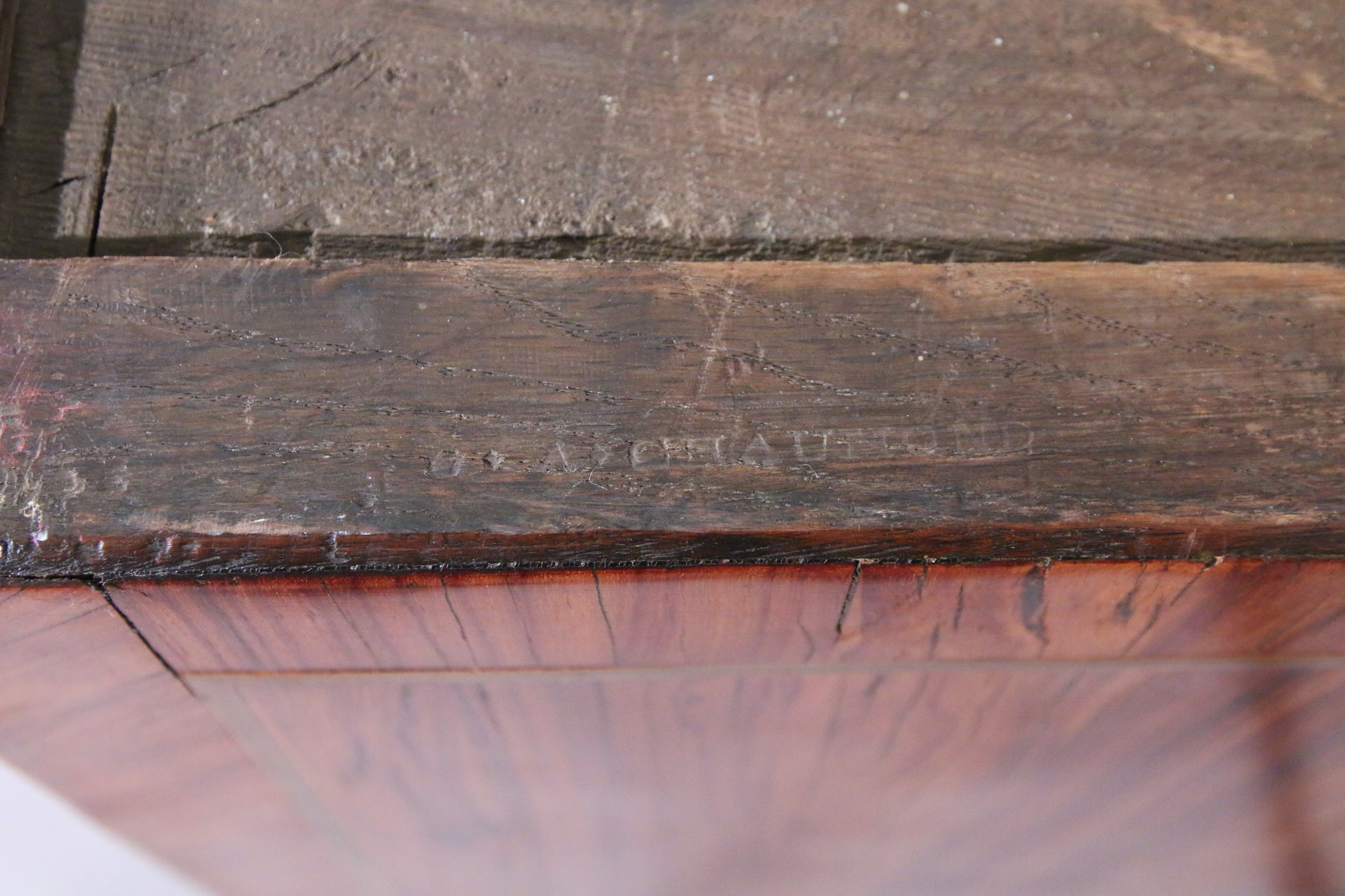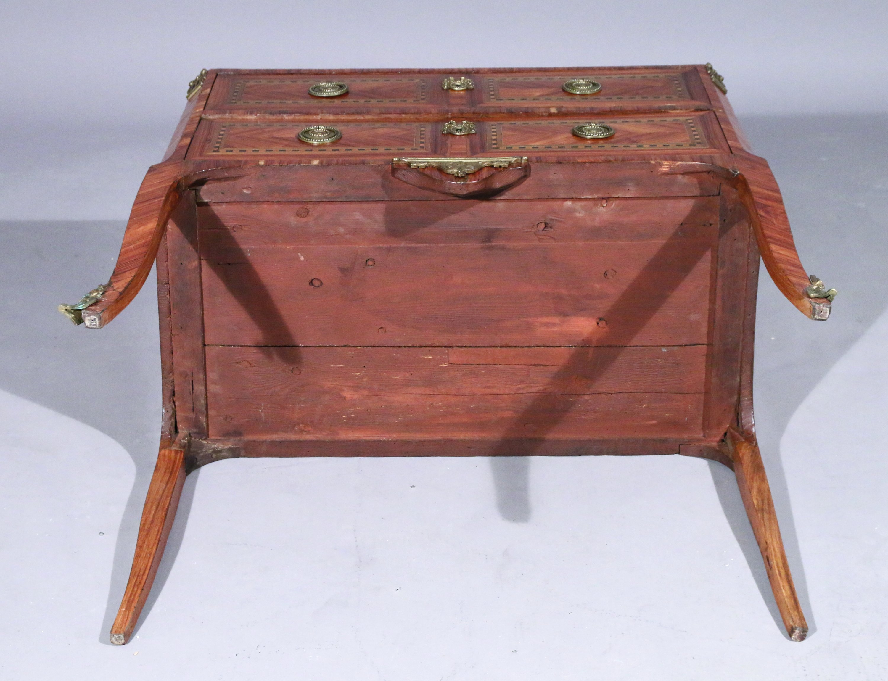en placage de bois de rose et filets de bois teinté vert et noir, dessinant quatre rectangles clos d'un quadrillages de bois sombre et clair en alternance. Le meuble ouvrant par deux tiroirs sans traverse, repose sur des pieds légèrement galbés. Ornementation d'anneaux de tirage, entrées de serrures, chutes d'angles, et cul de lampe et sabots en bronze doré.