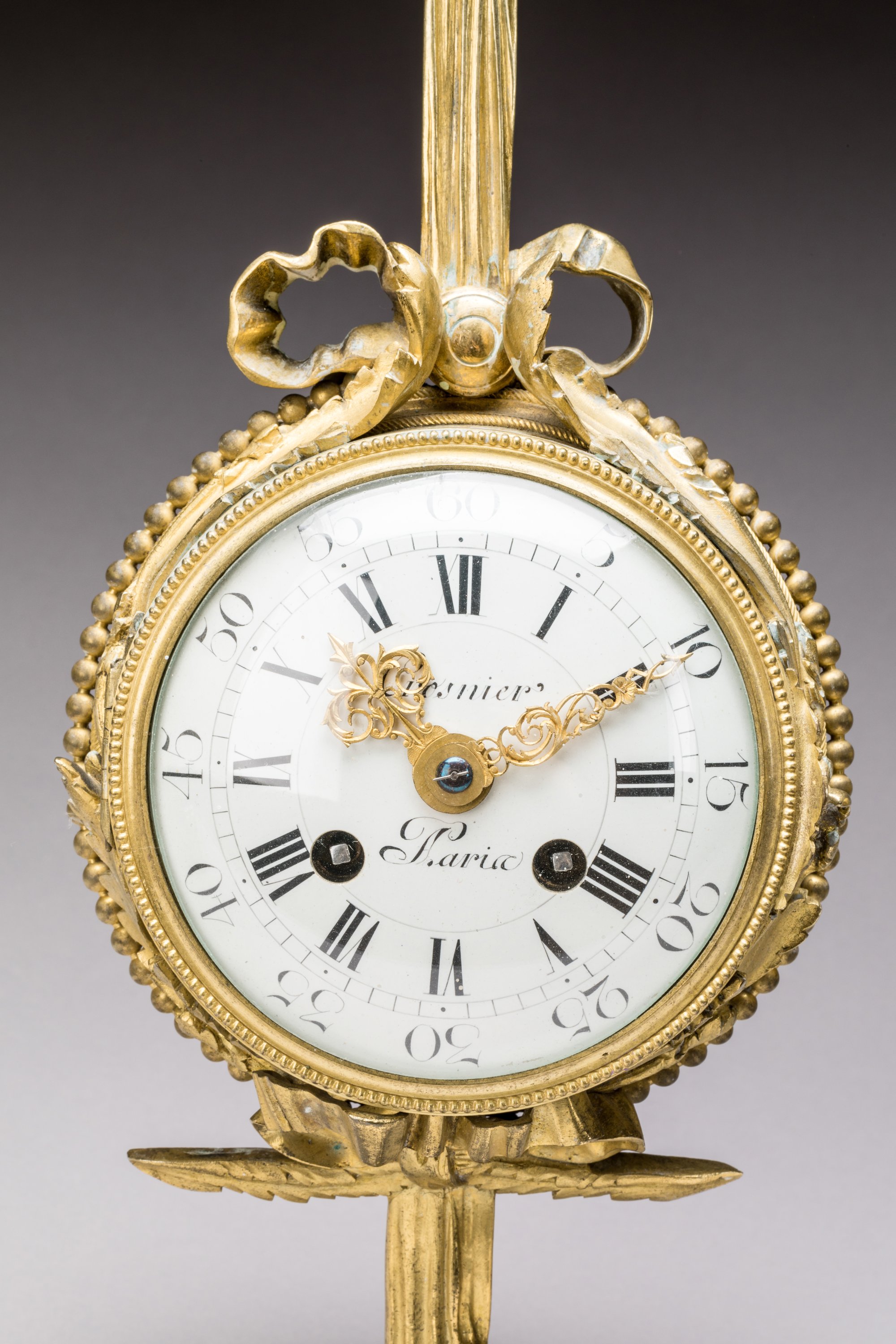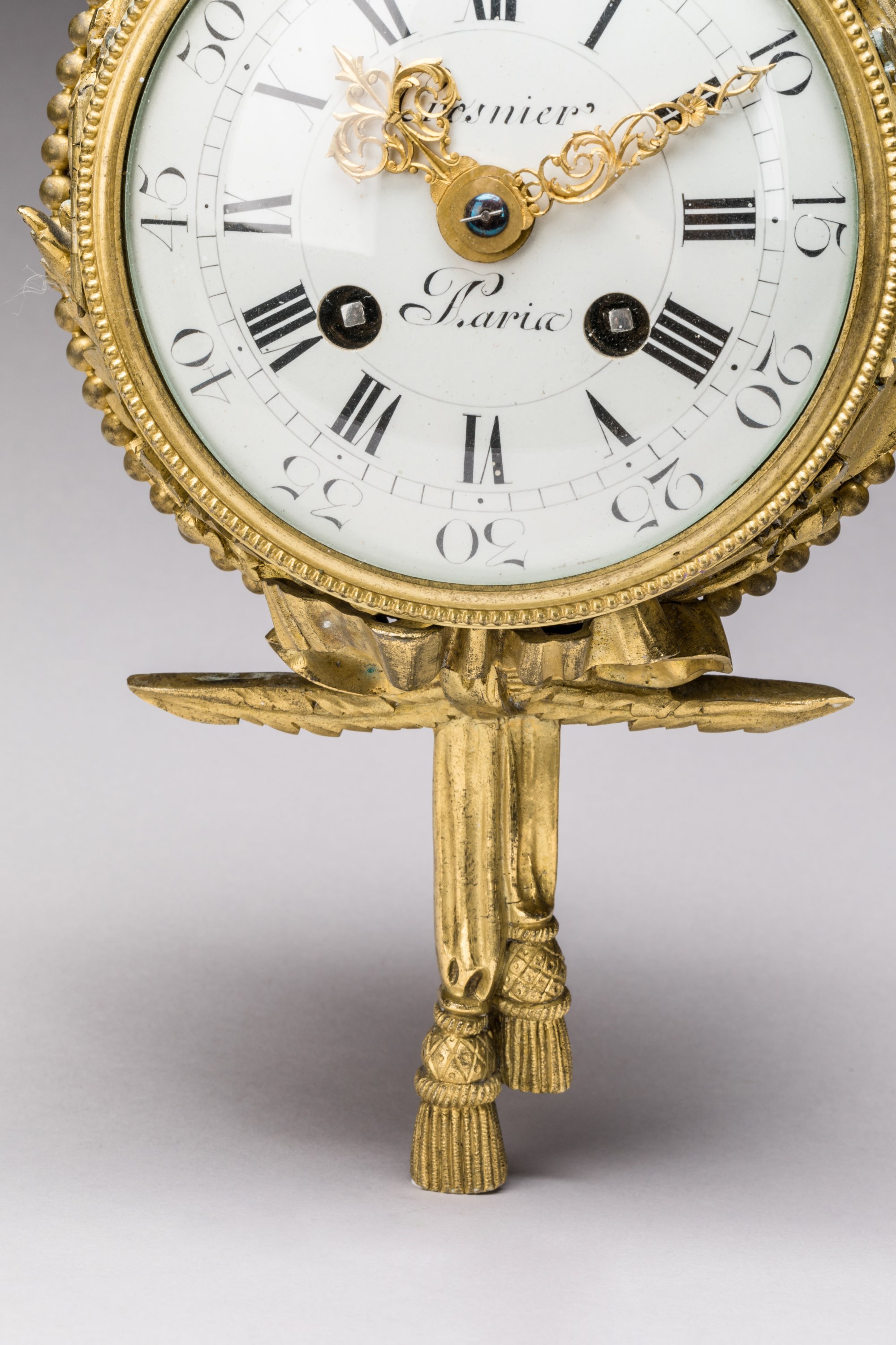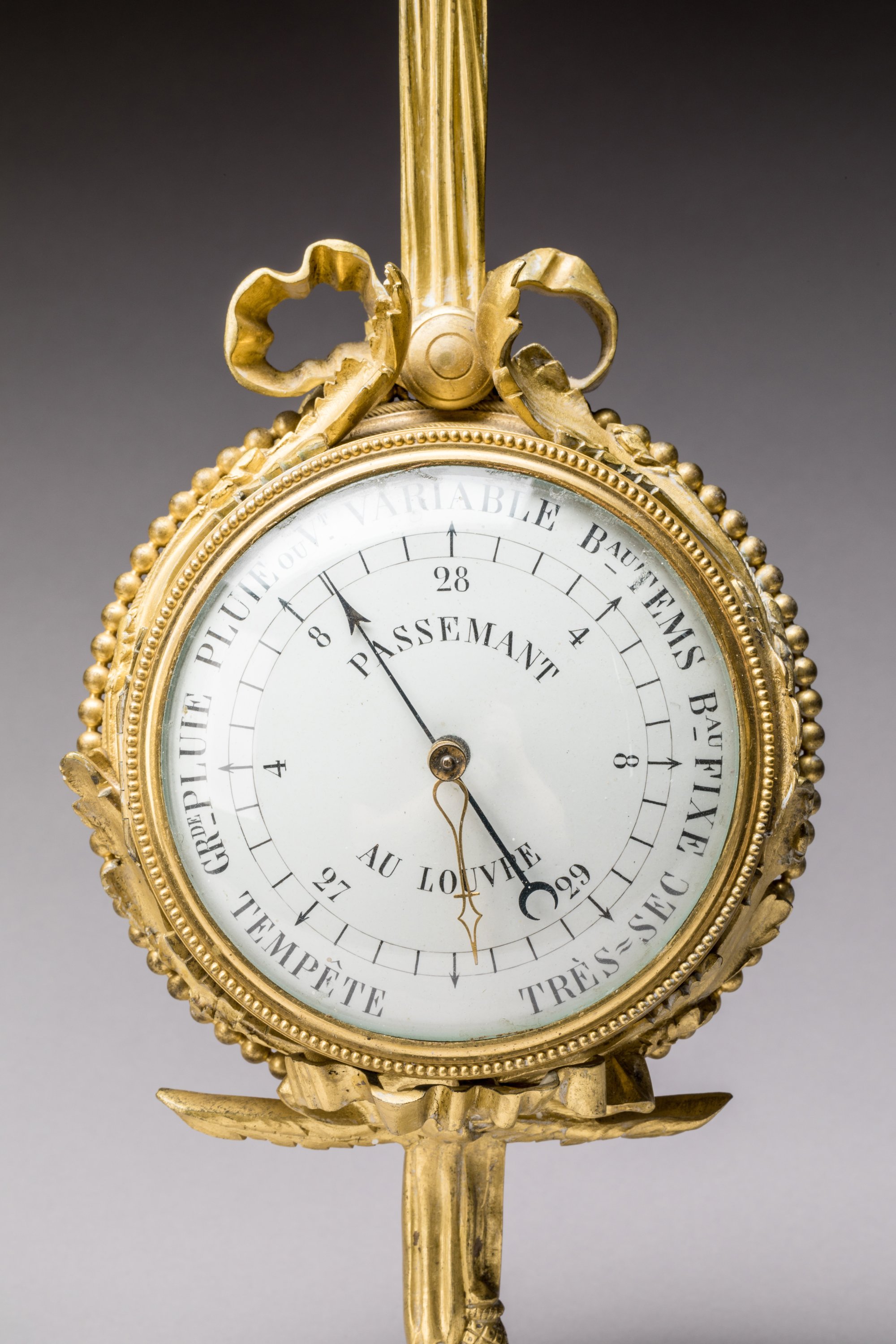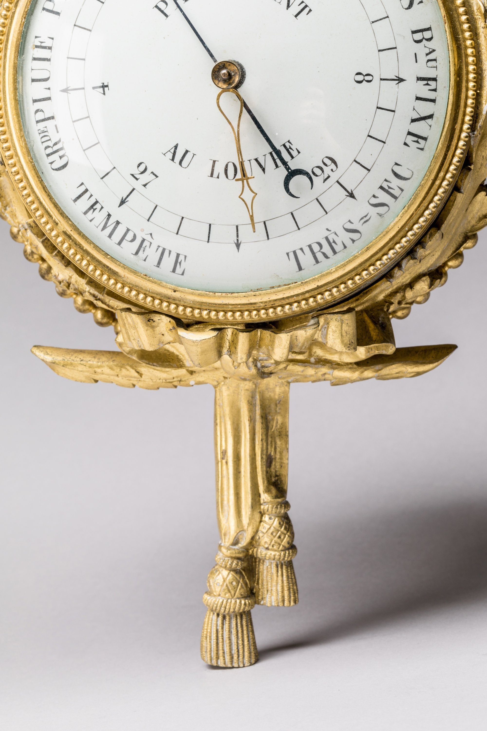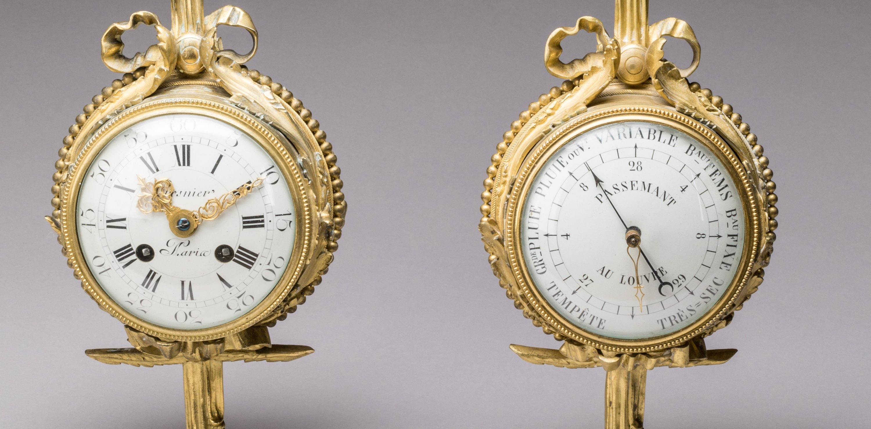 en bronze doré, de forme circulaire, suspendus par un ruban noué et terminés par des franges, dans un entourage de feuilles d'acanthe et rang de perle. Les cadrans émaillés, avec pour le baromètre signé de "Passemant au Louvre" des chiffres arabes et pour l'horloge signée de "Crosnier à Paris" des chiffres romains pour les heures, chaque période de cinq minutes en chiffres arabes et graduée pour les minutes.