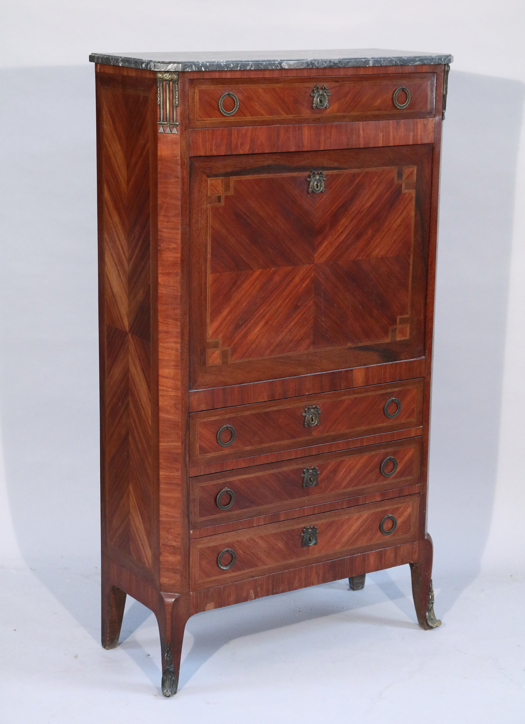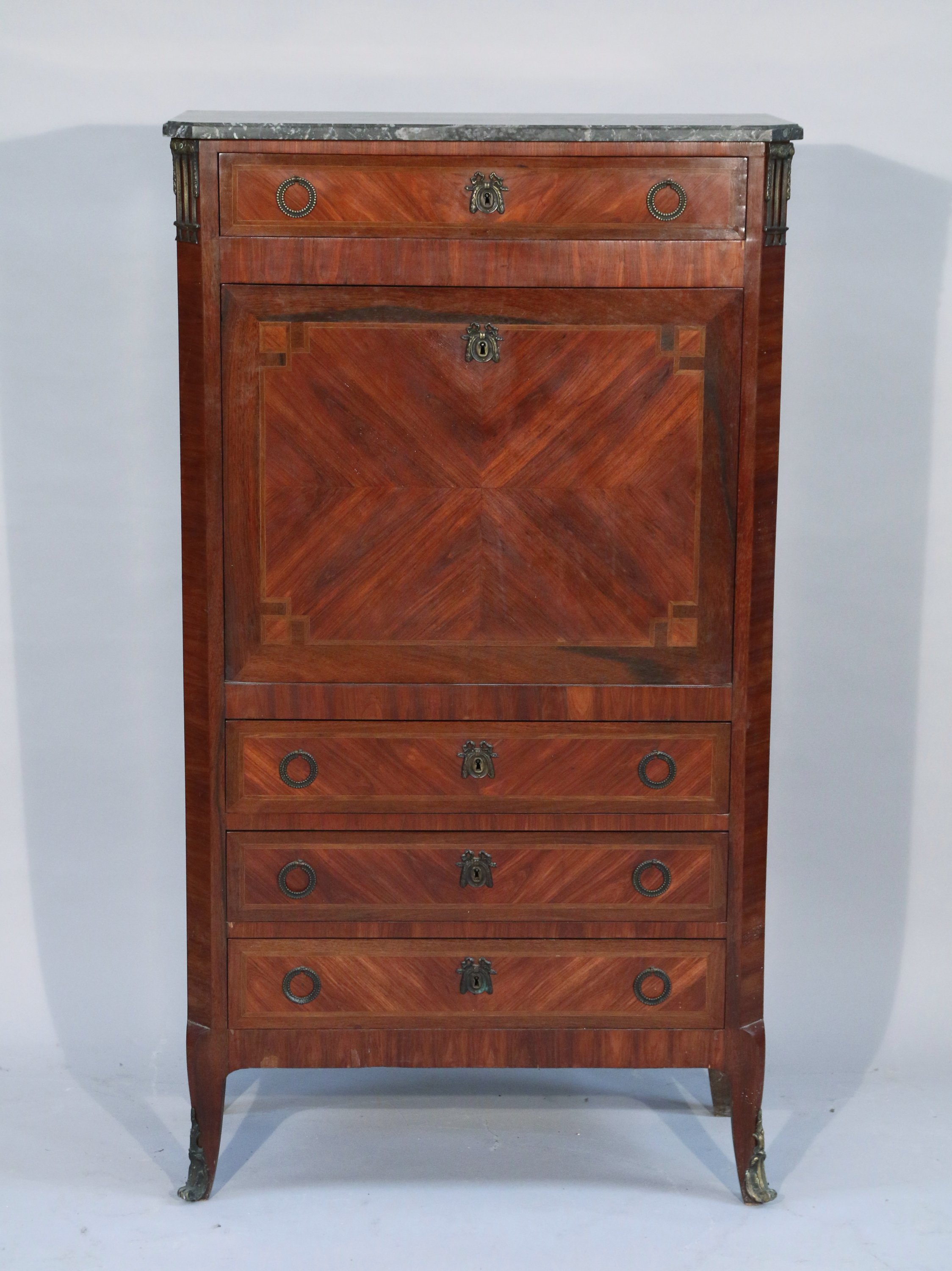 en placage de bois de rose et frisage en ailes de papillon et encadrement de filets. Il ouvre par quatre tiroirs et un abattant qui révèle un écritoire gainé de cuir, six petits tiroirs et une niche.