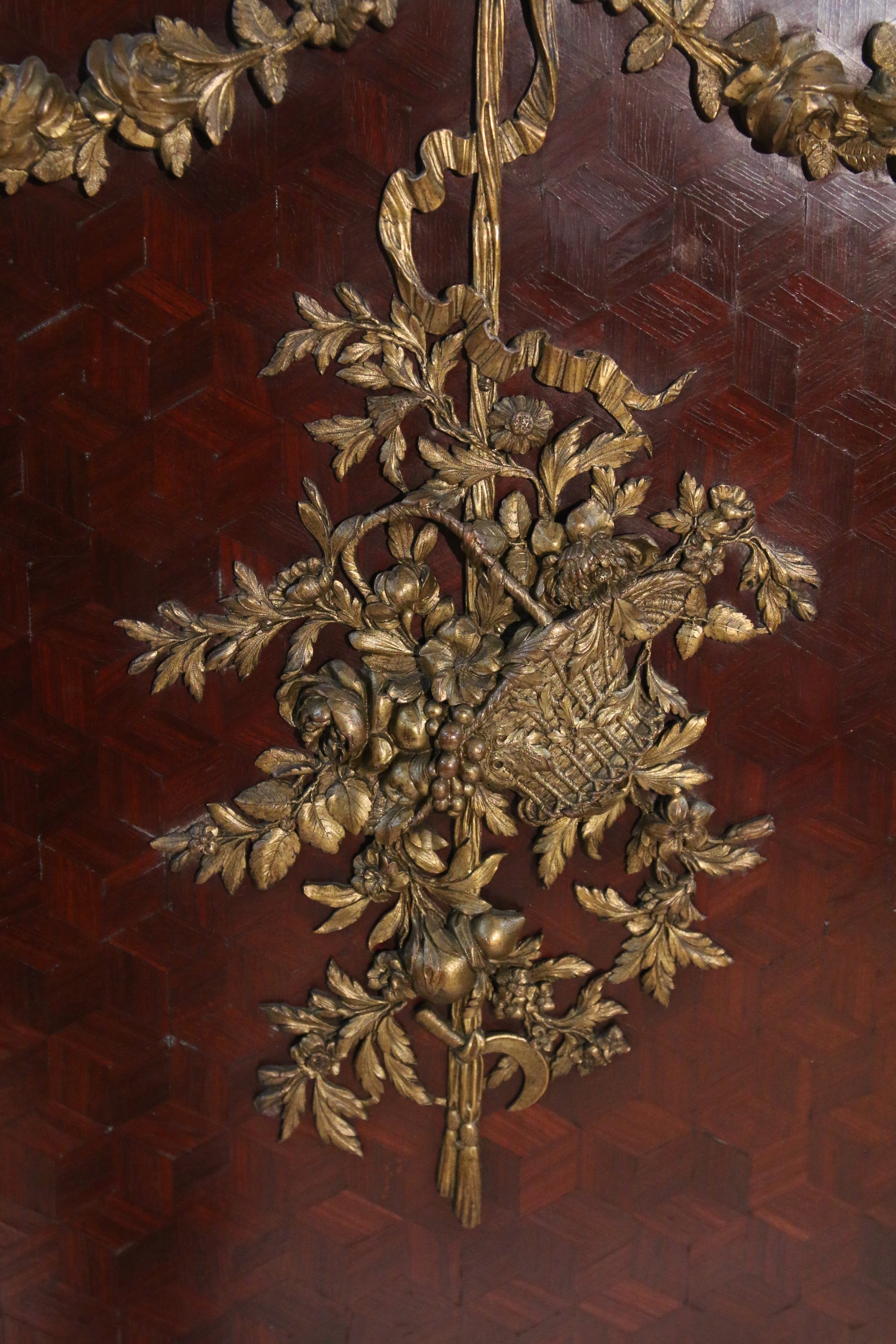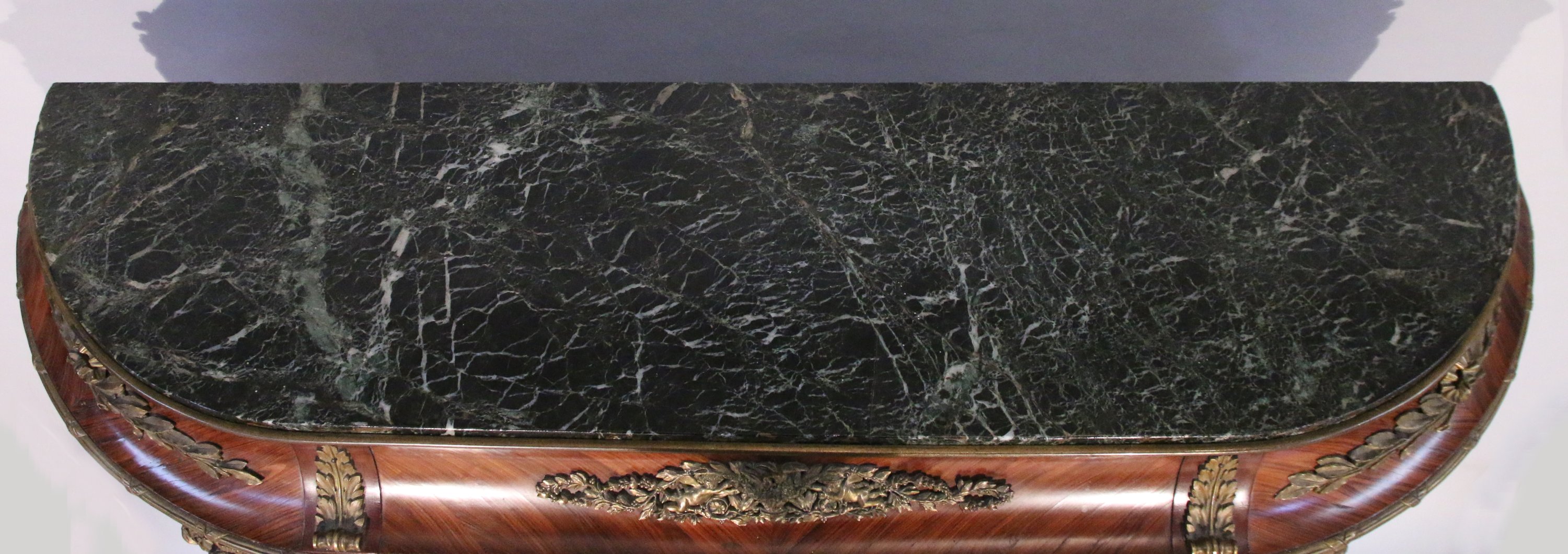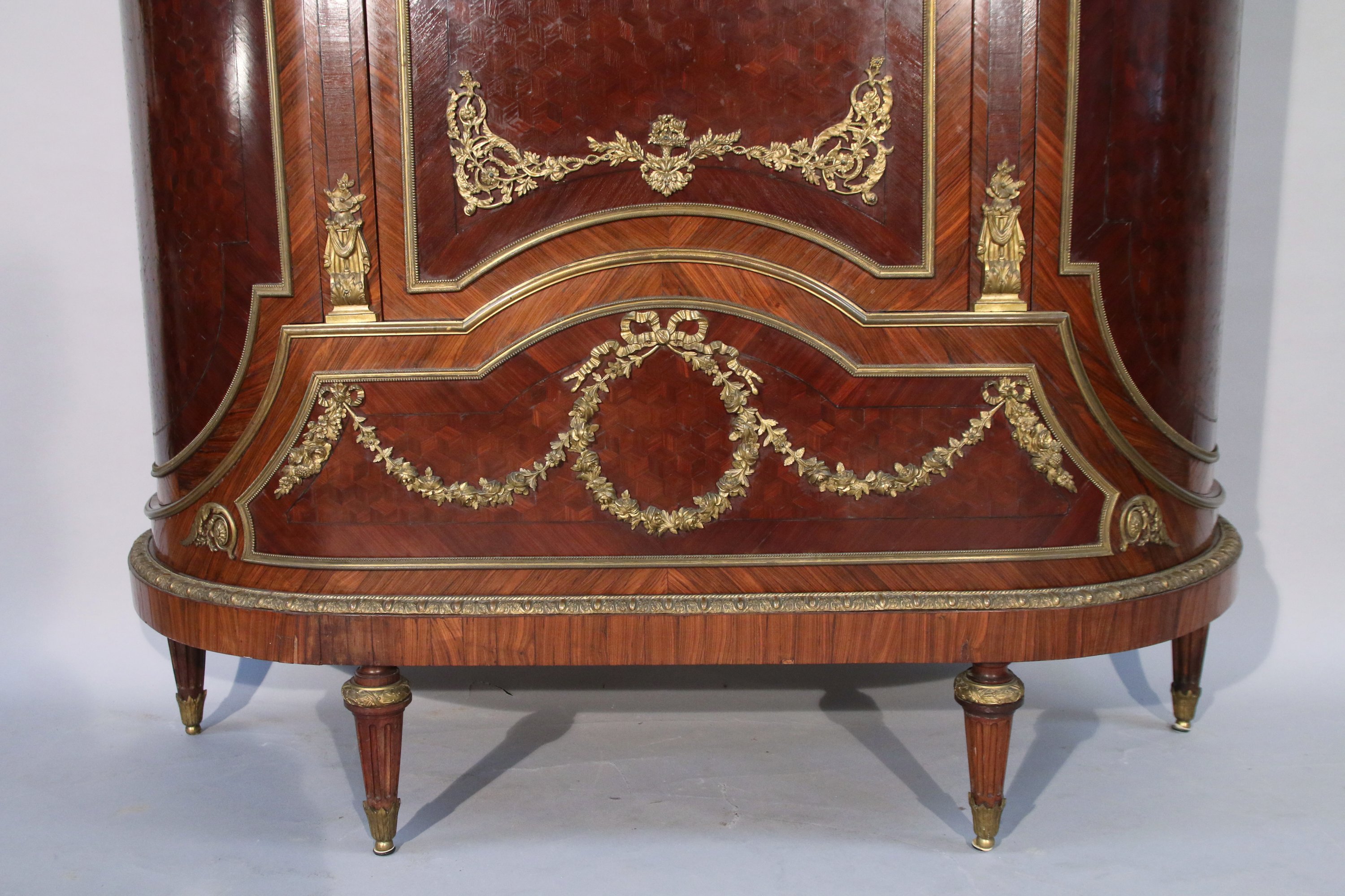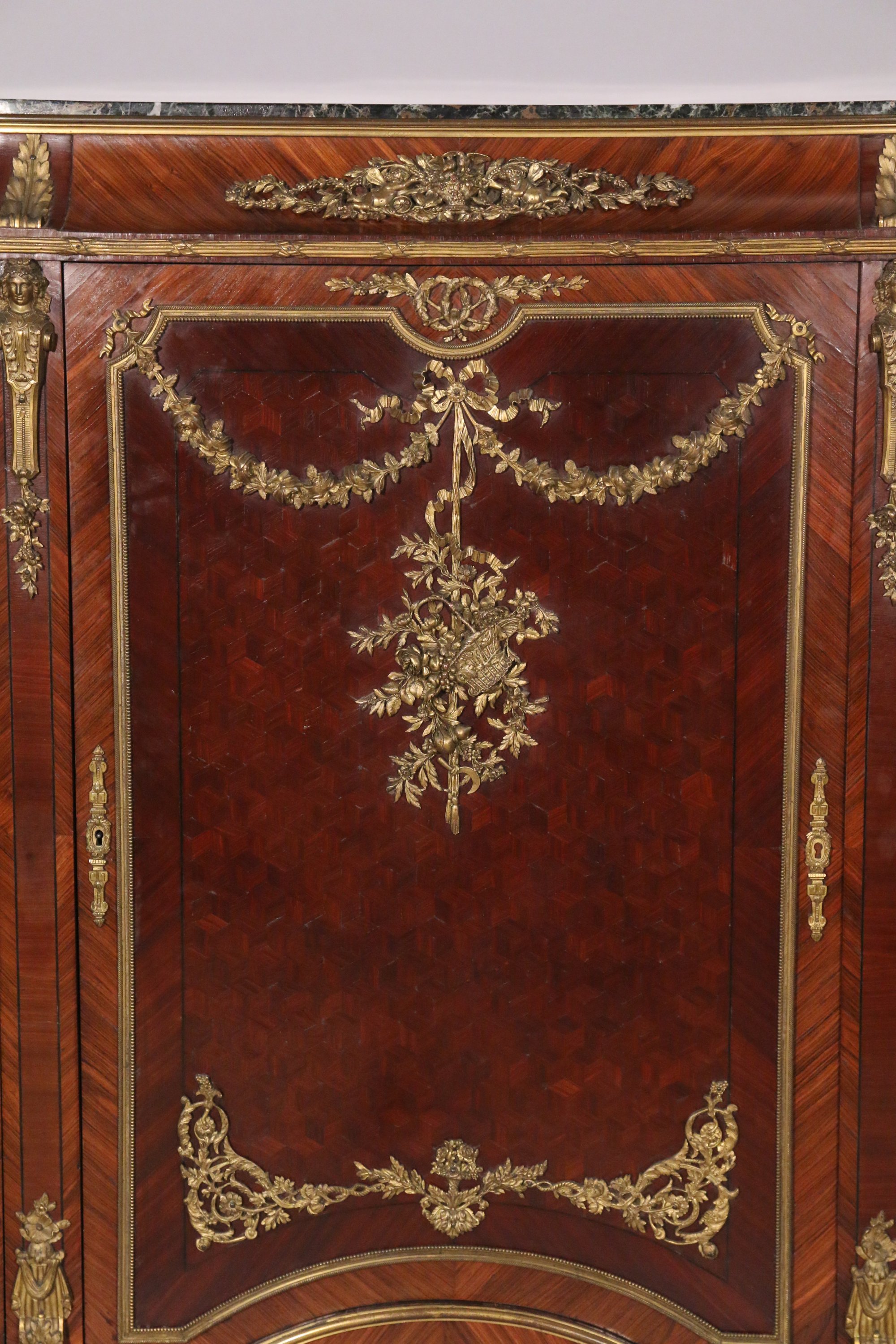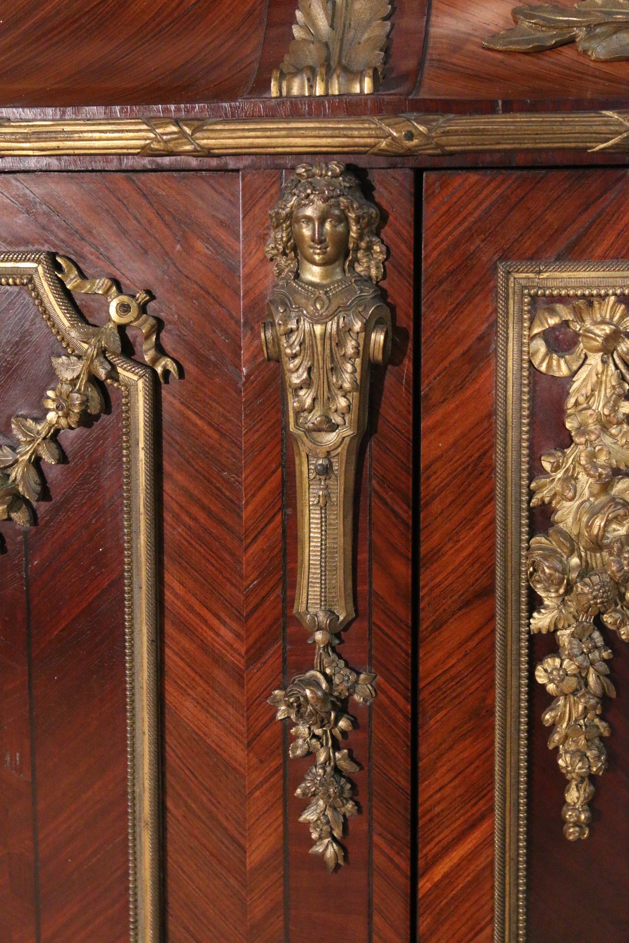 ouvrant à trois portes, les côtés arrondis, en placage de bois exotique, de rose et palissandre. Les vantaux et la partie base reçoivent un décor marqueté de motif de cubes en amarante dans des encadrements en bronze doré, mouluré et guirlandes et trophées de fleurs. Les montants ornés de cariatides en chute. Il repose sur quatre pieds toupies à cannelures. La partie surpérieur à doucine coiffée d'un marbre vert antique, ornée au centre d'une large à frise à décor rinceaux et de deux amours ailés tenant un panier fleuri.