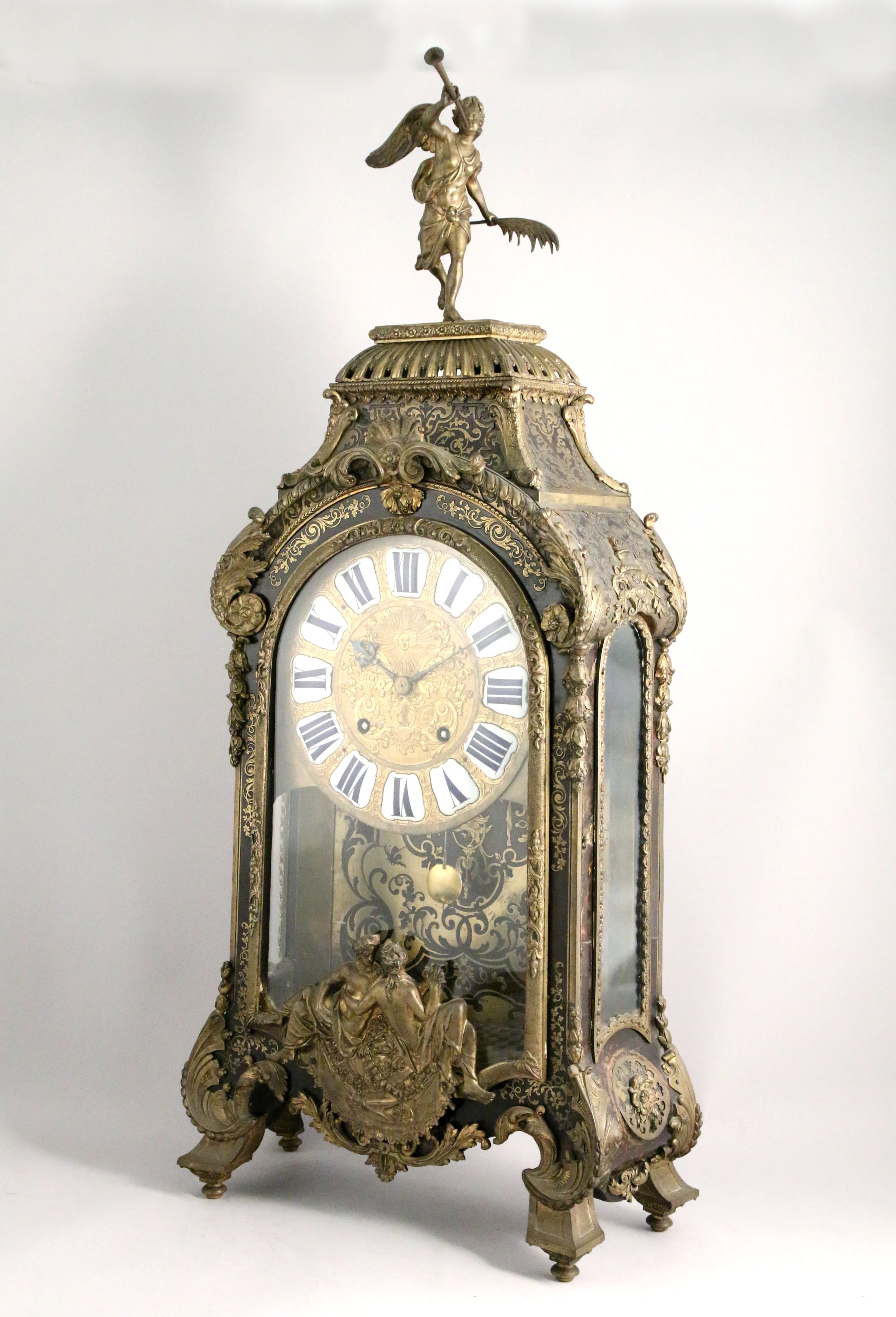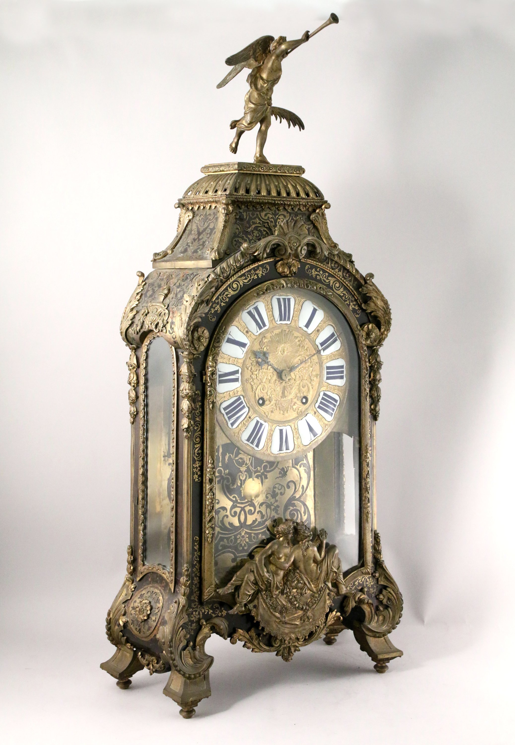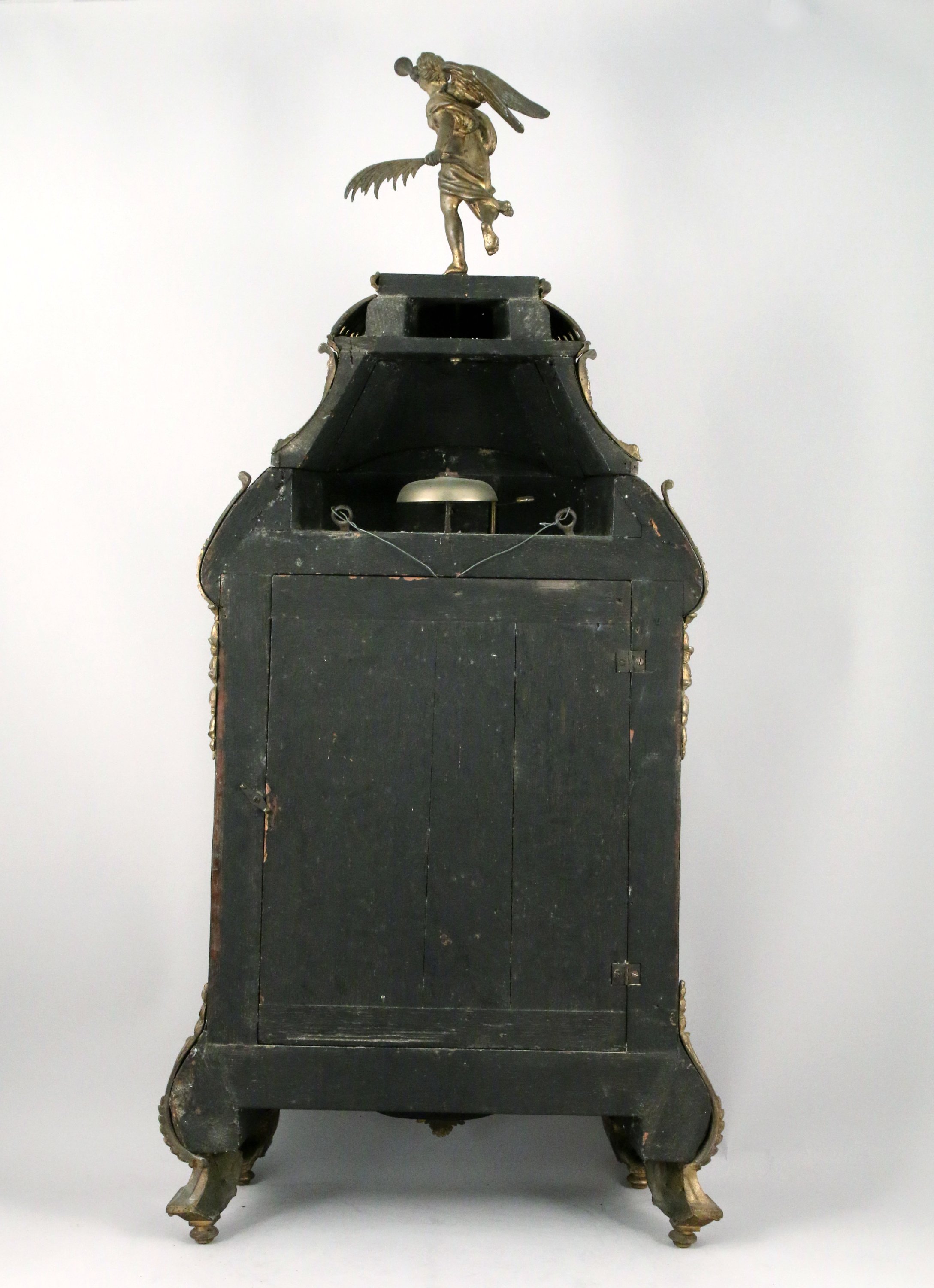 en marqueterie dite "Boulle" plaquée de filets de laiton et d'écaille. Décor en bronze de deux nymphes en partie basse de part et d'autre d'un lion tenant l'ordre du Saint Esprit et de la Toison d'Or. La partie supérieure sommée d'une renommée en bronze tenant dans sa main gauche une palme et dans sa main droite une trompe. Le cadran avec les heures en médaillons émaillés, orné de paniers fleuris, rinceaux et d'un visage rayonnant. Il repose sur quatre pieds à enroulement feuillagé. Le cul-de-lampe orné de deux têtes de femmes feuillagées.