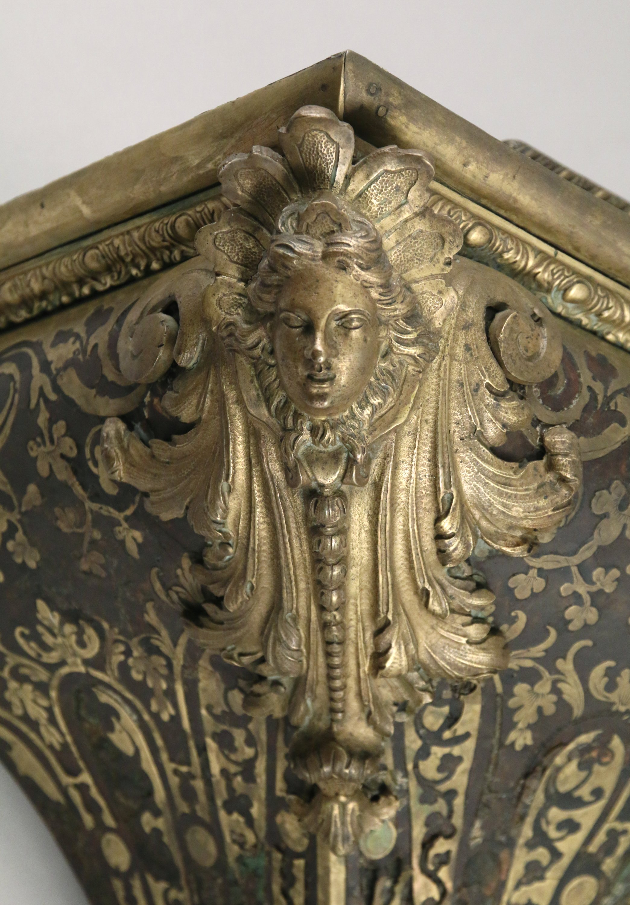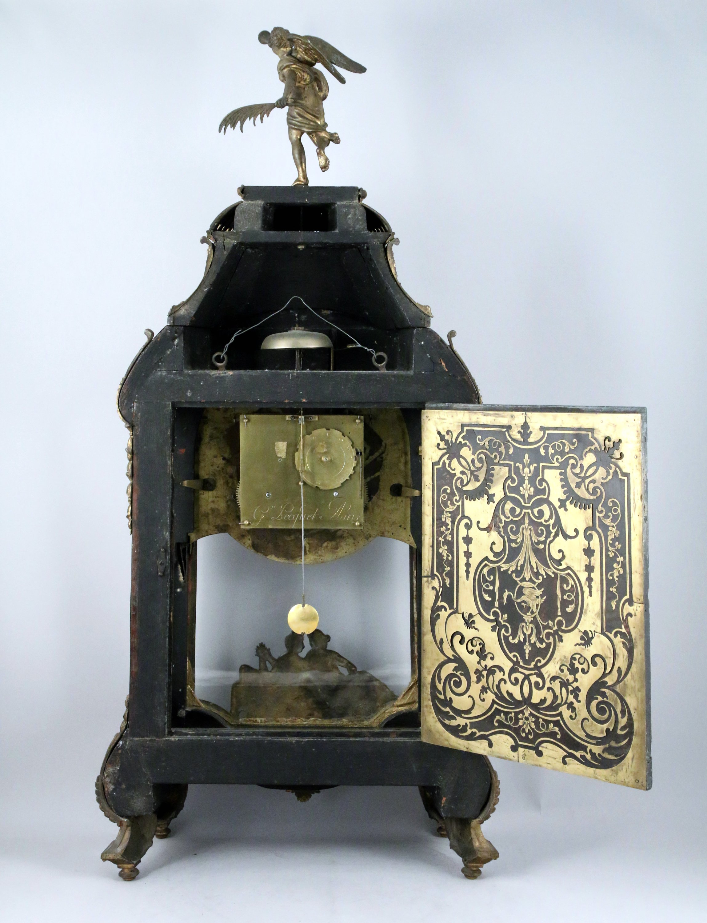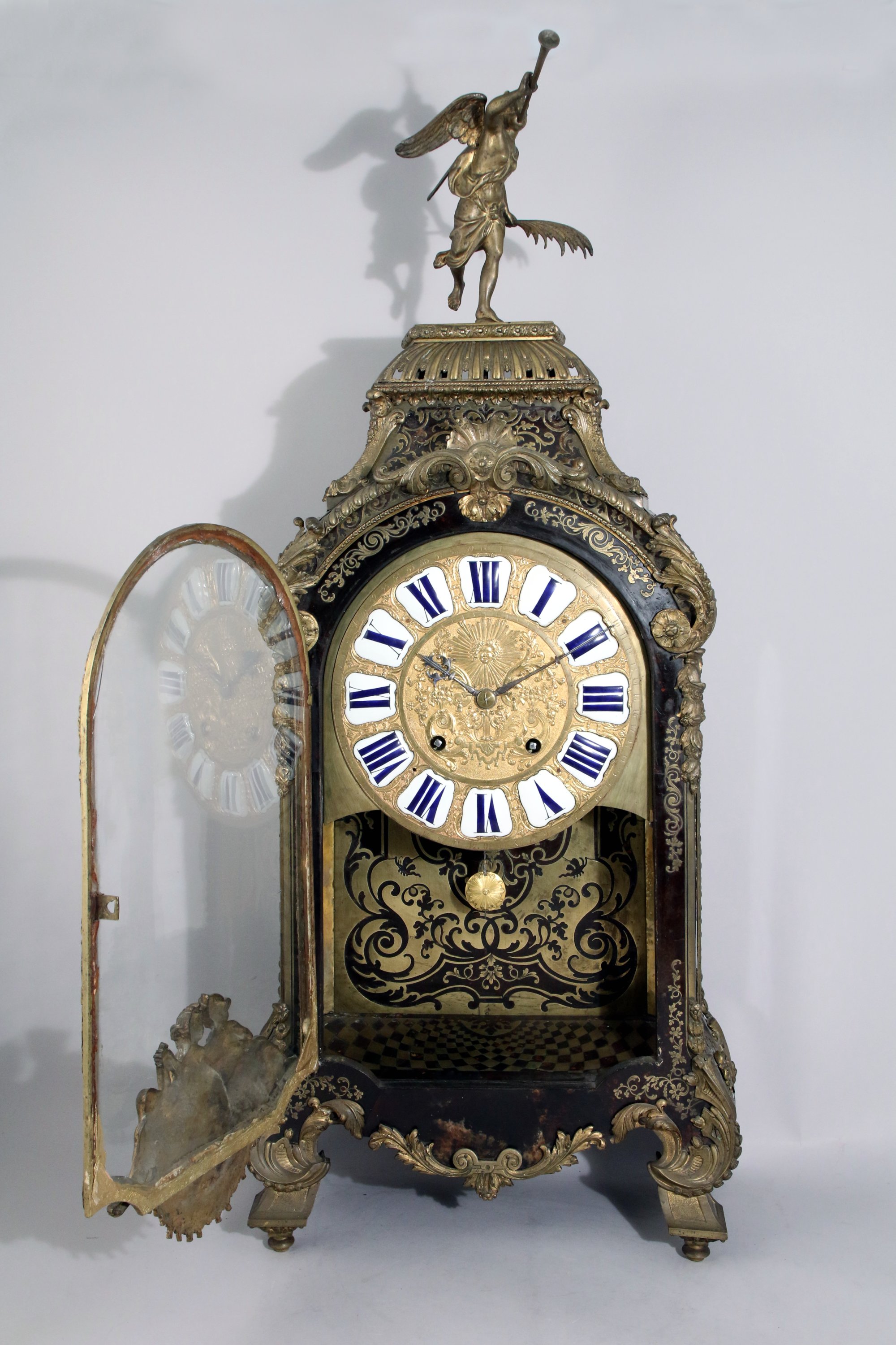en marqueterie dite "Boulle" plaquée de filets de laiton et d'écaille. Décor en bronze de deux nymphes en partie basse de part et d'autre d'un lion tenant l'ordre du Saint Esprit et de la Toison d'Or. La partie supérieure sommée d'une renommée en bronze tenant dans sa main gauche une palme et dans sa main droite une trompe. Le cadran avec les heures en médaillons émaillés, orné de paniers fleuris, rinceaux et d'un visage rayonnant. Il repose sur quatre pieds à enroulement feuillagé. Le cul-de-lampe orné de deux têtes de femmes feuillagées.