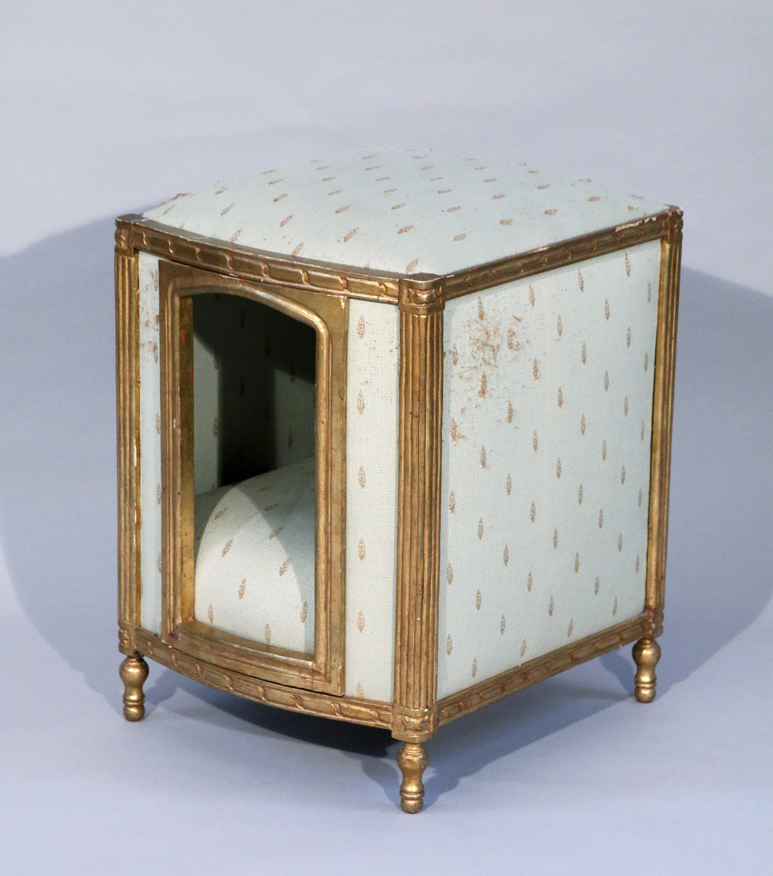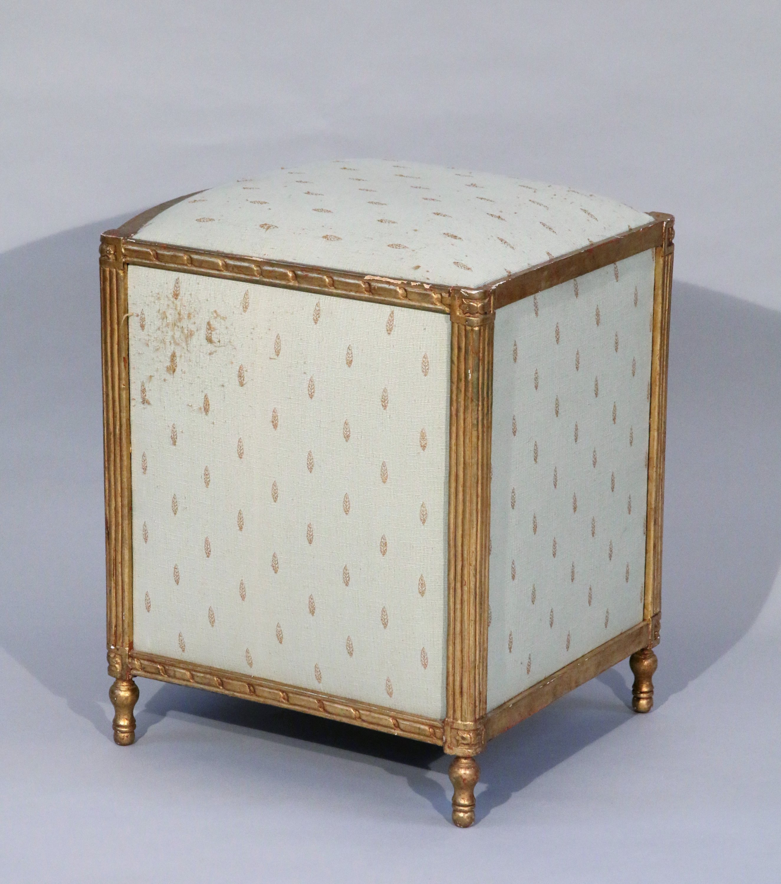 en bois mouluré et doré, de forme cubique, à montant cannelés et traverses enrubannées reposant sur quatre pieds balustres. Garniture en tissus émeraude.