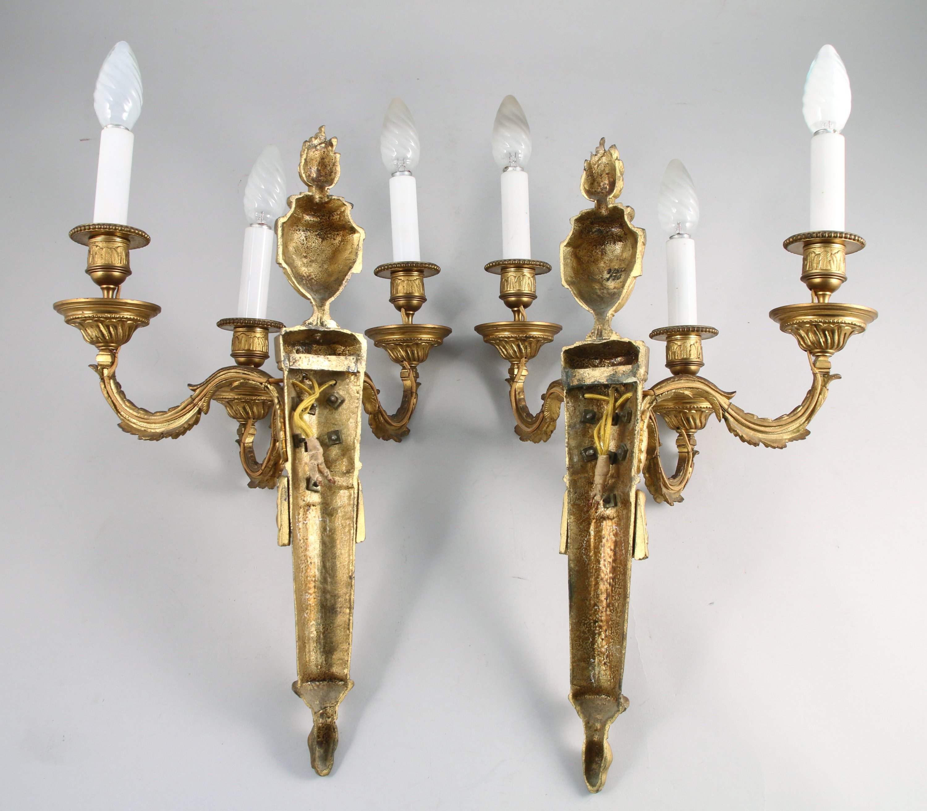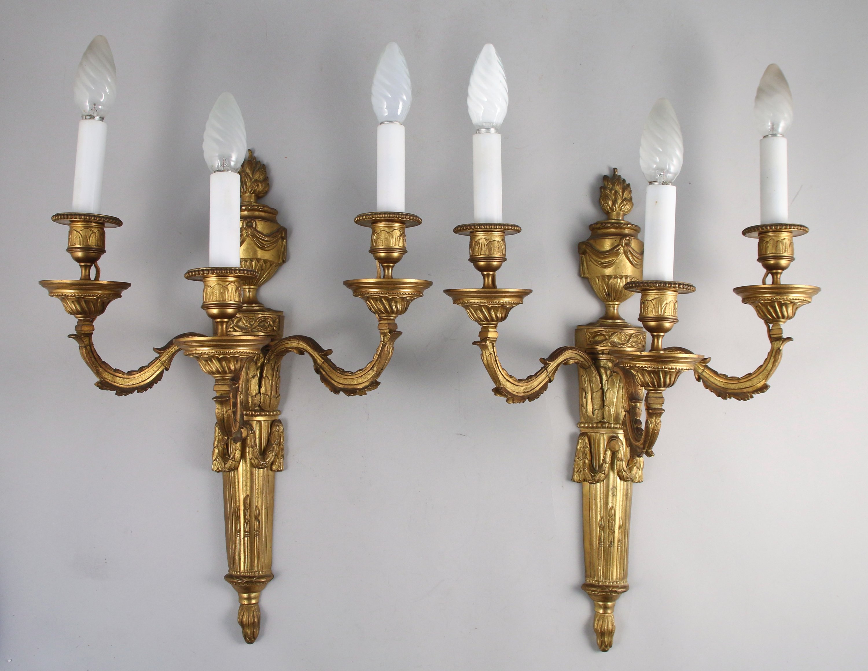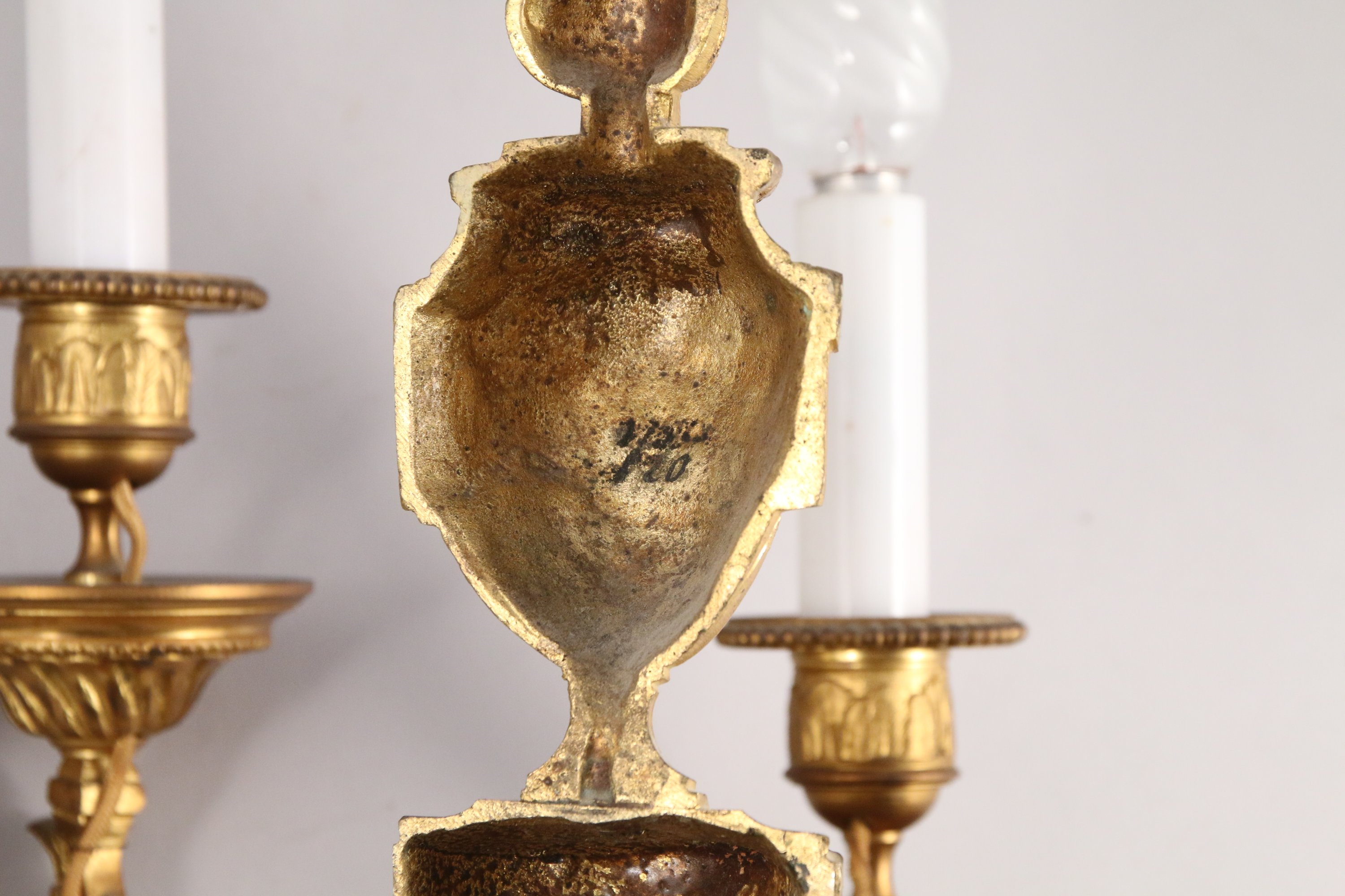 en bronze ciselé et doré. Bras de lumière à décor de feuilles dacanthe. Montant en gaine cannelée à asperges et guirlandes de laurier, surmonté dun pot à feu. Bobèches à bagues perlées.