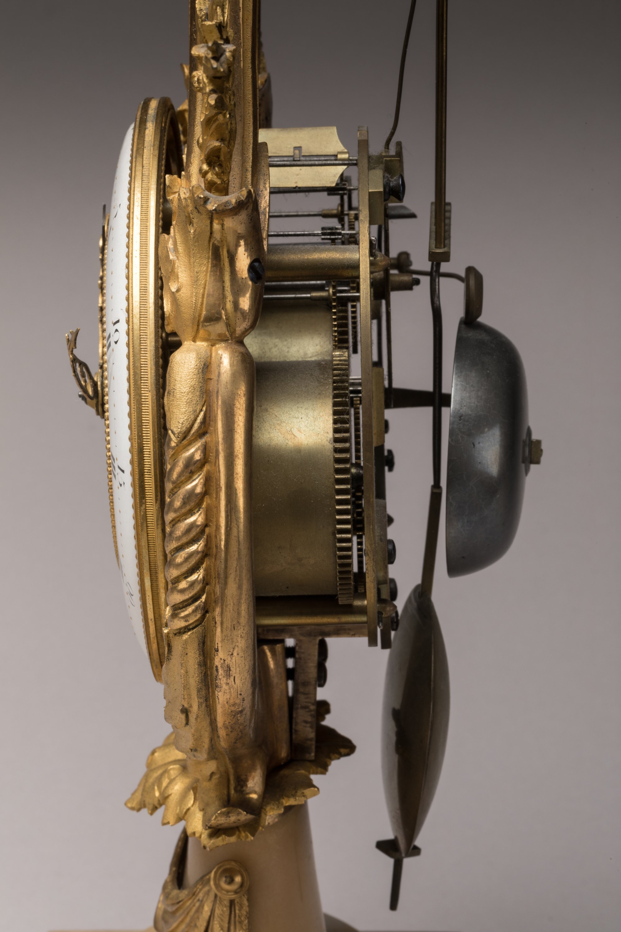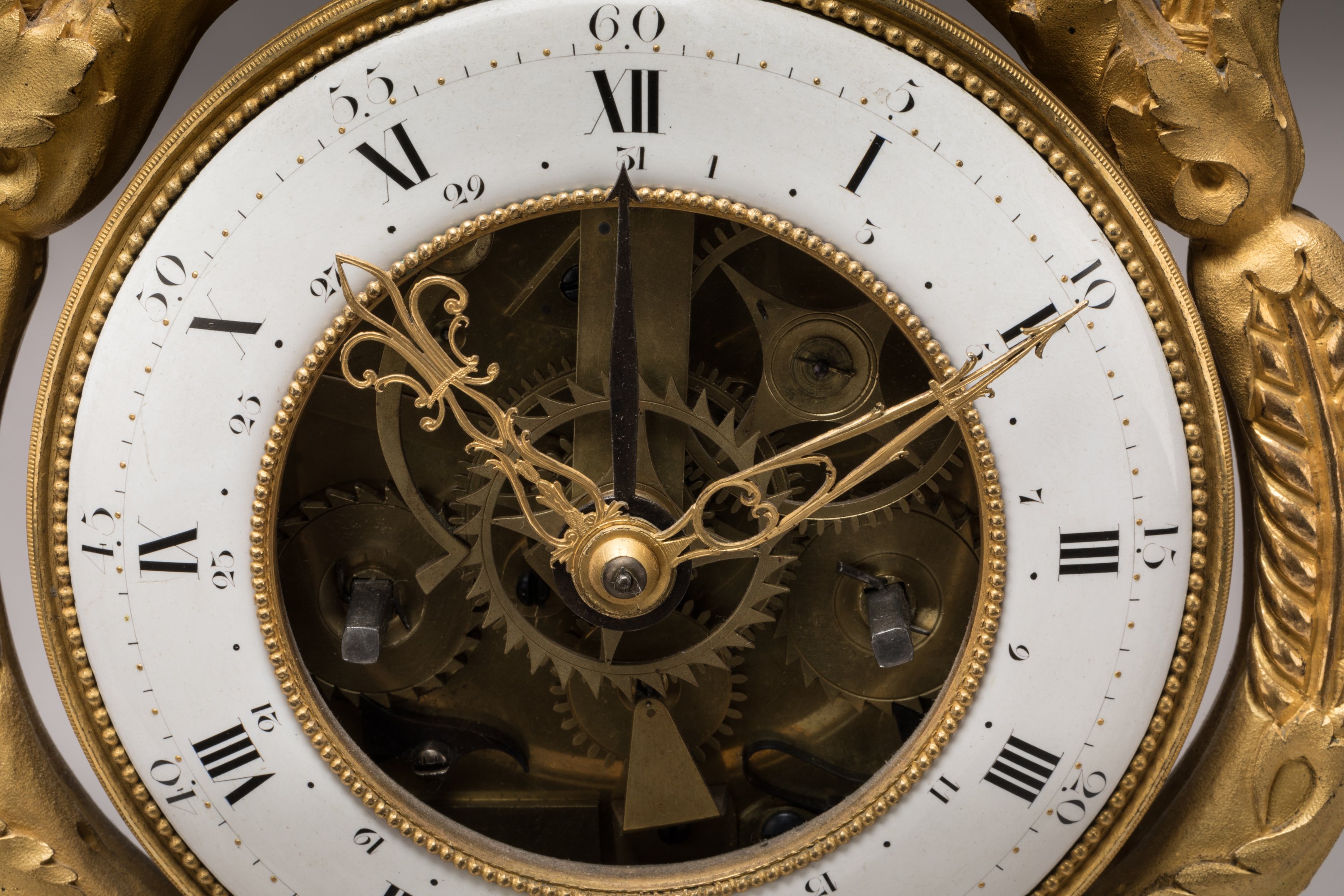 Cadran annulaire à quantièmes émaillé blanc, figurant les heures en chiffres romains et les minutes en chiffres arabes. Une aiguille en fer noirci indiquant le jour, les heures et les minutes indiquées par deux aiguilles ajourées dont l'une figure une fleur de lys.