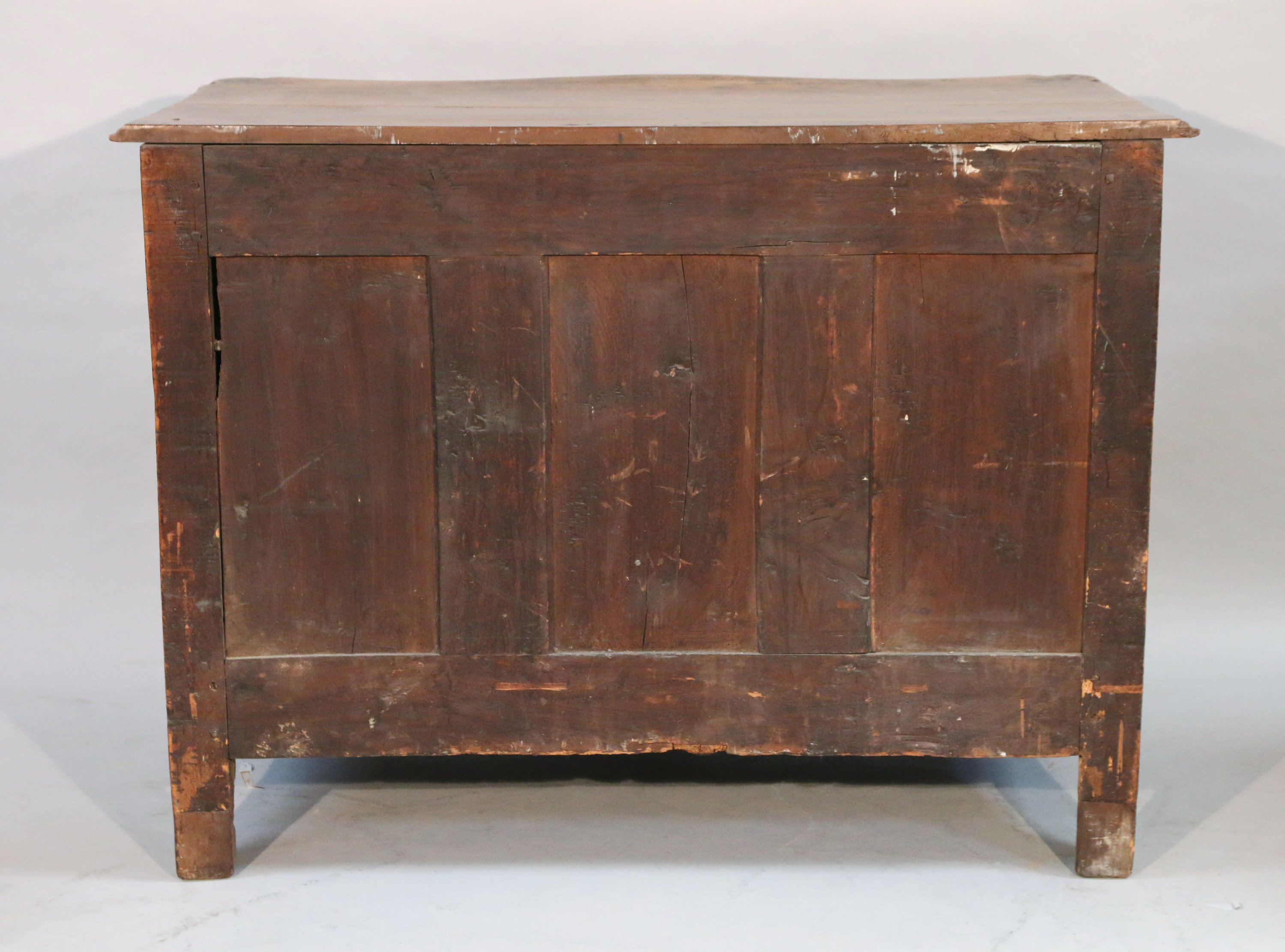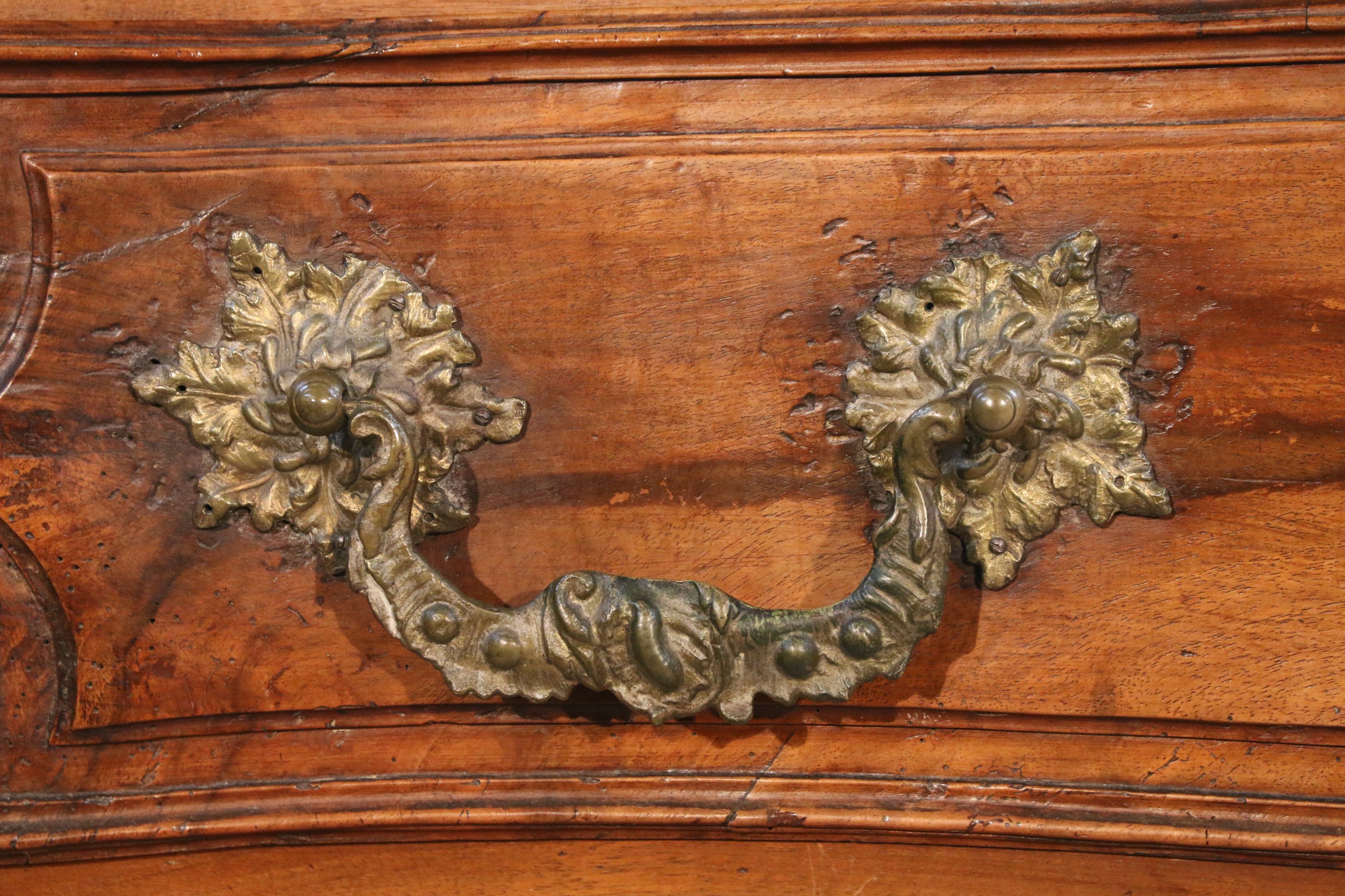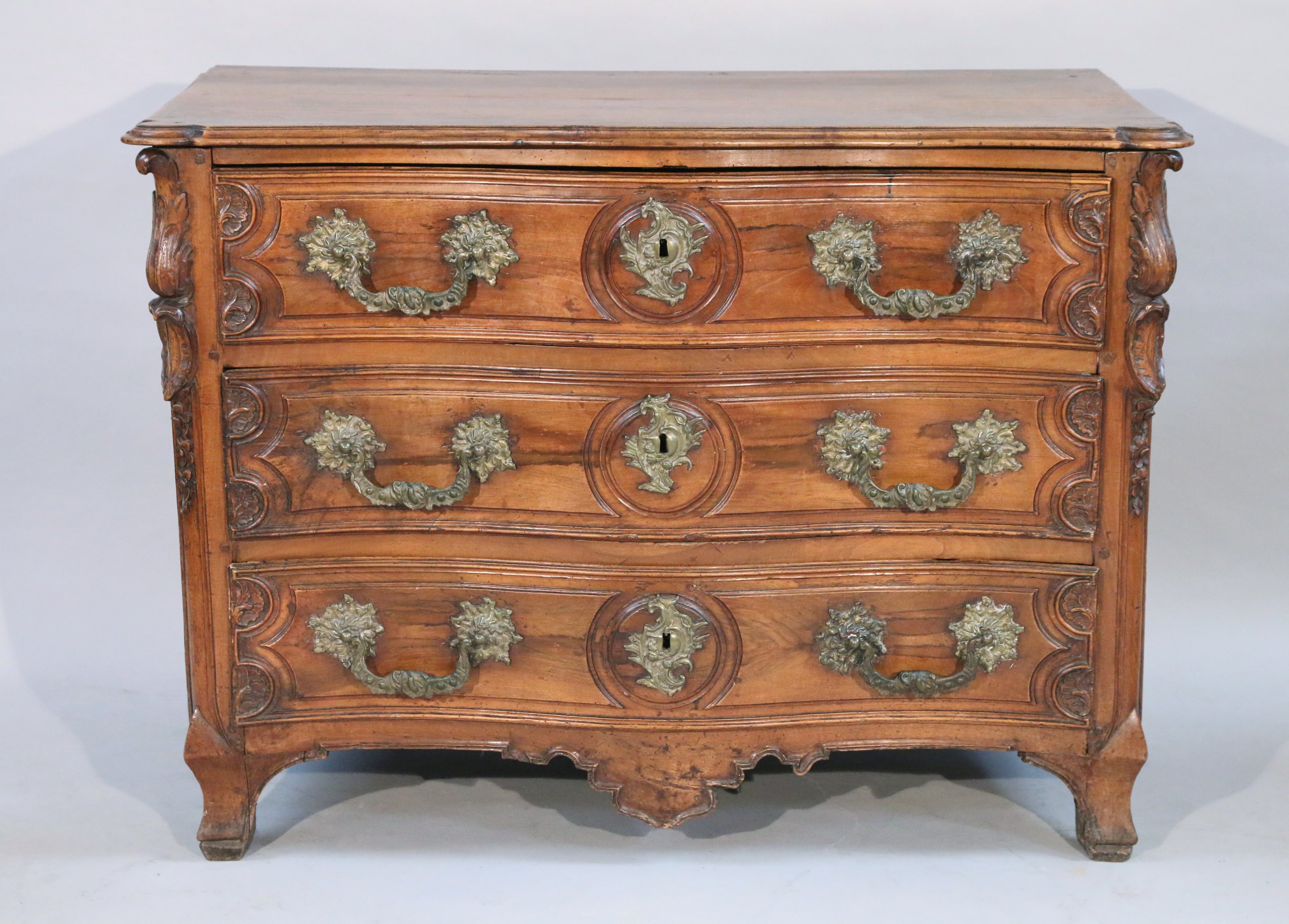 ouvrant par trois tiroirs sur trois rangs séparés par des traverses. Le tiroir supérieur cache un petit tiroir secret. Chaque tiroir est orné d'un médaillon central entouré aux extrémités par des demi-cerle dans lesquels sont inscrits des motifs de feuilles d'acanthe. Les chutes d'angle sont ornées d'importante feuilles d'acanthe formant console suivies d'une guirlande de fleurettes. Les pieds antérieurs sont légèrement courbes et postérieurs droits. Le dessus est coiffé d'un plateau de bois. Riche ornementation de bronze probablement rapportée tels qu'entrées de serrure et poignets de tirage mobile.
