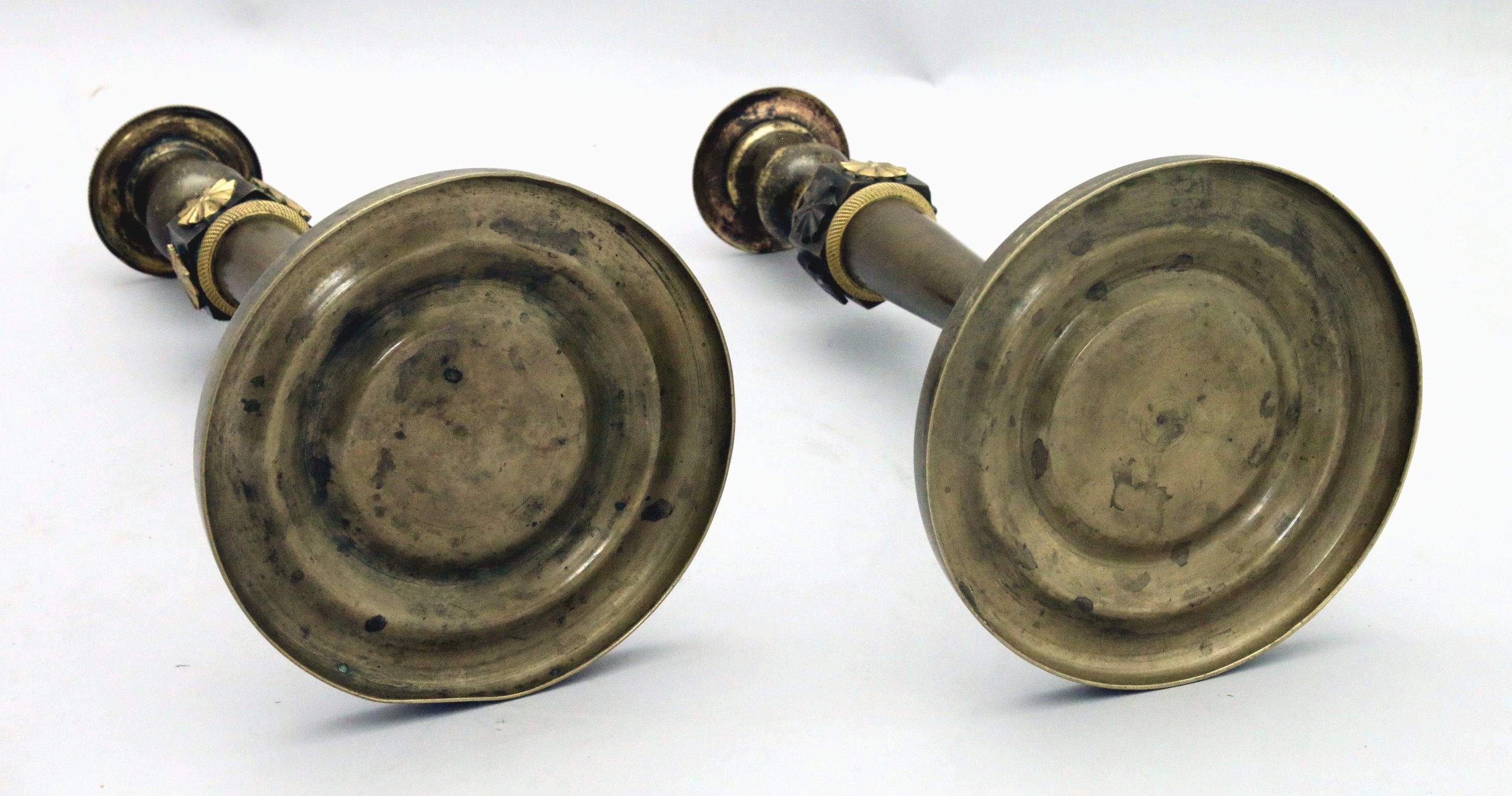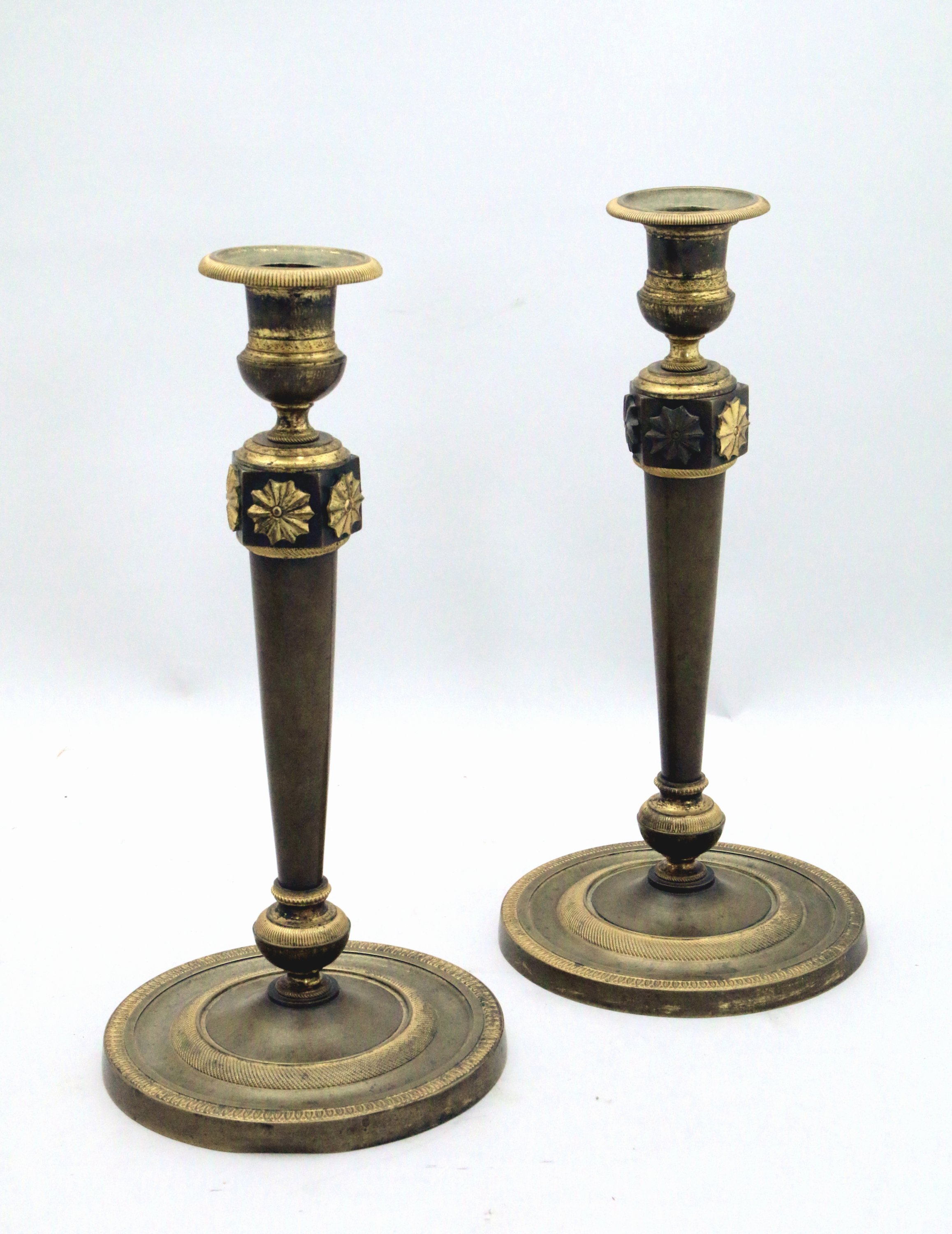 en bronze doré et bronze patiné. Le binet en forme de vase Médicis. L'extrémité du fût à cinq pans ornés d'étoiles. La base gravée de feuilles d'eau.