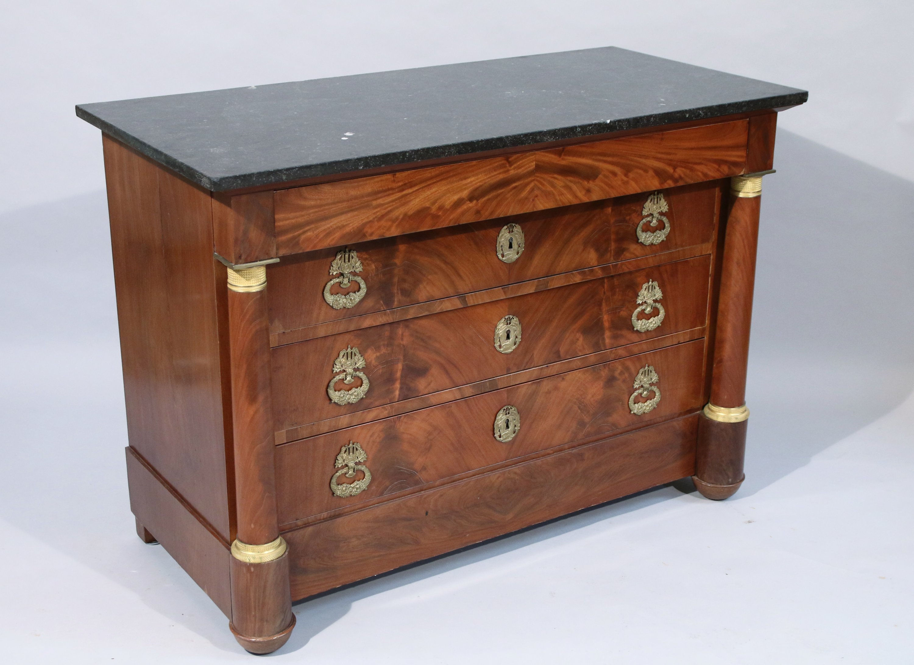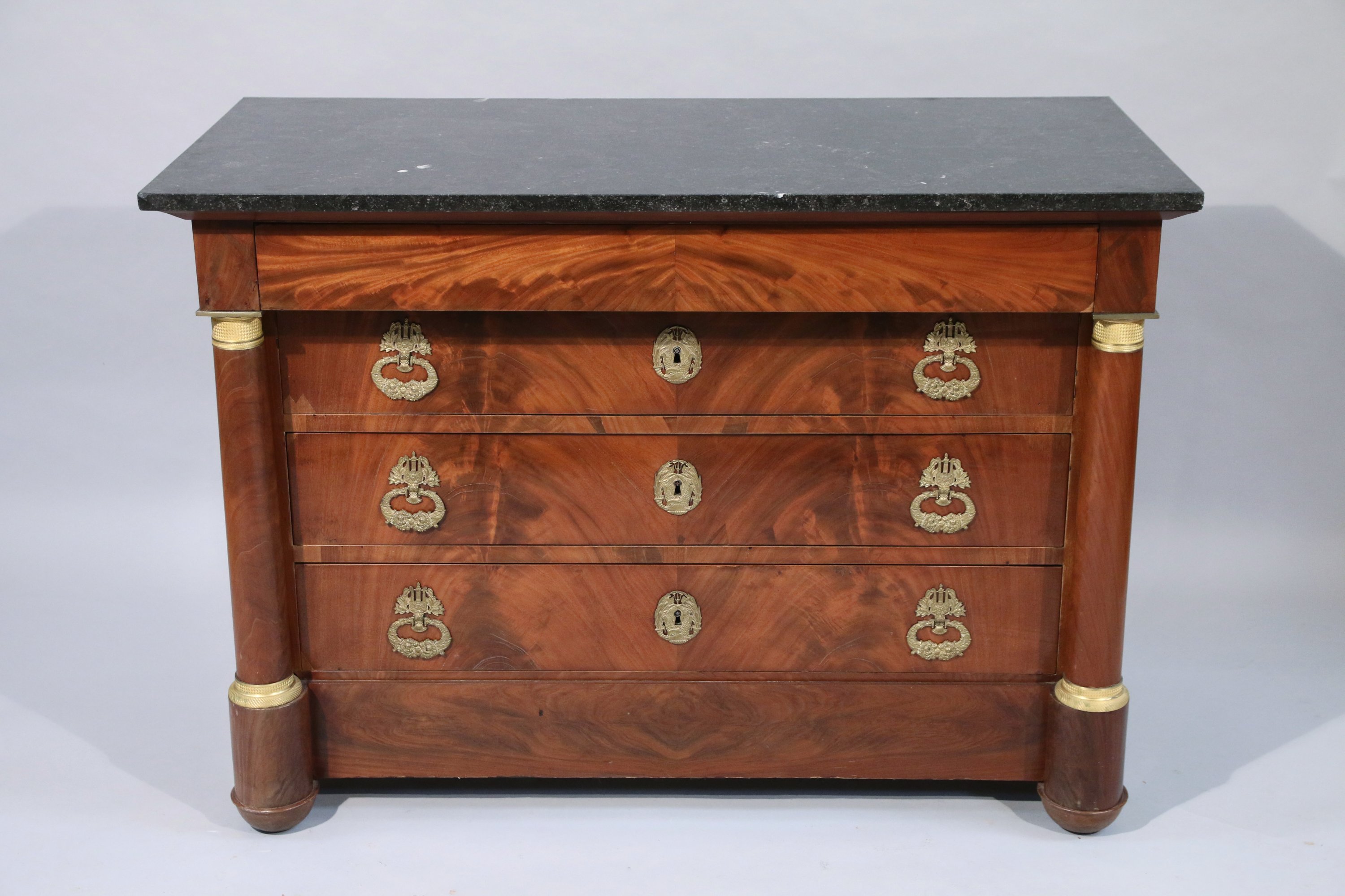en acajou et placage d'acajou, ouvrant par quatre tiroirs en façade et flanquée de deux colonnes détachées. Ornementations en bronze doré : poignées tombantes à motif d'une double corne d'abondance et lyre, entrées de serrures aux dauphins enlacés, frises géométriques aux colonnes. Serrures à trèfle. Coiffée d'un marbre noir.