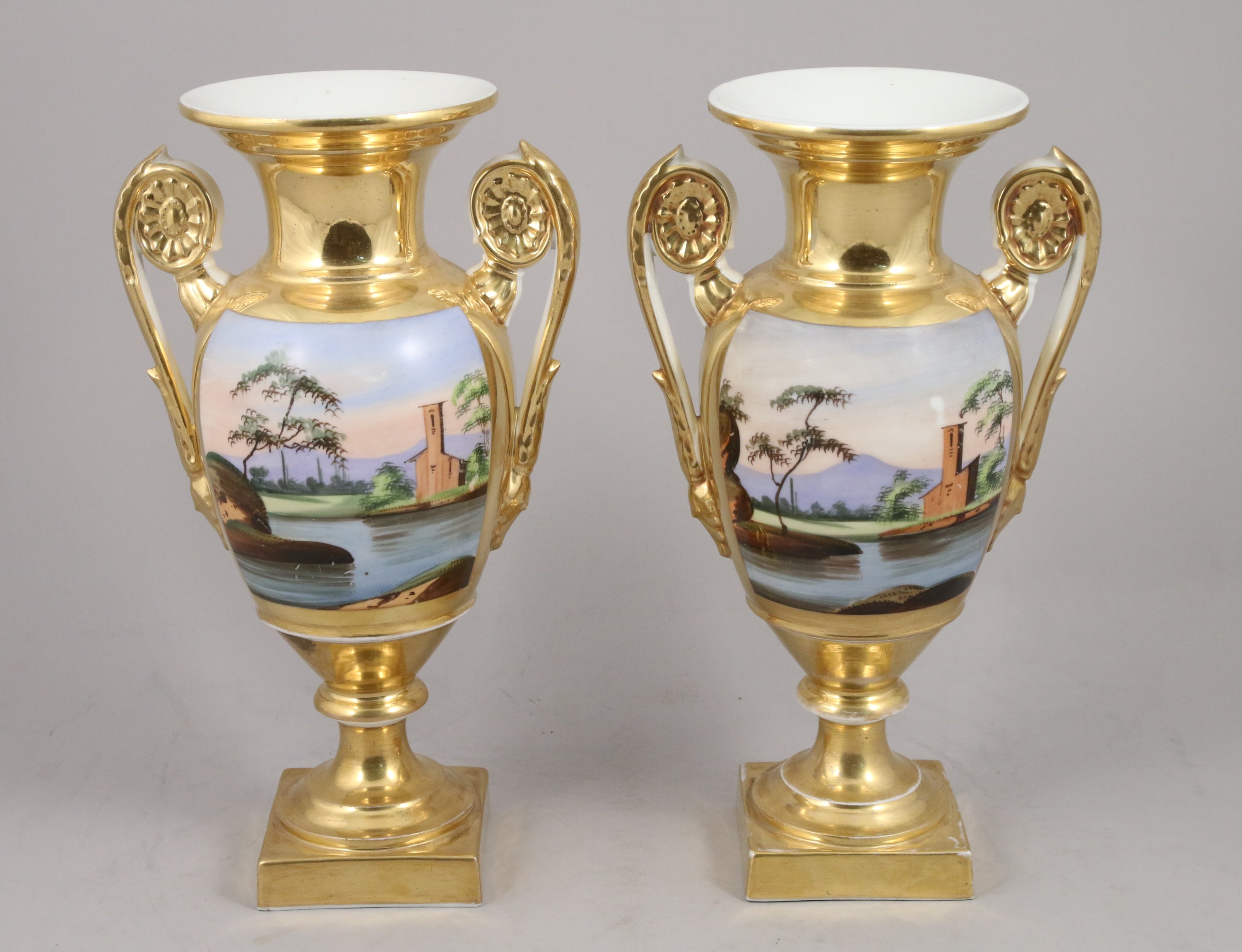 Décor sur fond or d'une scène de danse Napolitaine pour l'un et de deux Napolitaines conversant pour l'autre. Paysage à la tour sur l'autre face des deux vases. Anses à enroulement feuillagé terminé par une rosace. Piédouche reposant sur une base quadrangulaire.