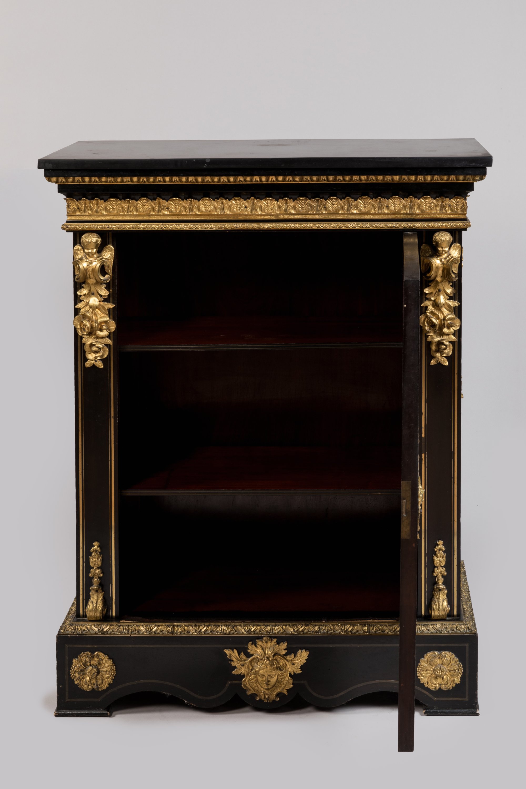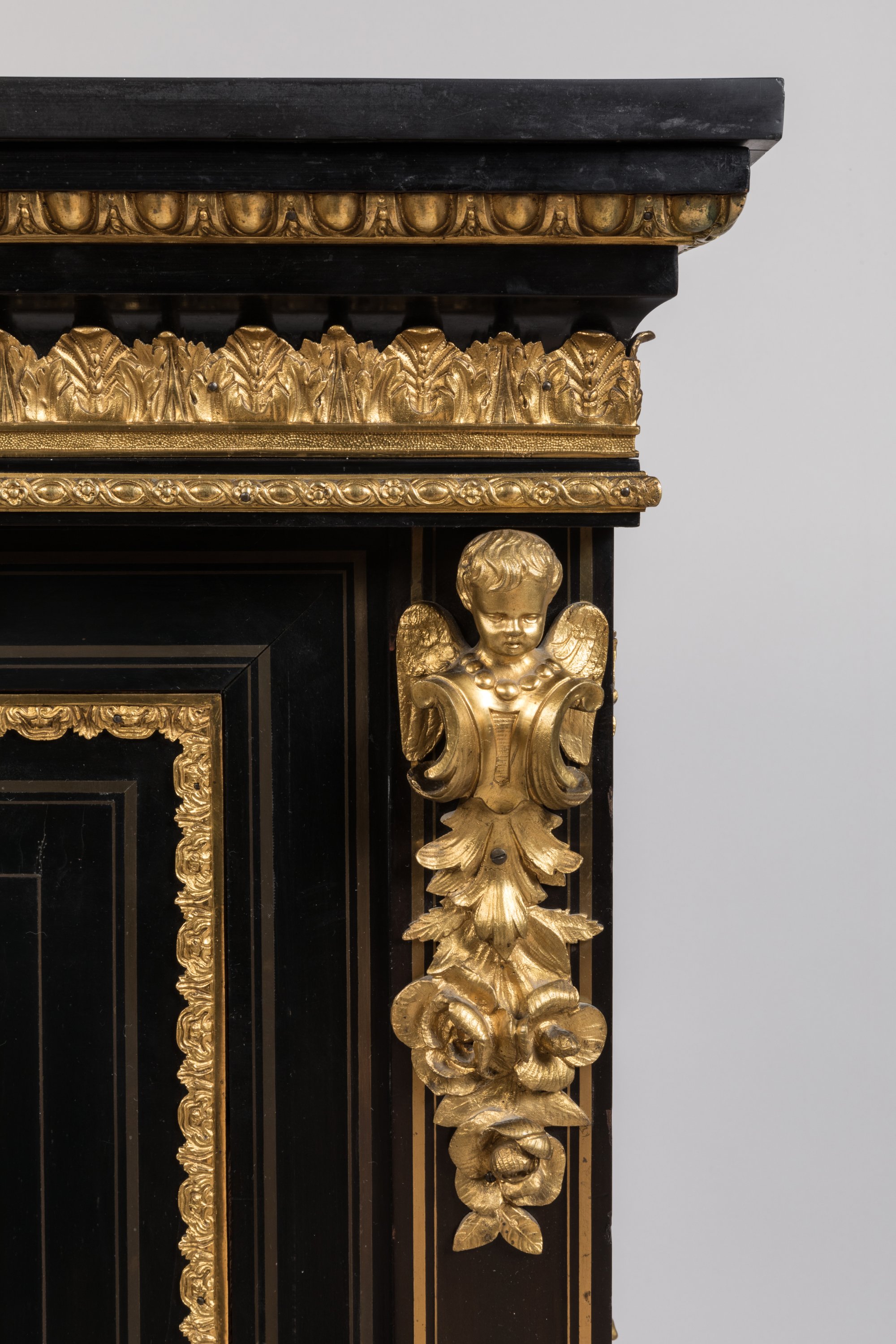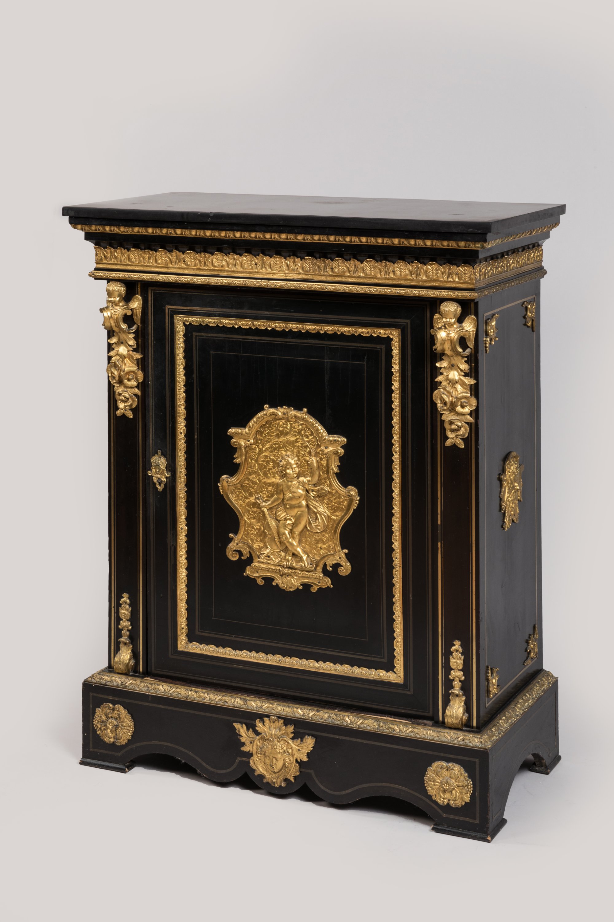 La partie supérieure garnie d'un plateau en pierre noire. Le meuble ouvre par une porte présentant une applique en bronze doré figurant un ange musicien. Il repose sur une plinthe au mascaron et aux rosaces fleuries en bronze doré. Riche ornementation avec encadrements de frises d'acanthe, entrée de serrure, frises d'oves et fleurons et chutes d'angles aux bustes d'angelots en bronze ciselé et doré.