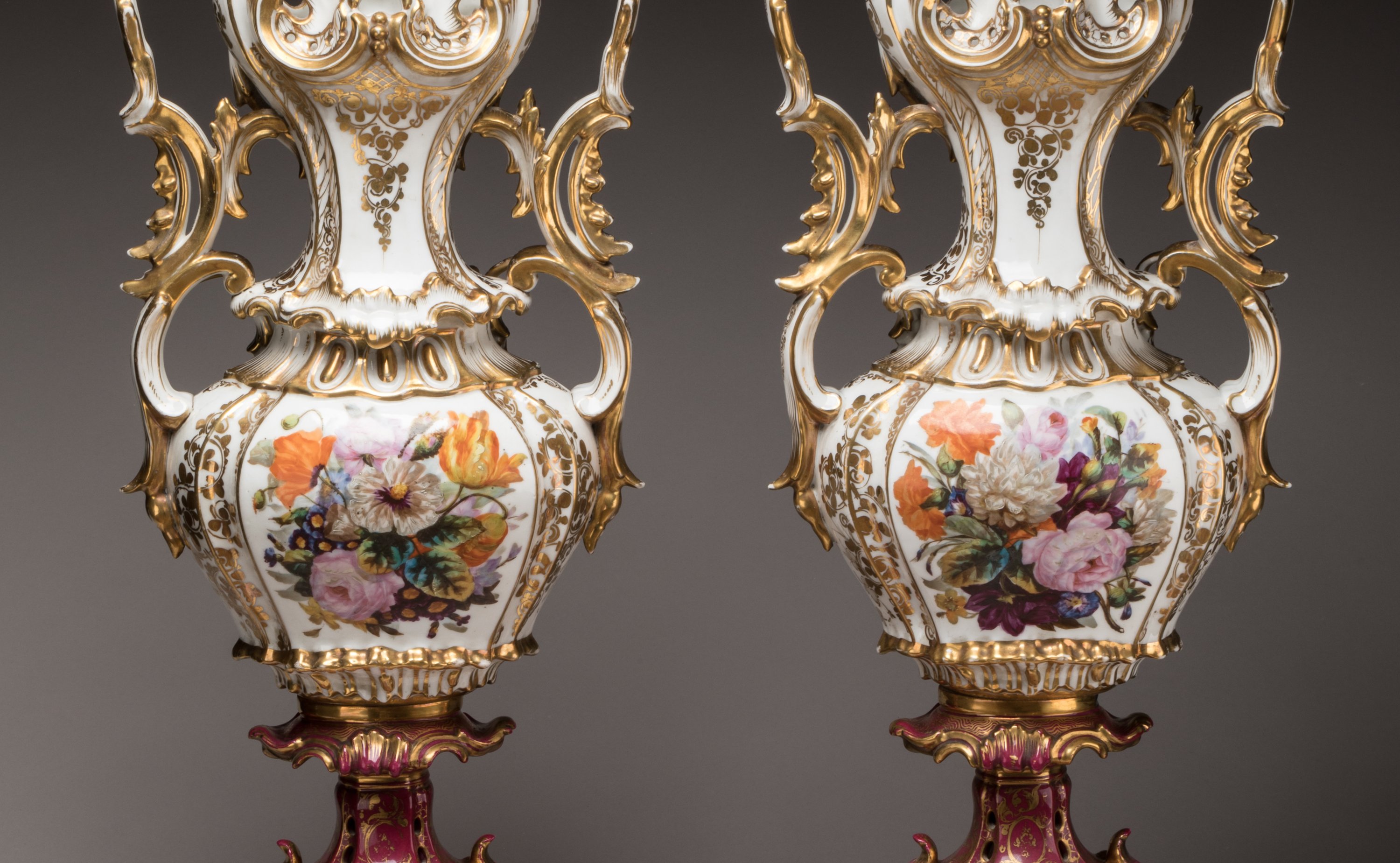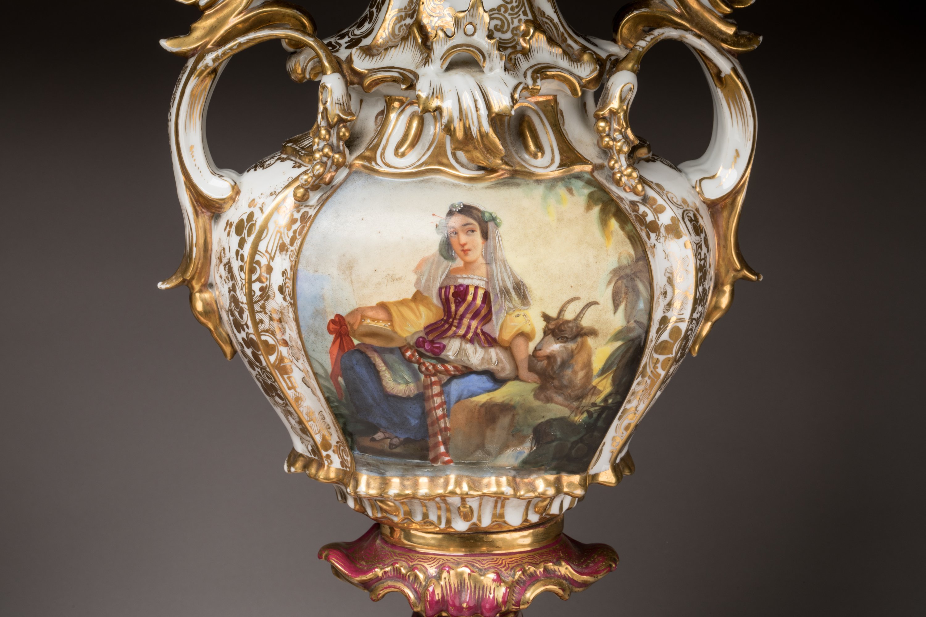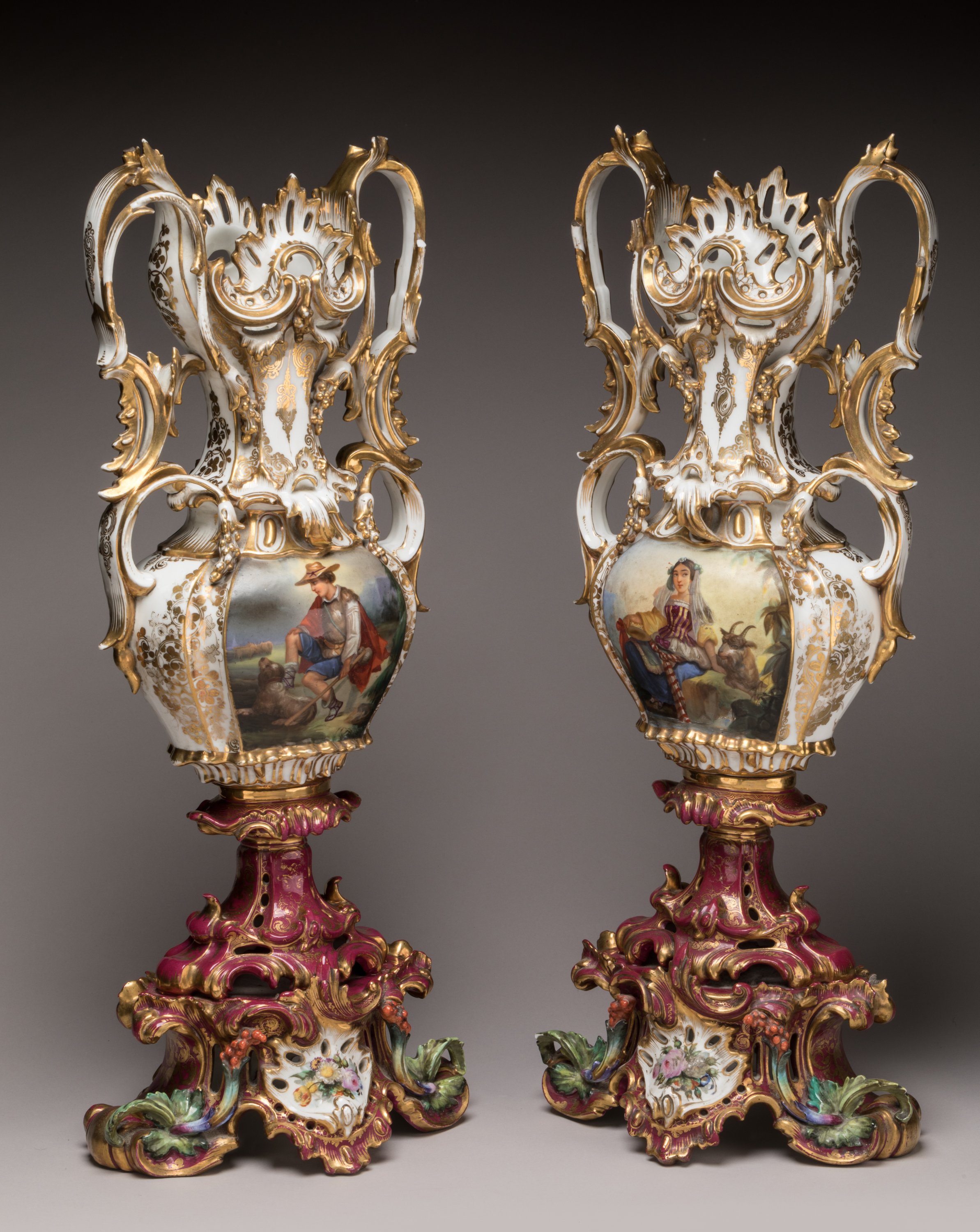 De forme rocaille exubérante, ils présentent un riche répertoire ornemental ajouré de volutes, acanthes et graines. La panse est peinte de scènes pastorales, figurant un berger, pour le premier, et une bergère, pour le second. Un fin bouquet de fleurs au verso. Base à fond framboise reposant sur deux larges pieds à enroulement.