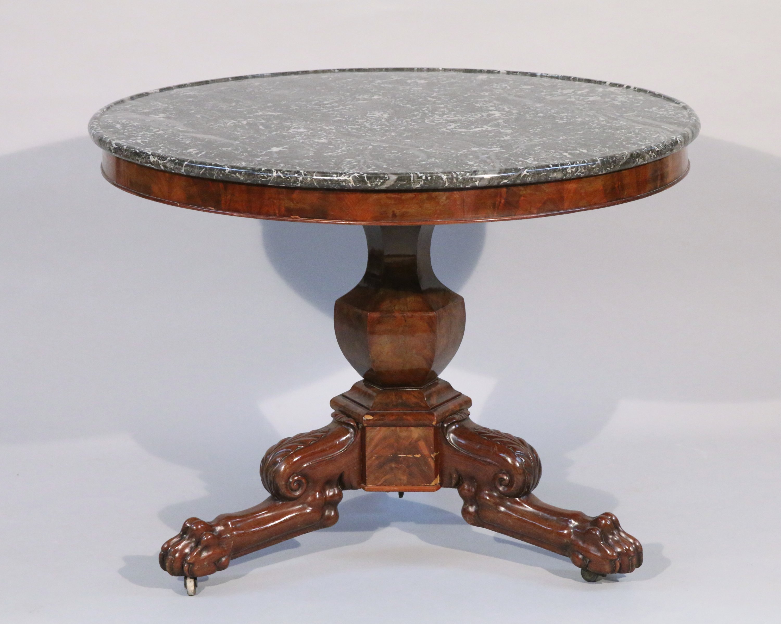 GUÉRIDON circulaire en placage d'acajou, le fût hexagonal de forme...