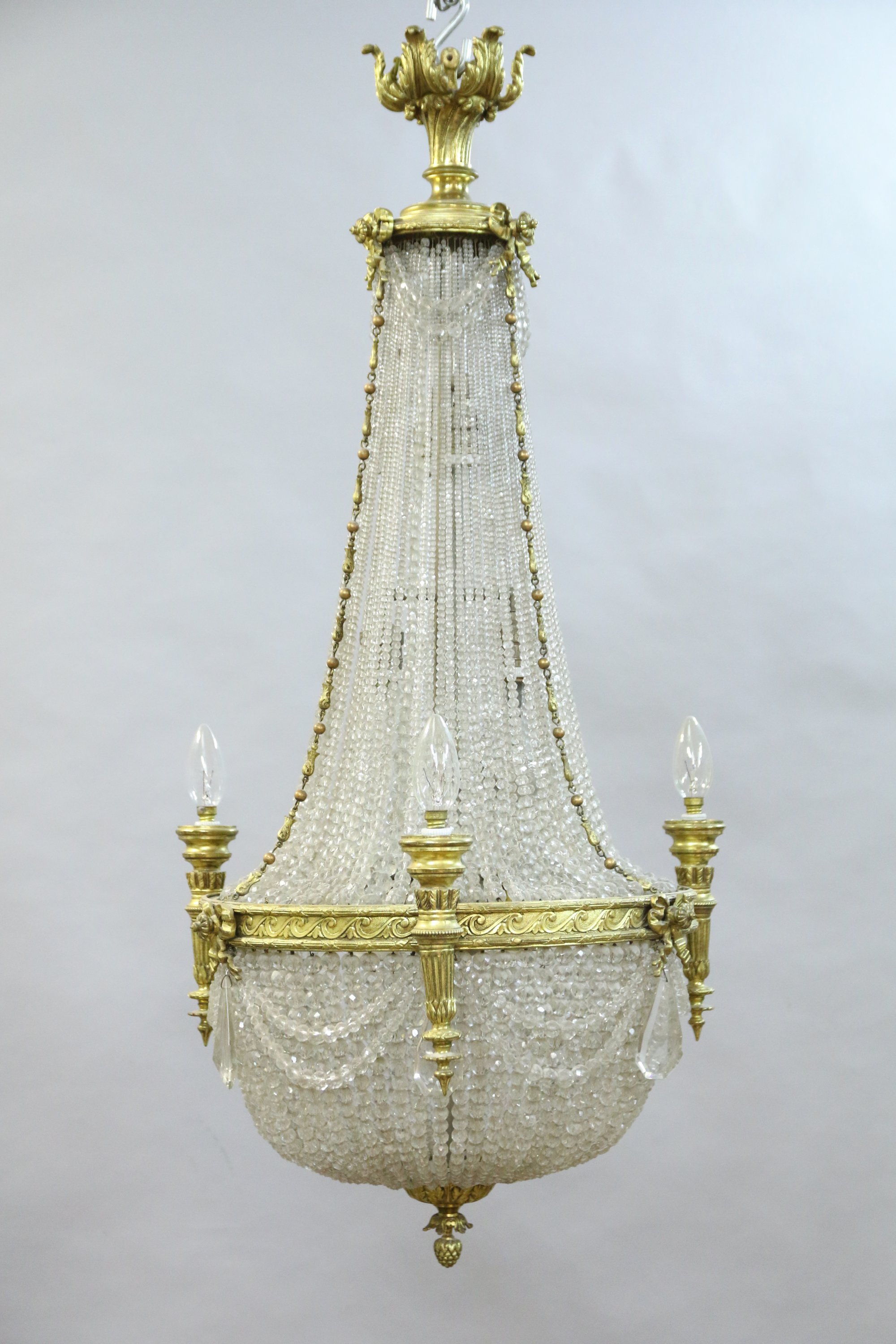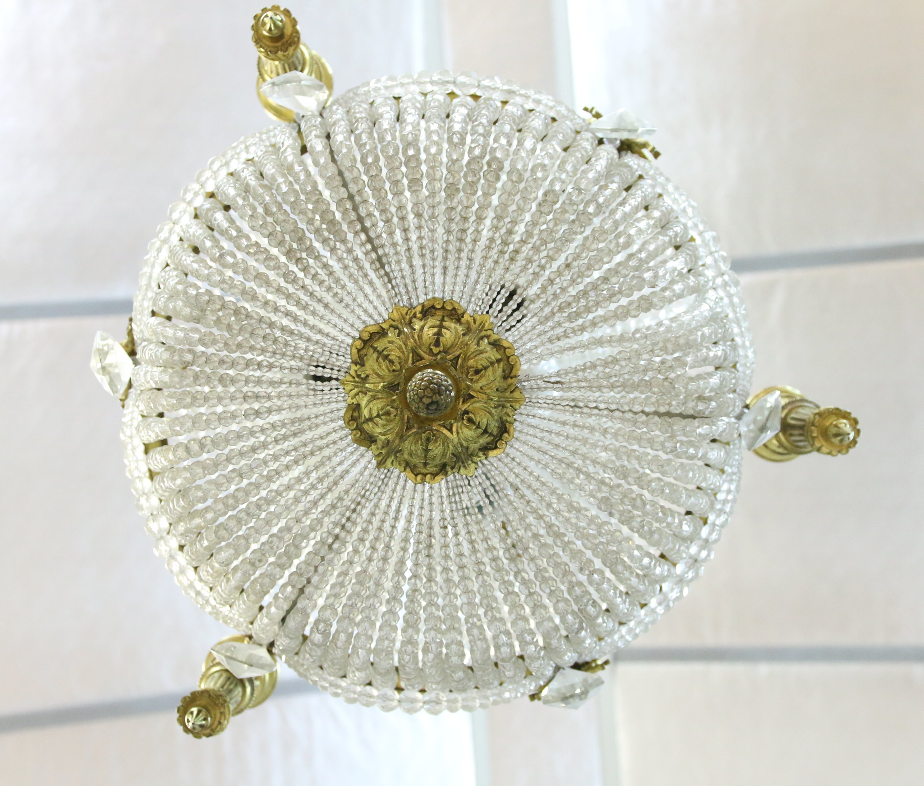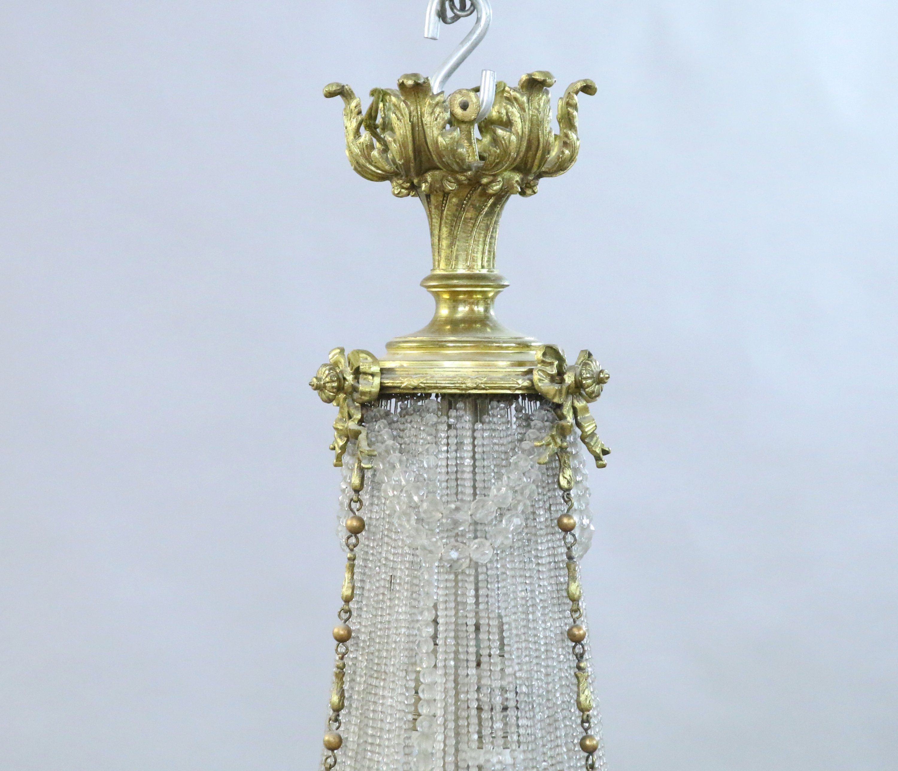 en bronze doré et ciselé à pendeloques de cristal. La petite couronne à décor de feuilles d'acanthe, la grande à motif de vaguelette. Huit feux dont trois sur la couronne et cinq inscrit dans l'armature. Électrifié pour 5 ampoules.