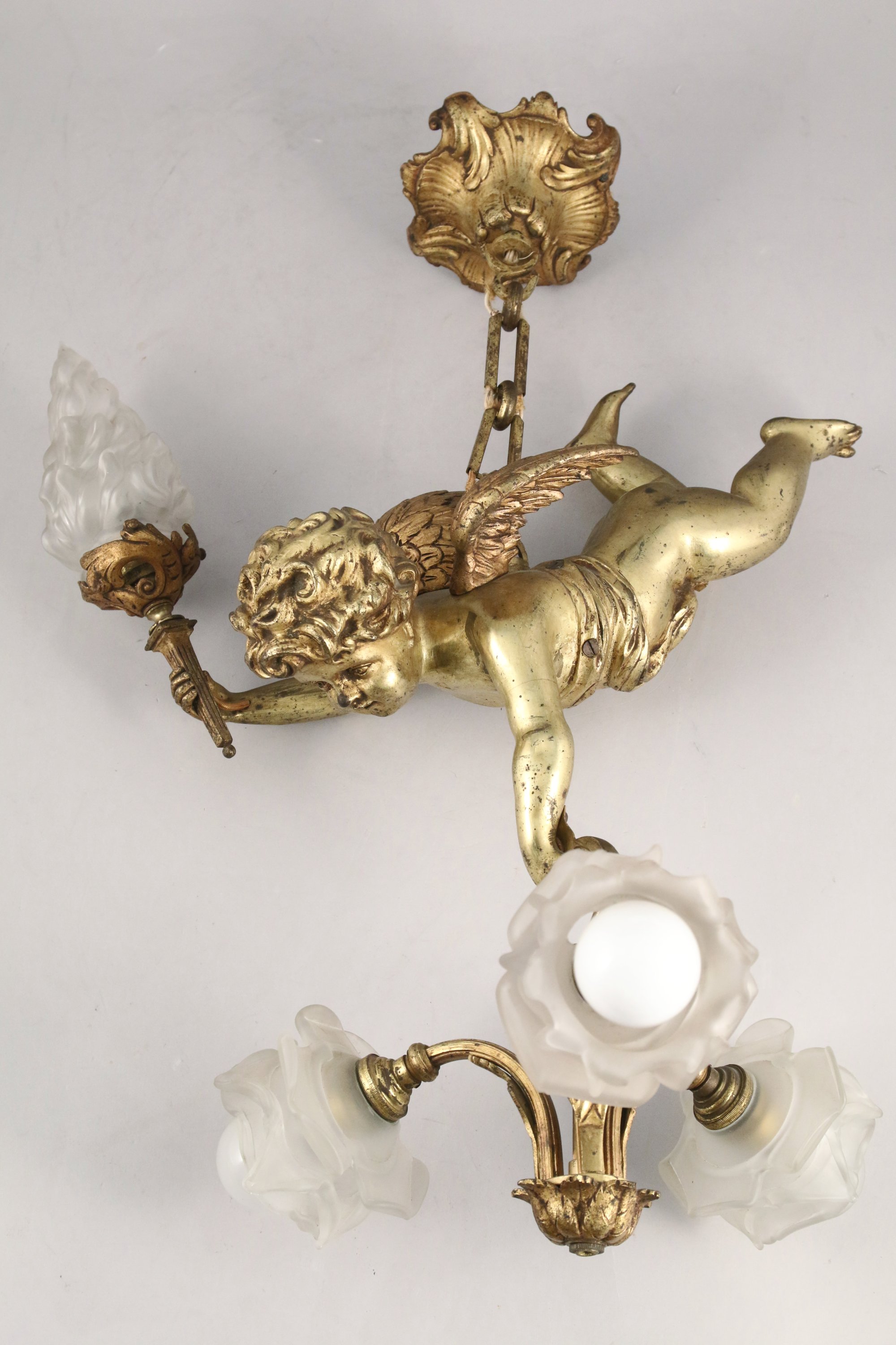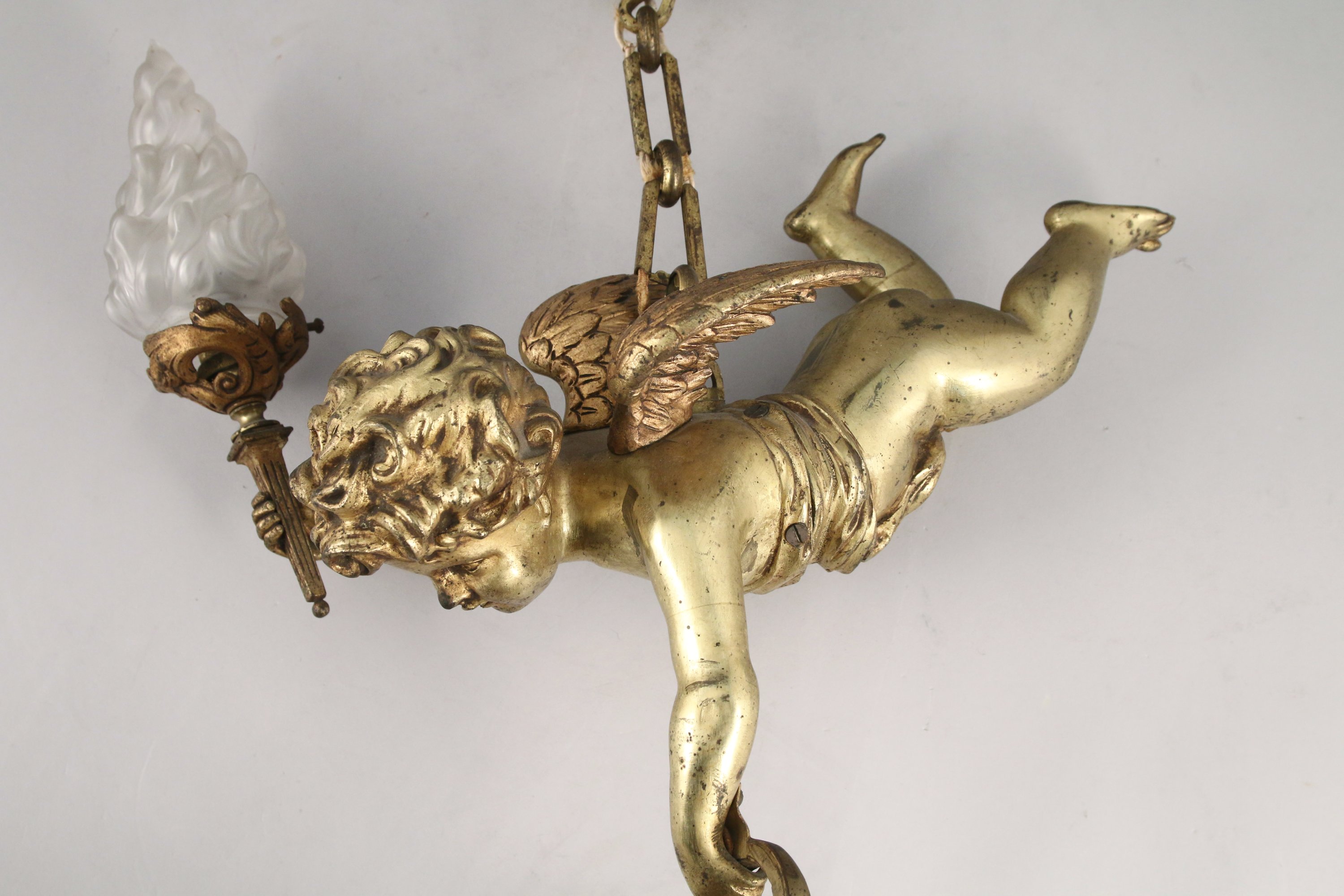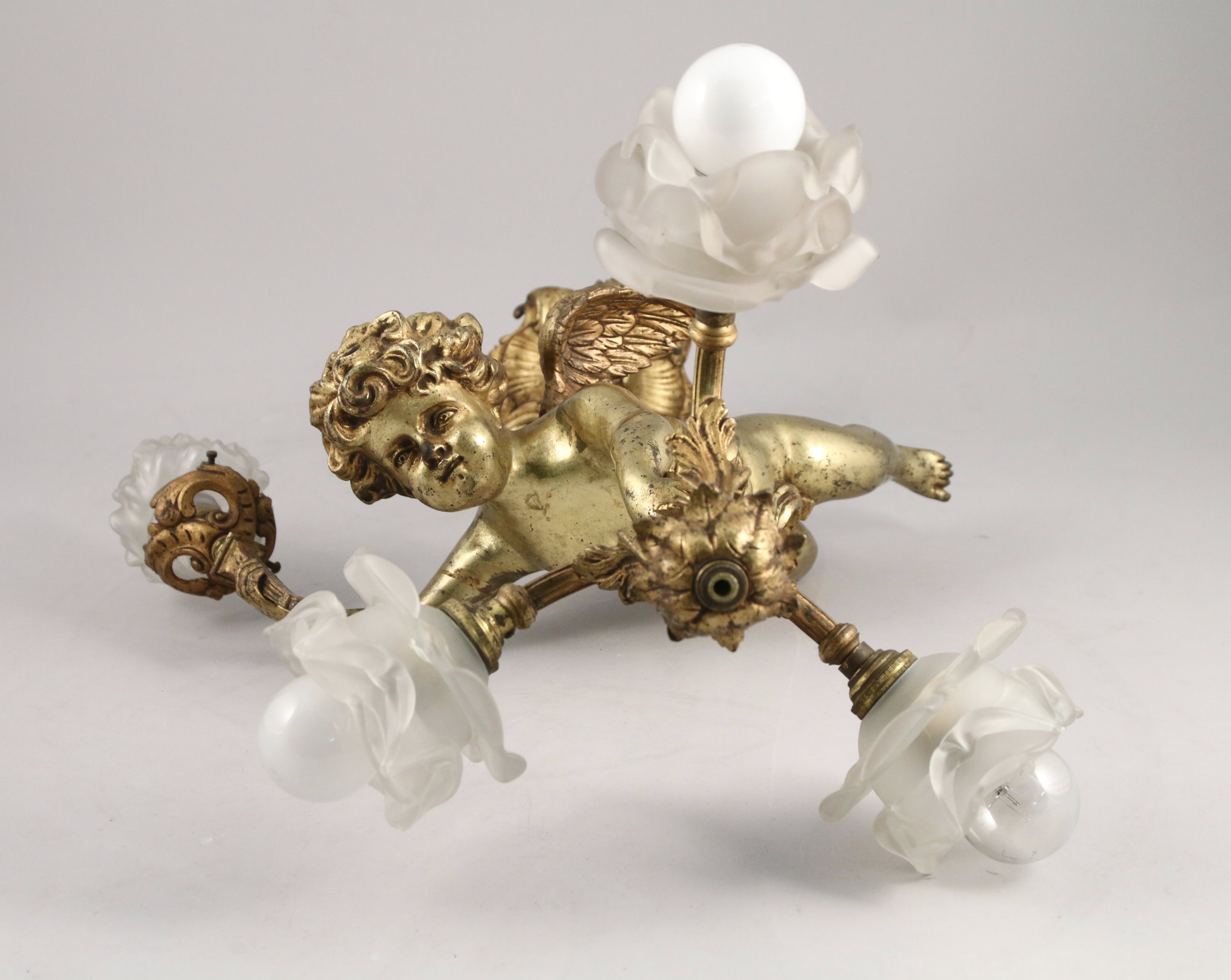 en bronze doré. Il tient de sa main gauche une corbeille à décor de feuilles d'acanthe d'où ressort trois bras de lumière et de sa main droite un flambeau. La rosette à décor végétal.