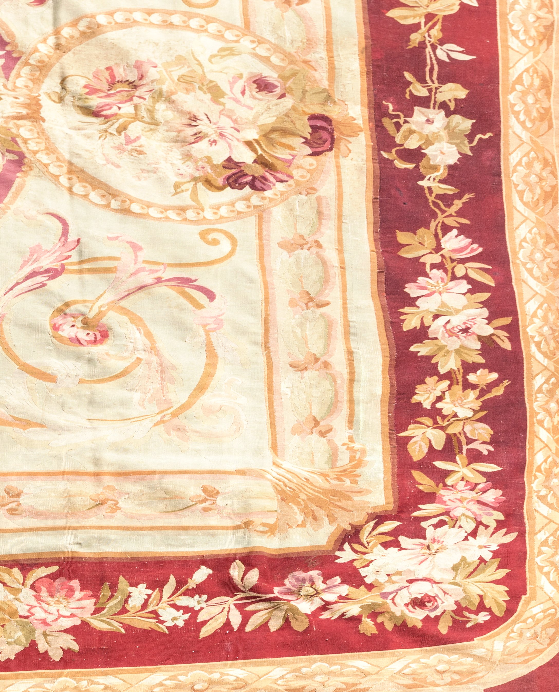 La manufacture d'Aubusson pousse à l'excellence la technique du point ras, reprenant la technique de la tapisserie, qui fait son renom. Au XIXe siècle, la surface des pièces est entièrement couverte par un textile, ce qui explique l'exceptionnelle superficie de plus de vingt-cinq mètres carrés de notre tapis, probablement réalisé sur mesure pour le salon d'apparat d'un hôtel particulier parisien ou d'un château en province, dont les tons sont assortis aux délicates couleurs de bouquets de roses.