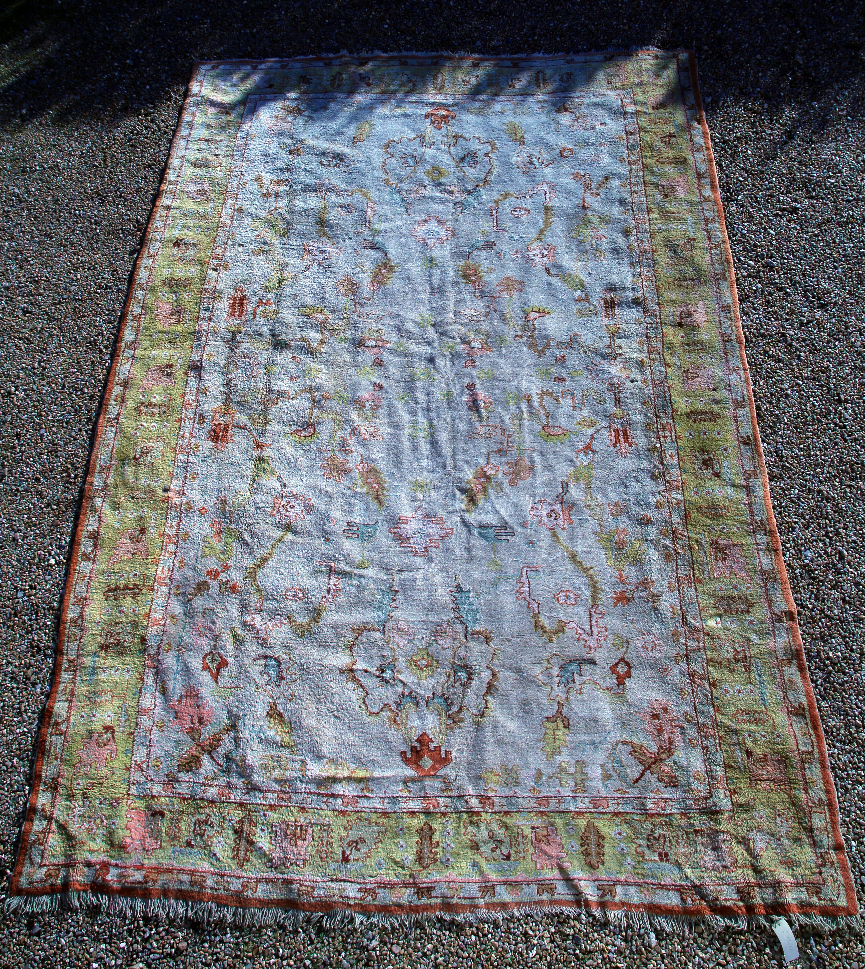 OUCHAK ou SMYRNE. TAPIS à fond crème, décor sans médaillon, de gerbes de fleurs et fougères, bordure vert pistache de fleurs entre des galons.