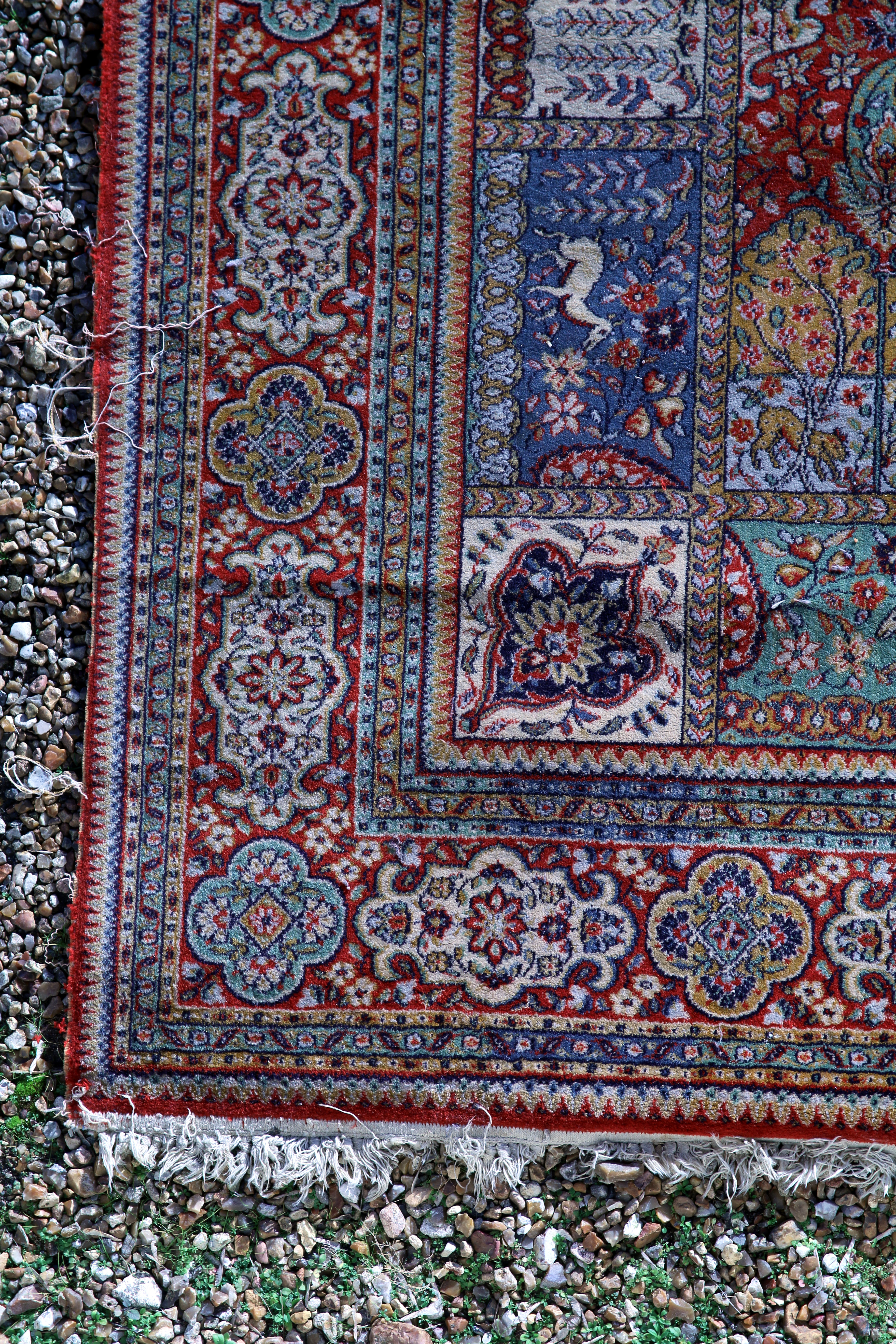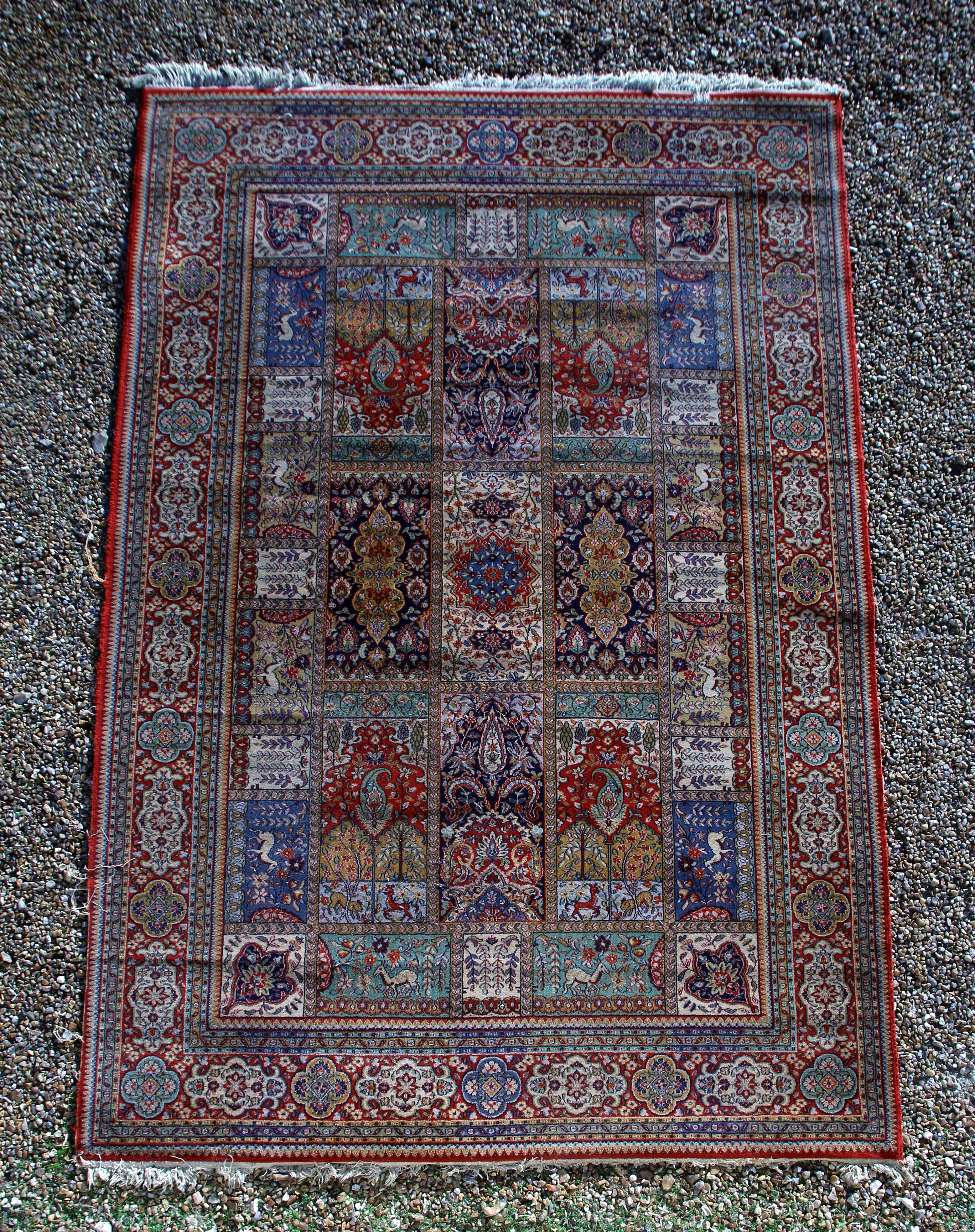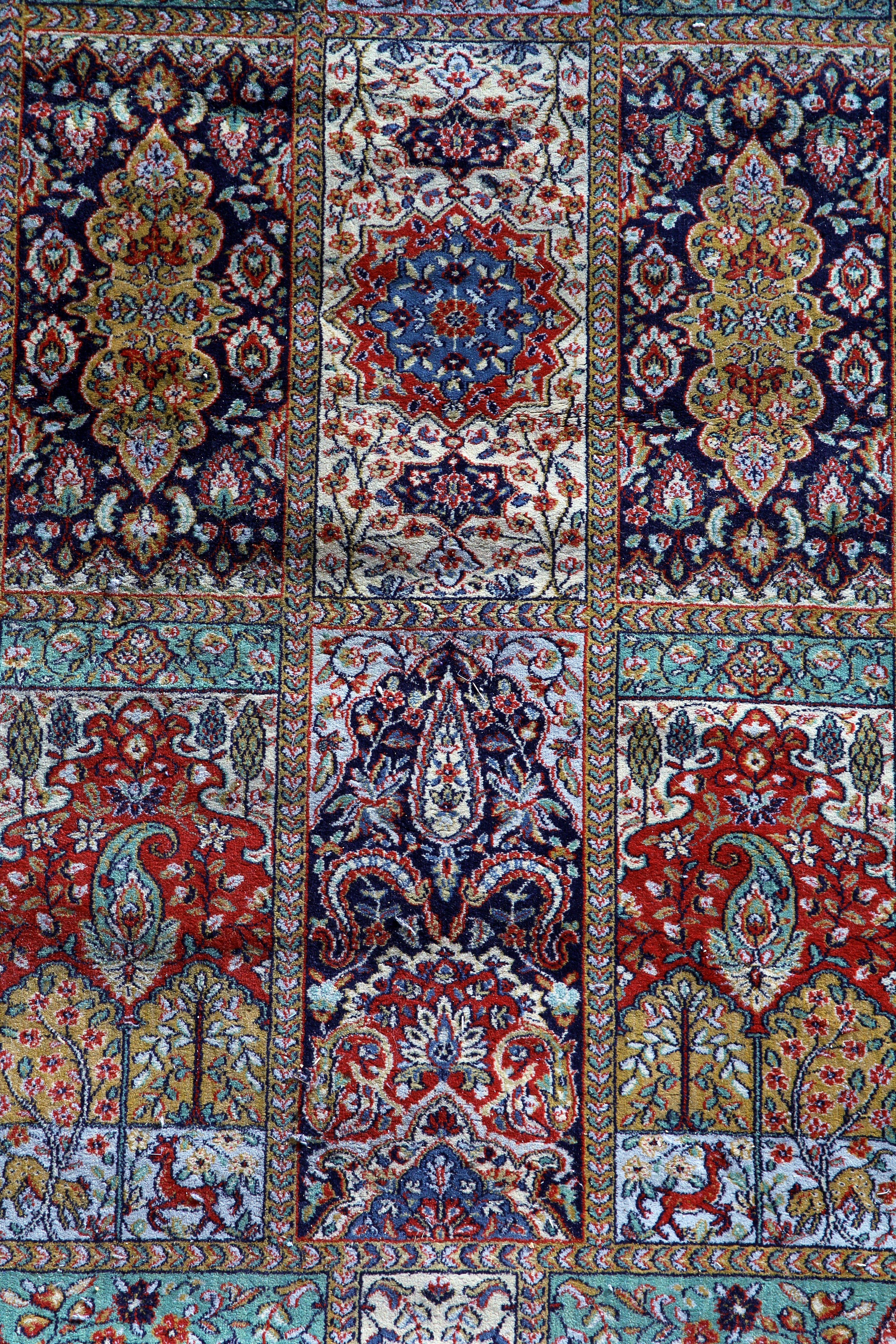 Tapis mécanique à décor "jardin"de cyprès et animaux dans des réserves quadrangulaires, bordure rouge de médaillons