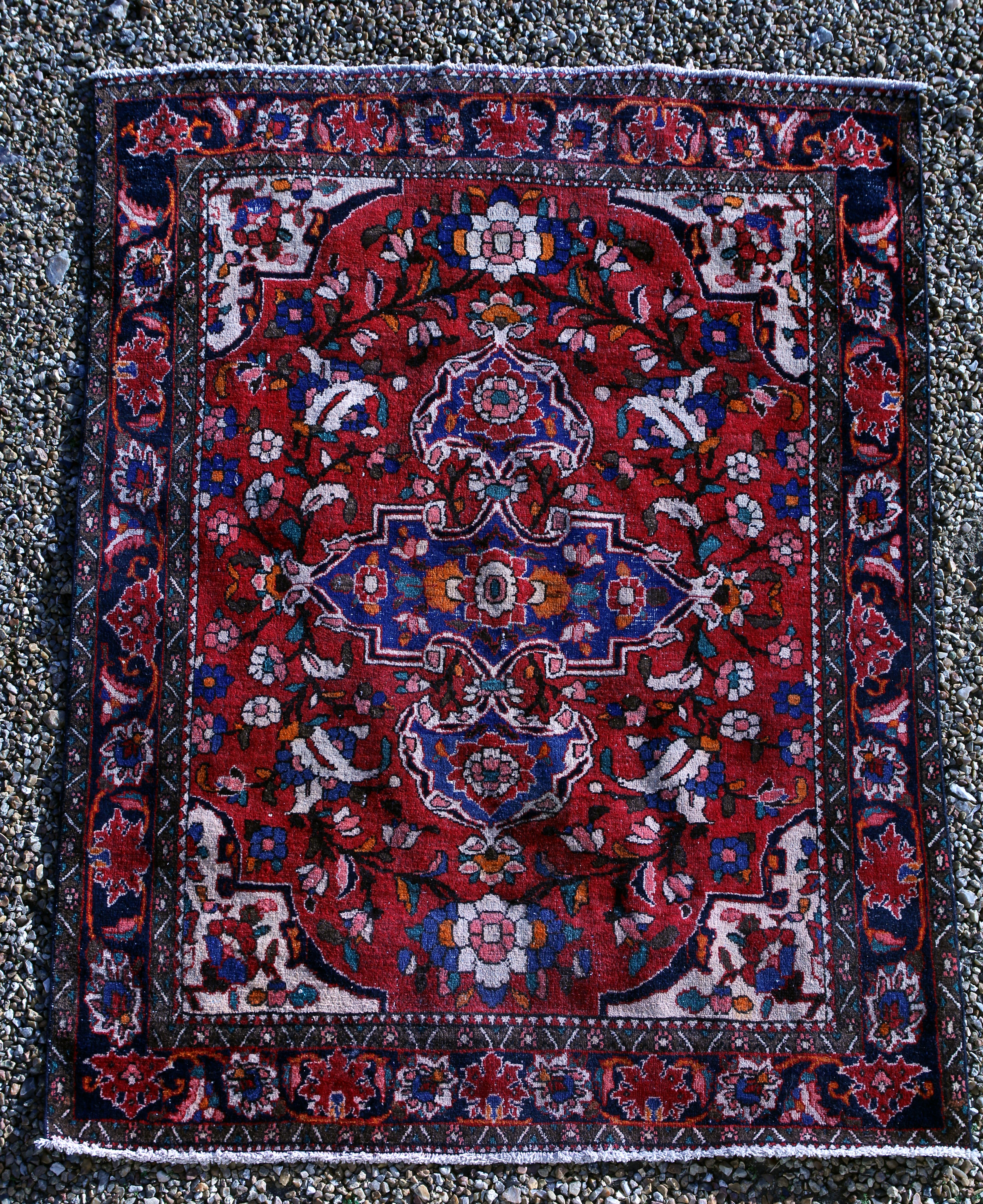 Tapis Baktyar, fond rouge, décor d'un médaillon rhomboïdal bleu dans des tiges fleuries, écoiçons crème, bordure bleu nuit de guirlandes de fleurs, entre des galons.