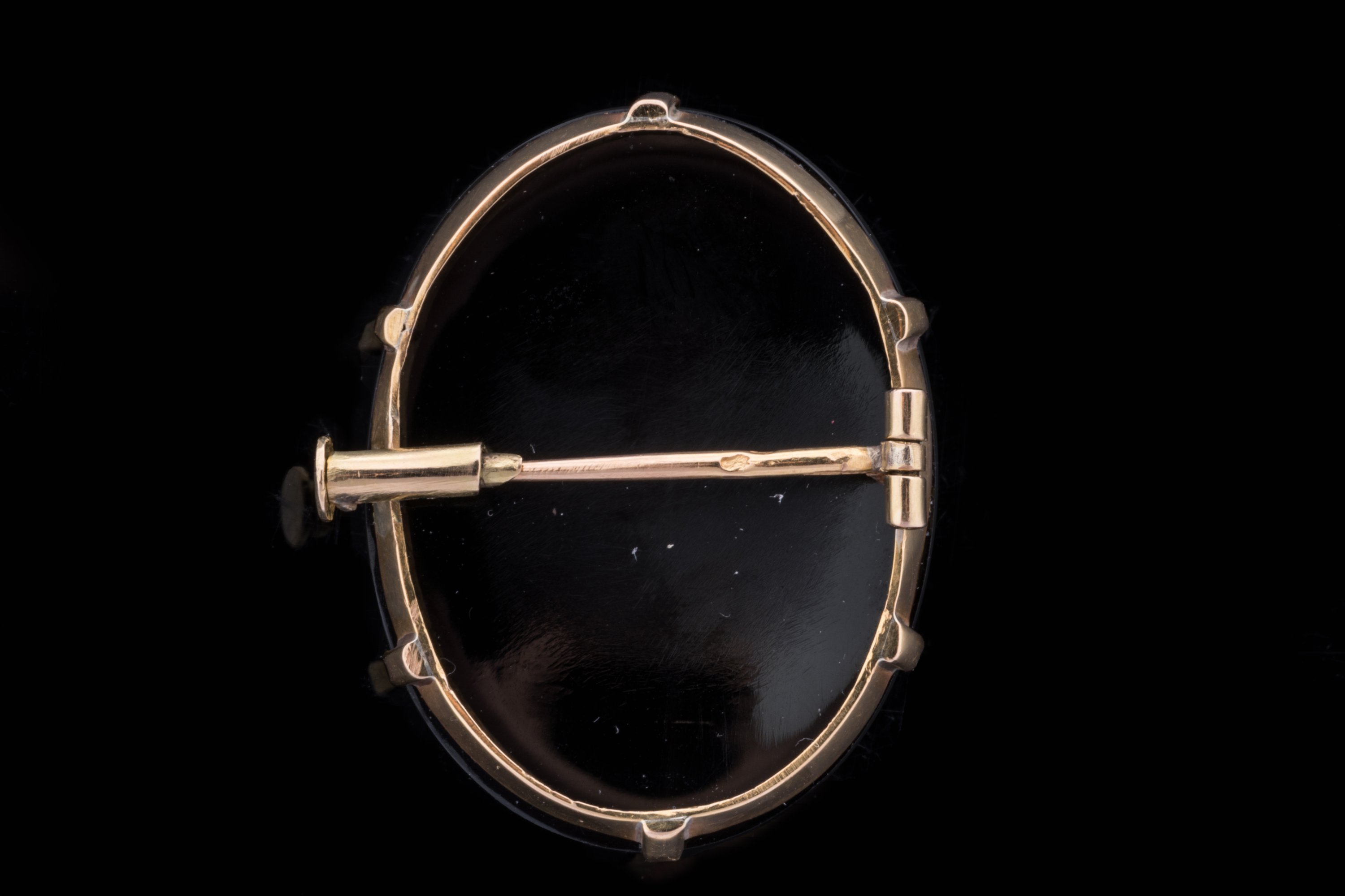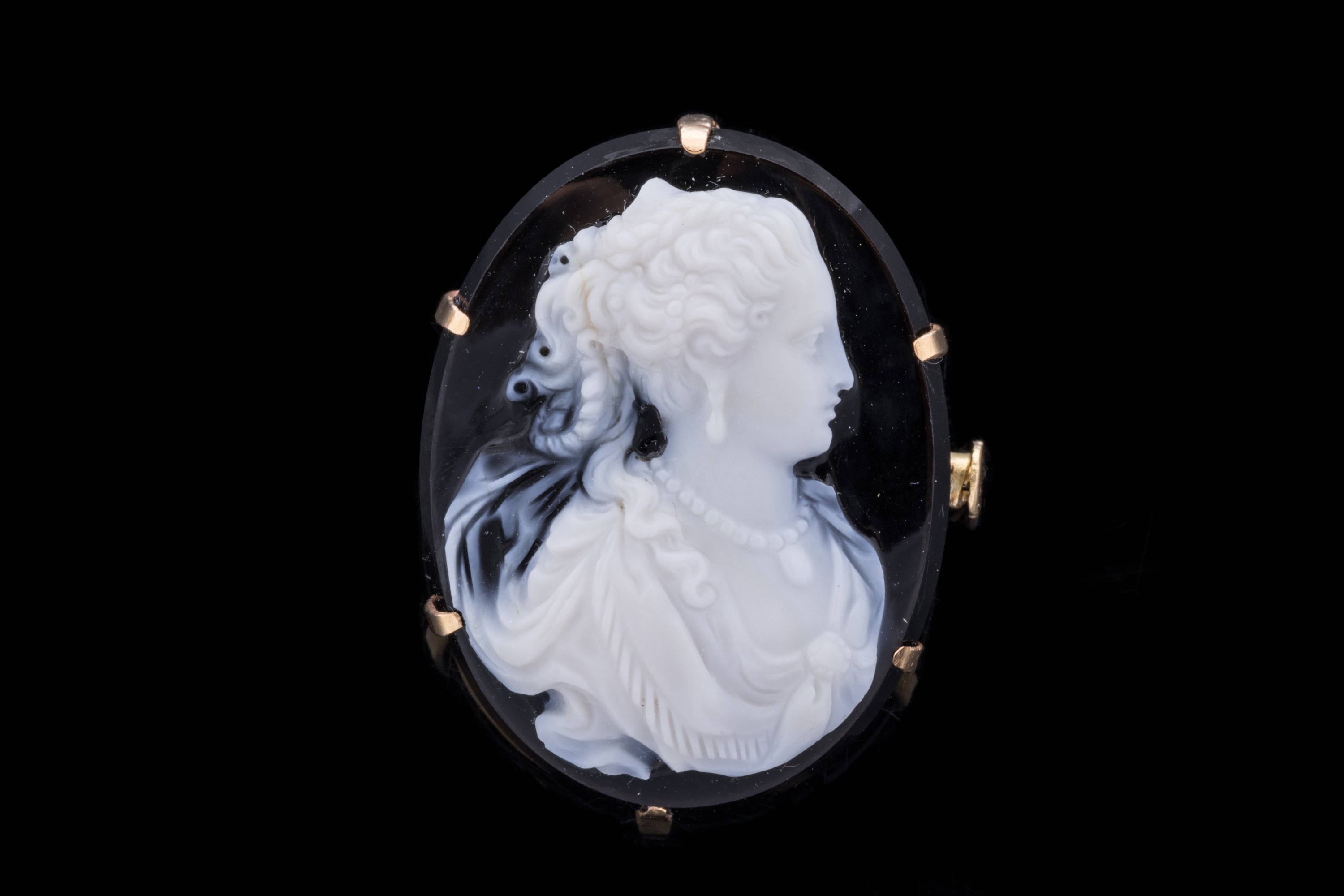CAMÉE sur ONYX de forme ovale représentant un PROFIL FÉMININ à la mode du XVIIIe siècle aux voiles légers et paré de bijoux tels que boucles d'oreilles ou collier de perles. Monture broche en or tenant le camée par six griffes.