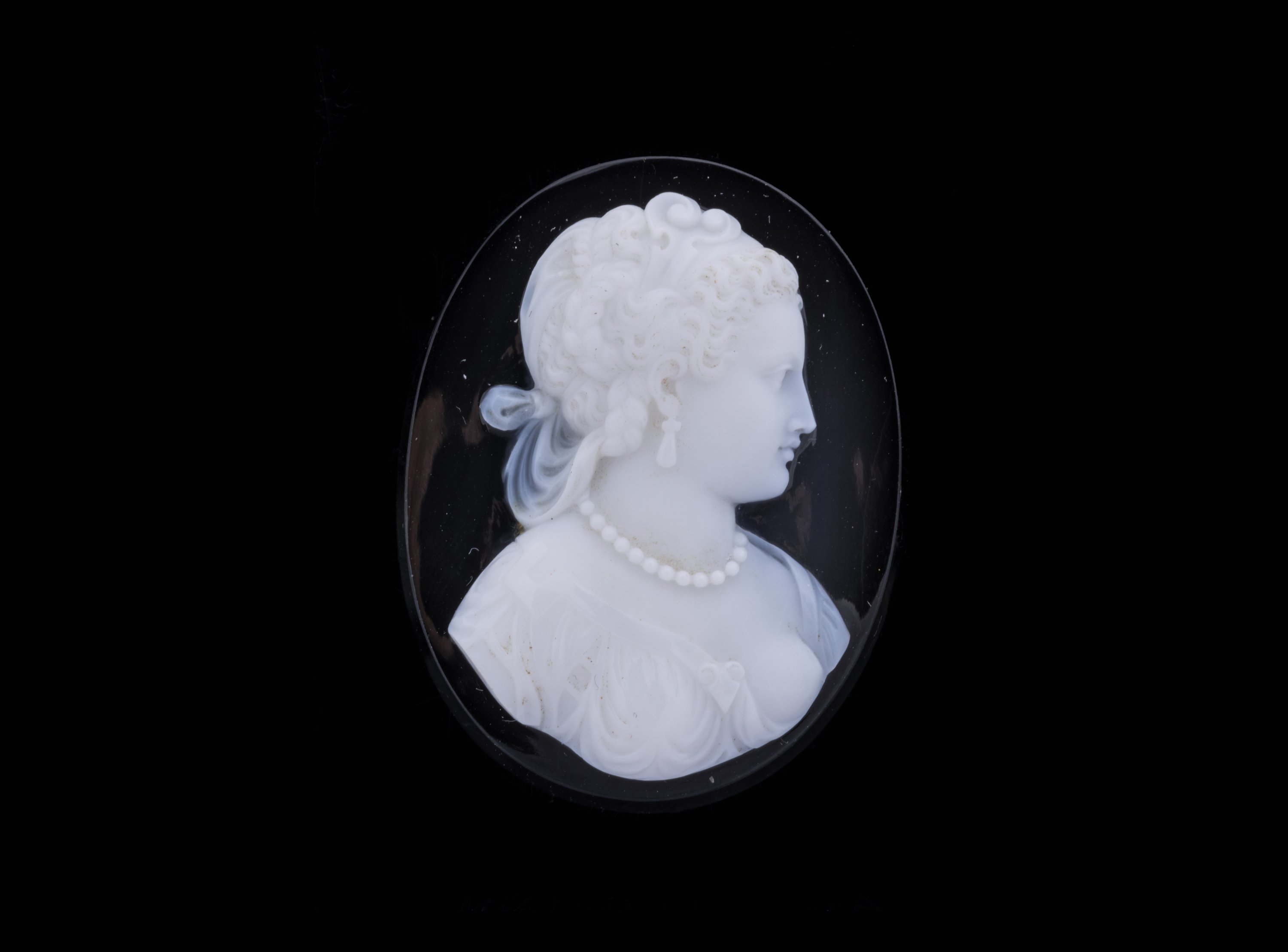 CAMÉE sur ONYX de forme ovale représentant un PROFIL FÉMININ en buste au collier de perles, boucles d'oreilles et chevelure nouée.