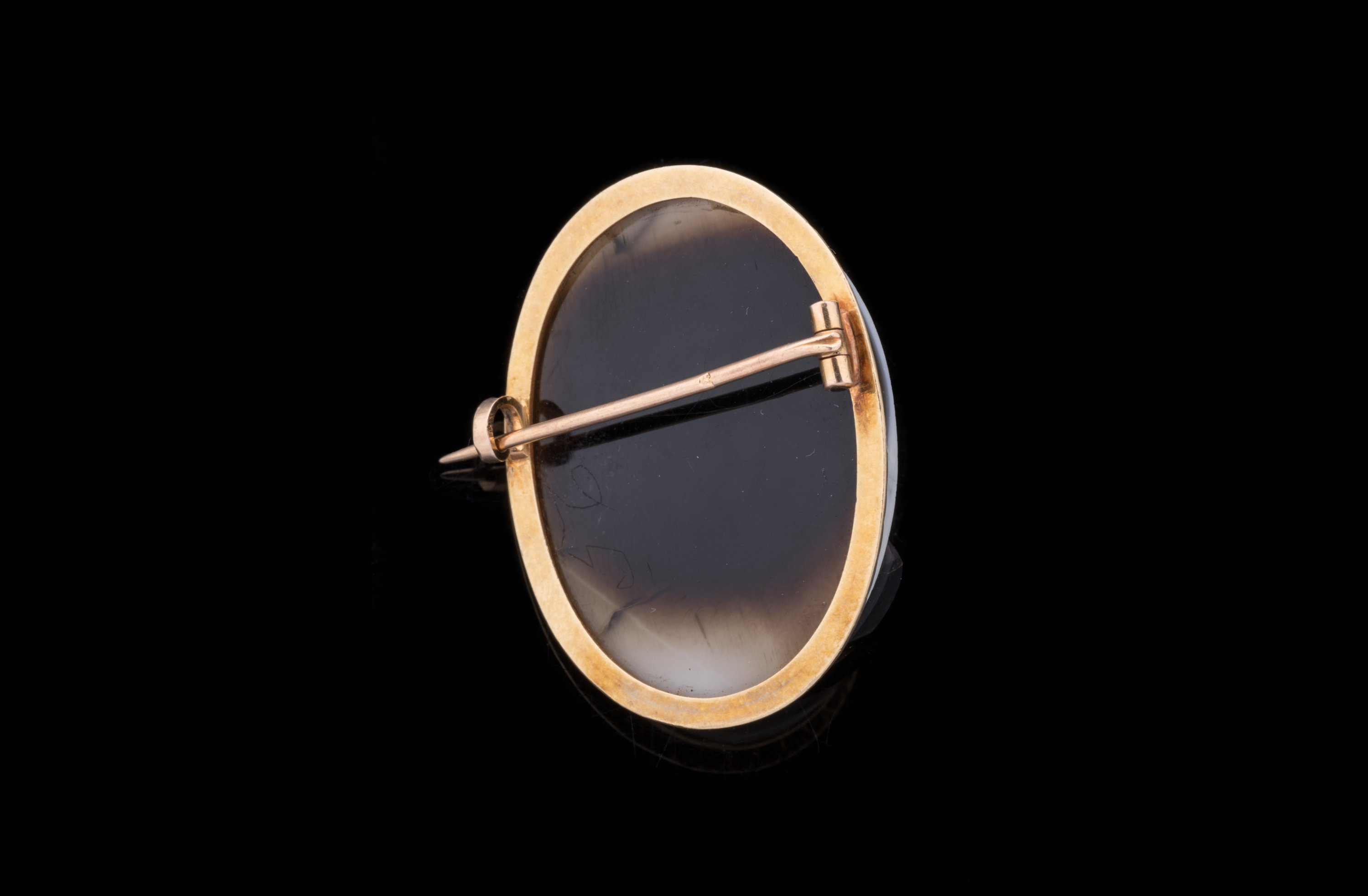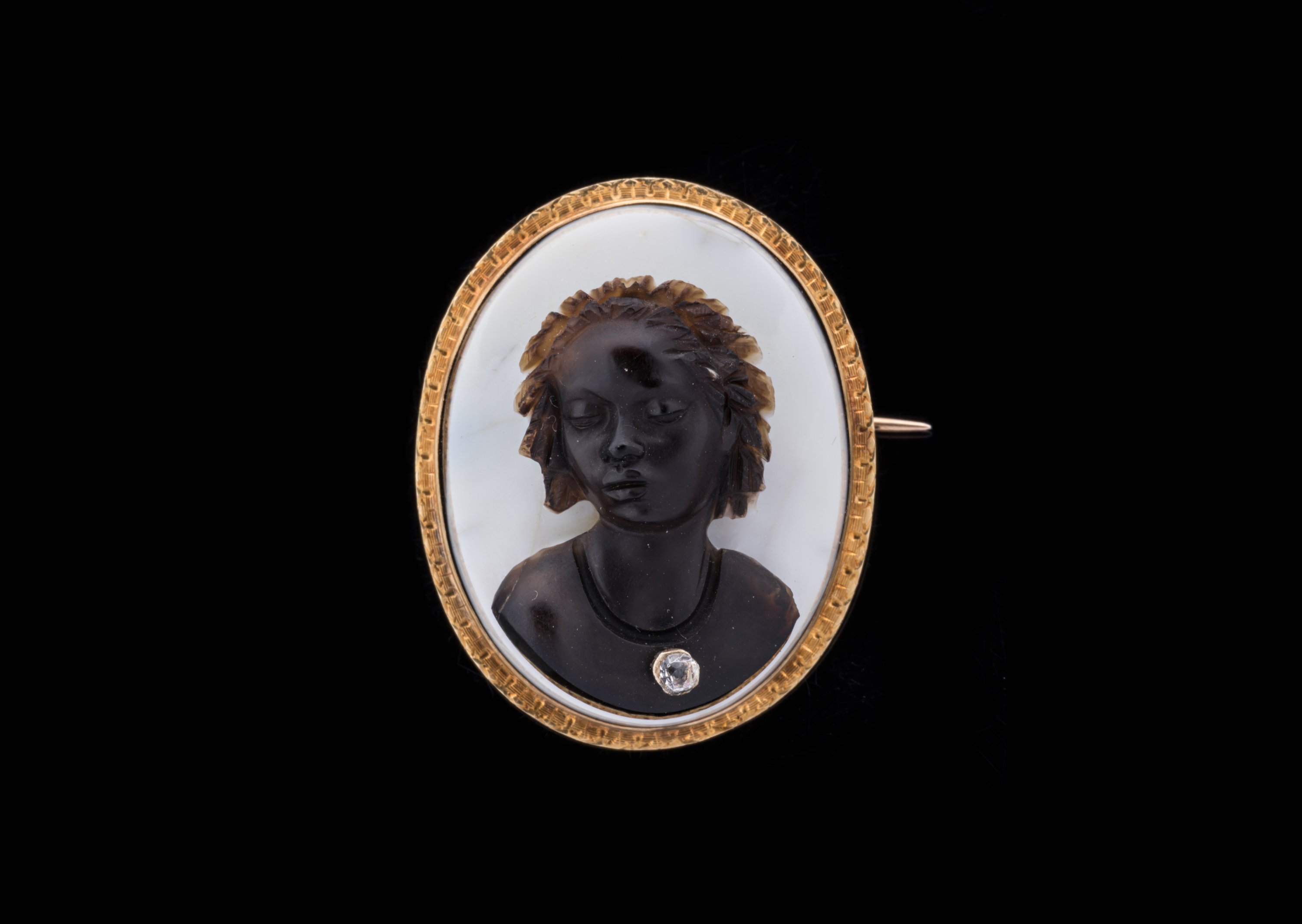 CAMÉE sur ONYX de forme ovale représentant un PORTRAIT MAURESQUE. Un trait creusé figure un collier se terminant par une pierre du Rhin. Monture broche en or.