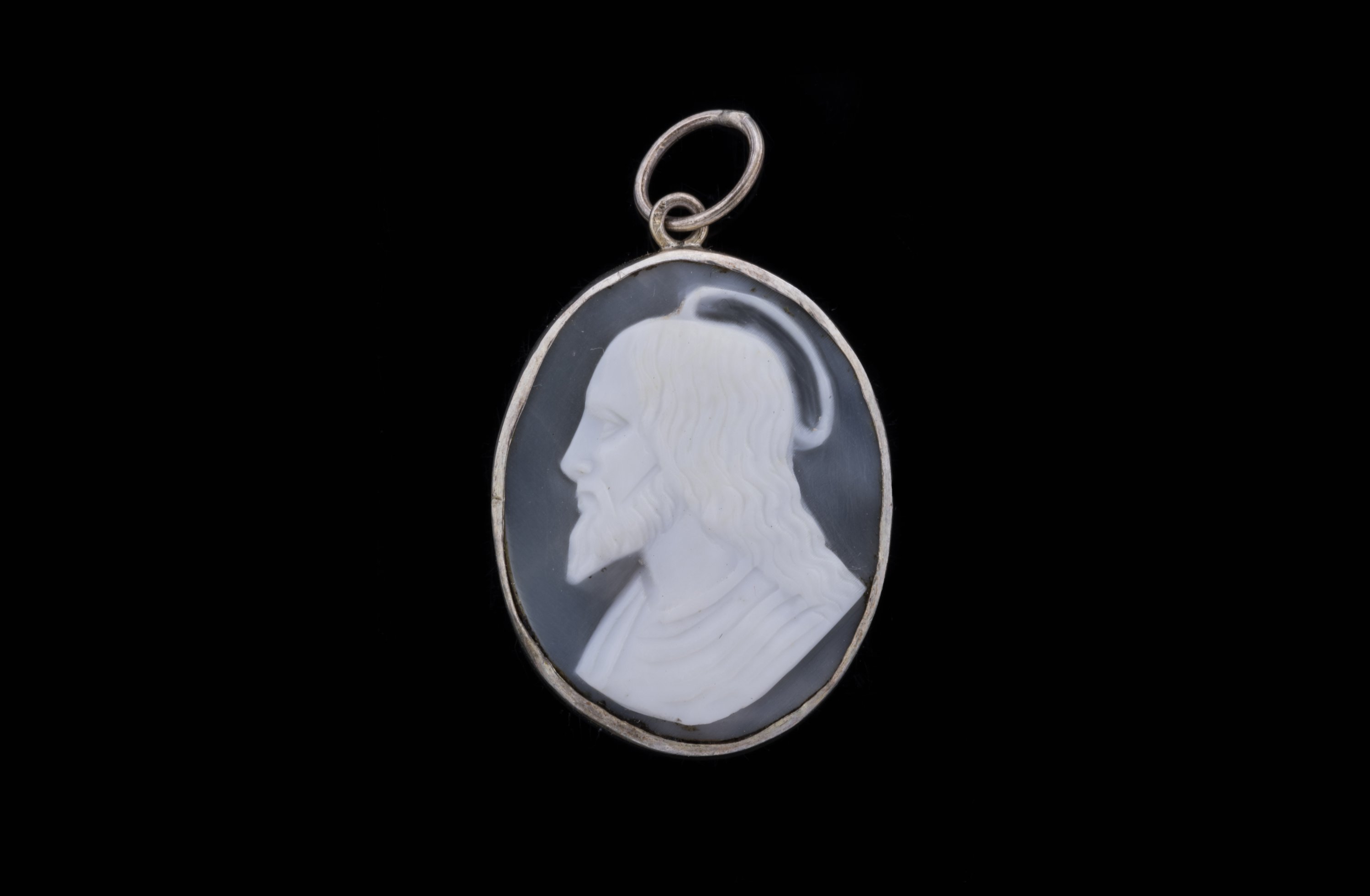 CAMÉE sur AGATE grise ( ?) de forme ovale à portrait double représentant sur la face la VIERGE et au revers le CHRIST. Monture pendant en argent.