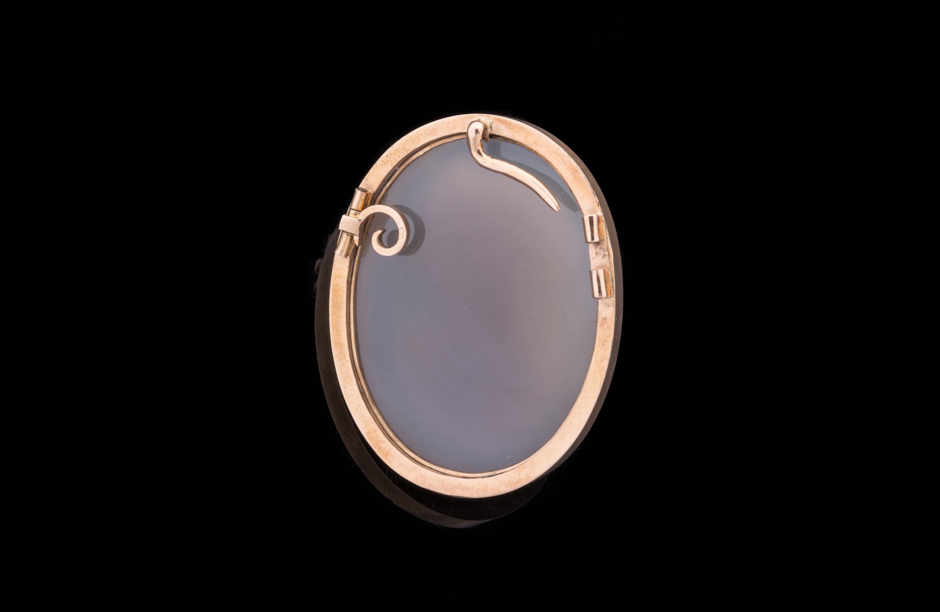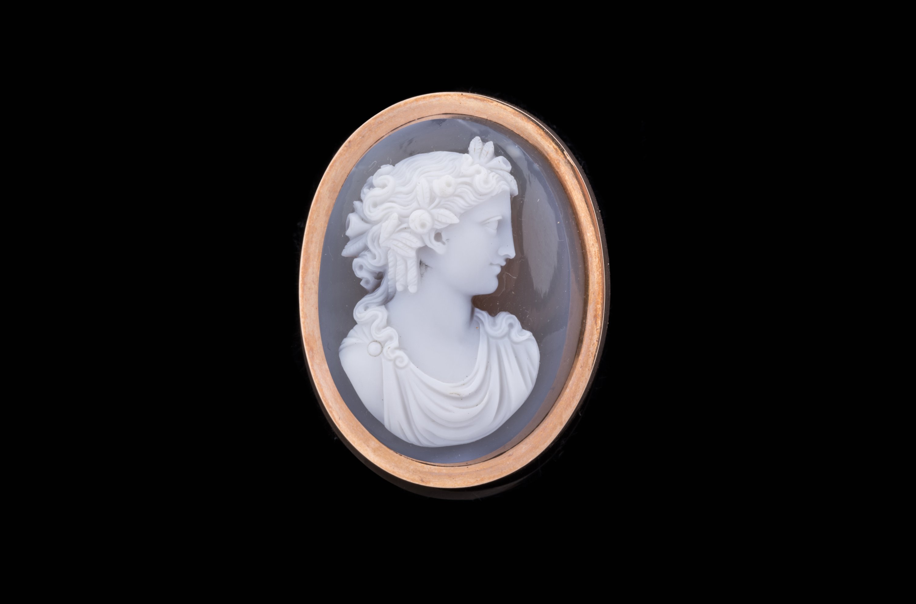CAMÉE sur AGATE de forme ovale représentant un PROFIL FÉMININ à l'antique aux cheveux bouclés et parés d'une couronne de fruits. Monture broche en or au poinçon d'importation hibou (manque l'aiguille de la broche).