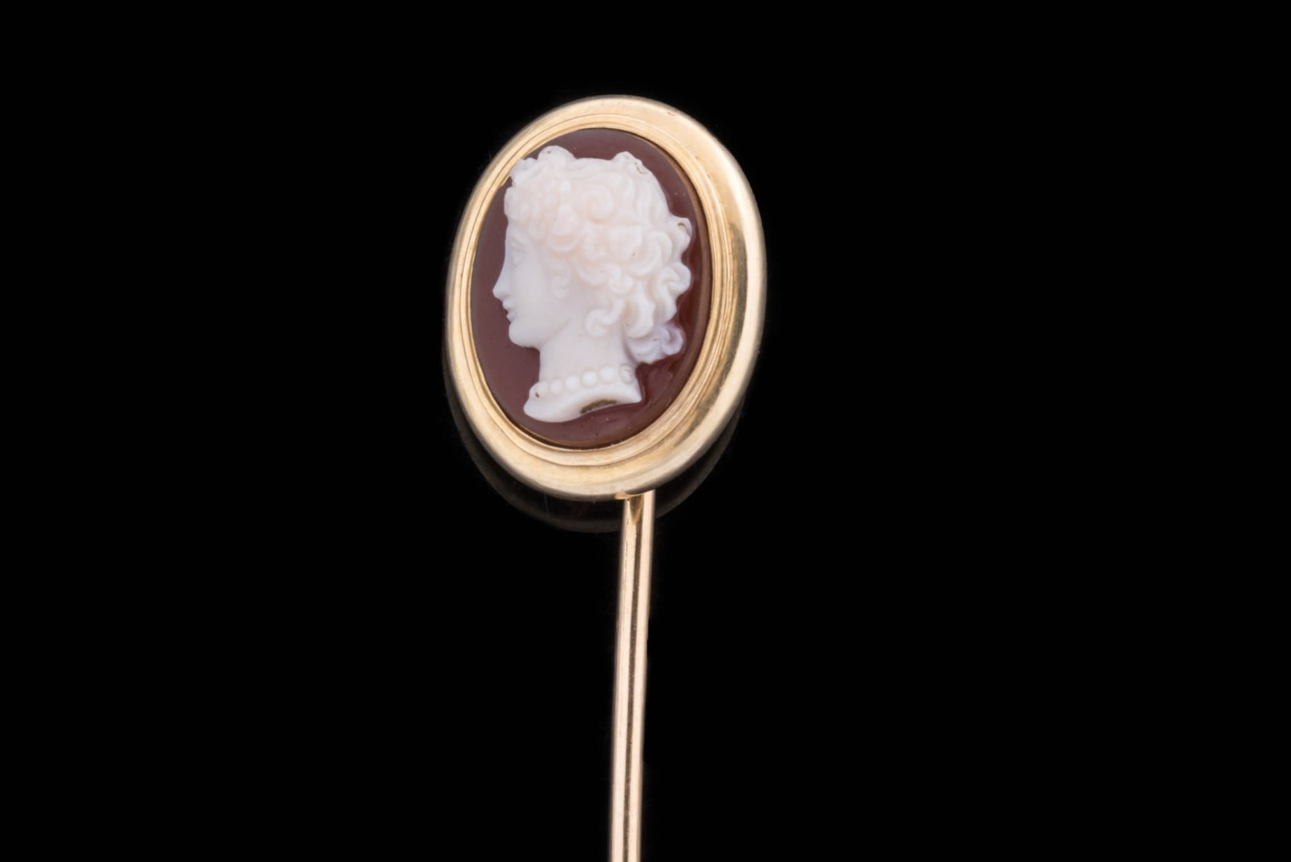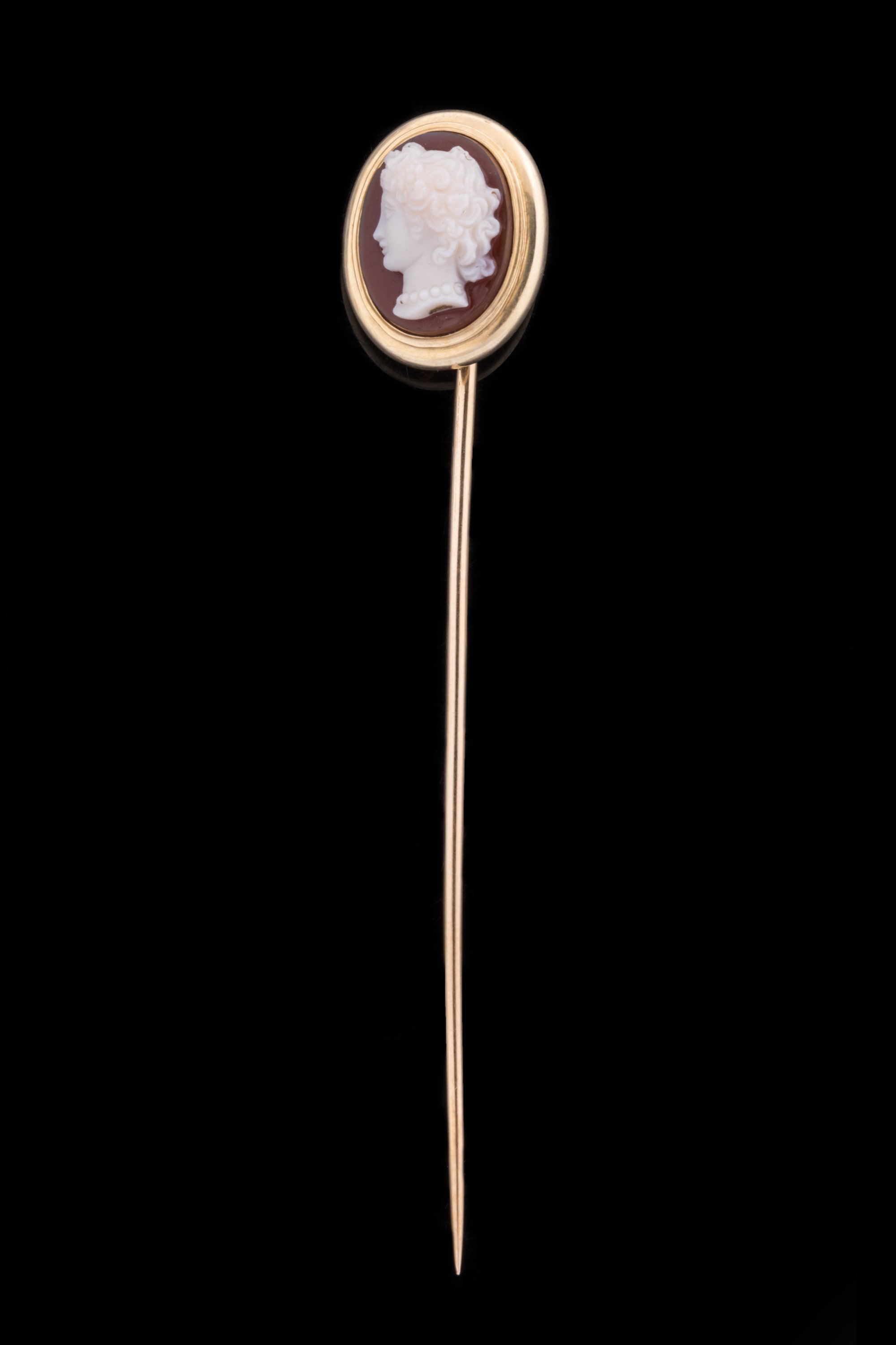 CAMÉE sur CORNALINE de forme ovale représentant un PROFIL FÉMININ parée d'un collier de perles. Monture épingle de cravate en or. Poinçon d'importation au hiboux (sur l'épingle)