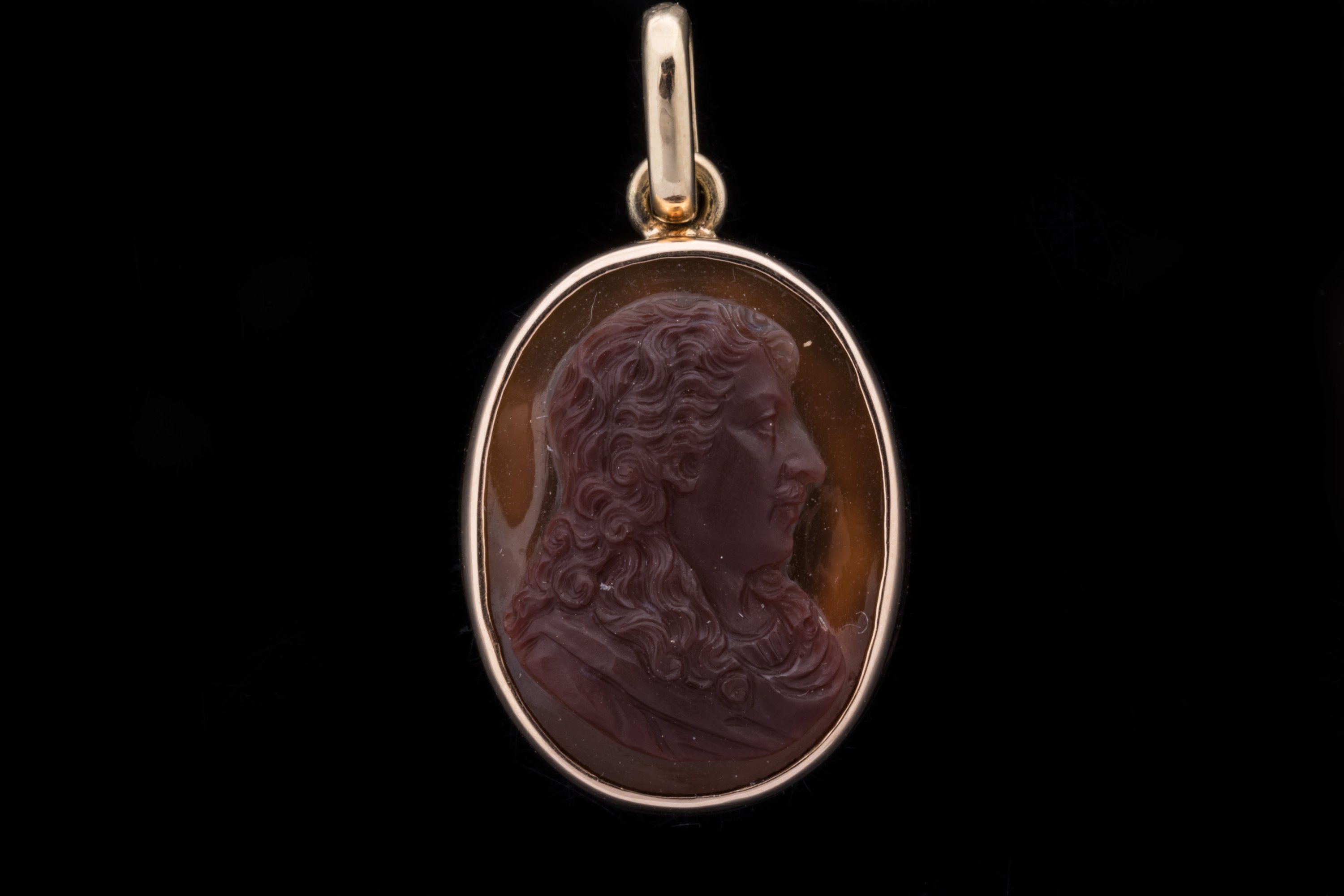 CAMÉE sur CORNALINE de forme ovale représentant un PROFIL de GENTILHOMME. Monture pendant en or 14k.