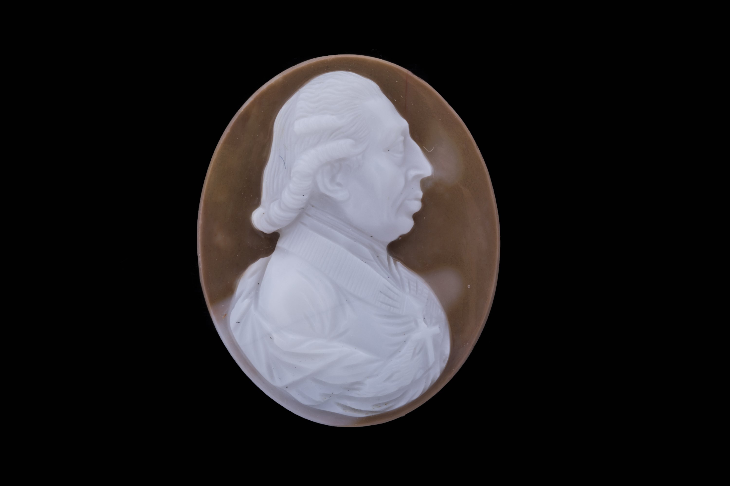CAMÉE sur CORNALINE ( ?) de forme ovale représentant un PROFIL d'HOMME du XVIIIe siècle à la croix.