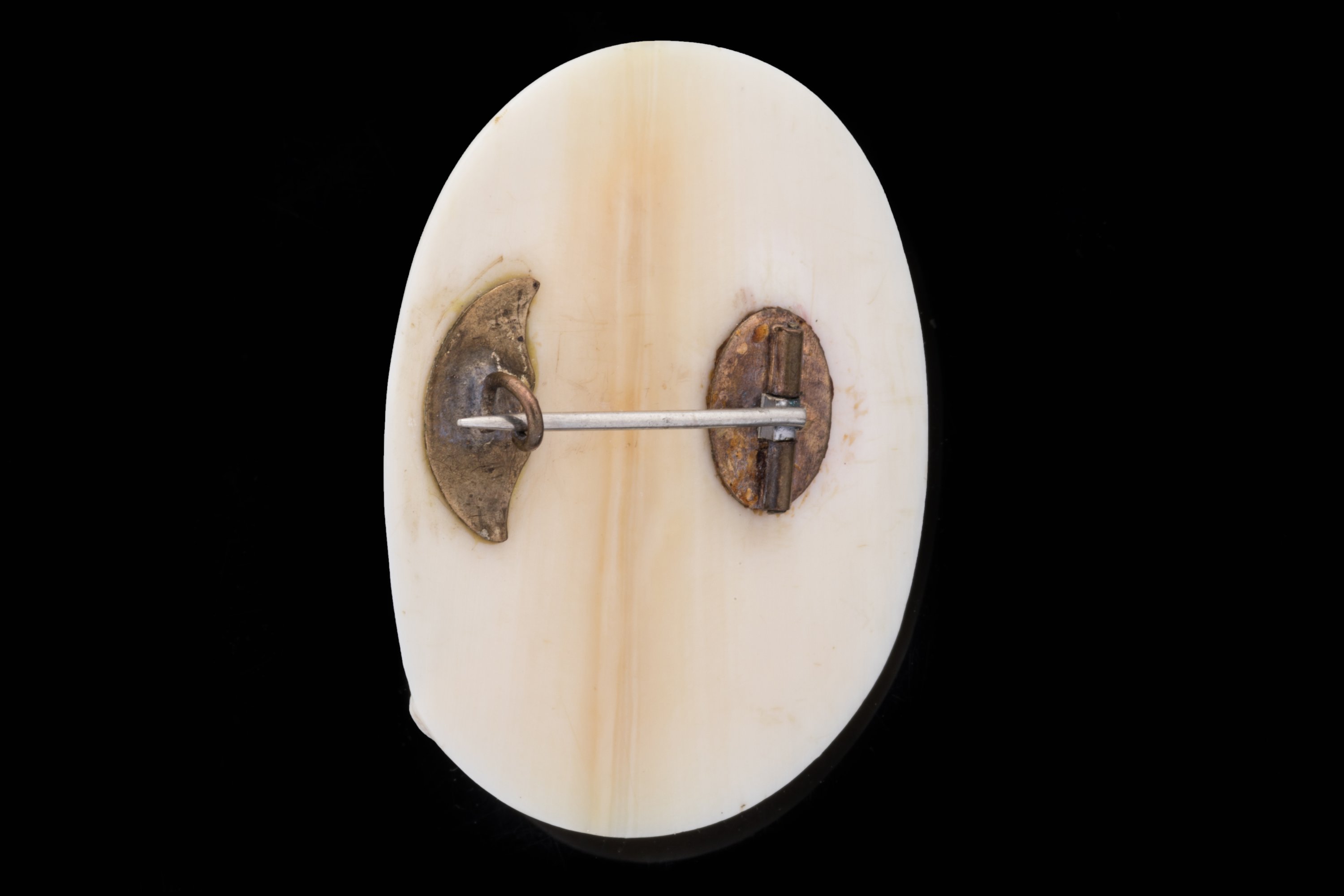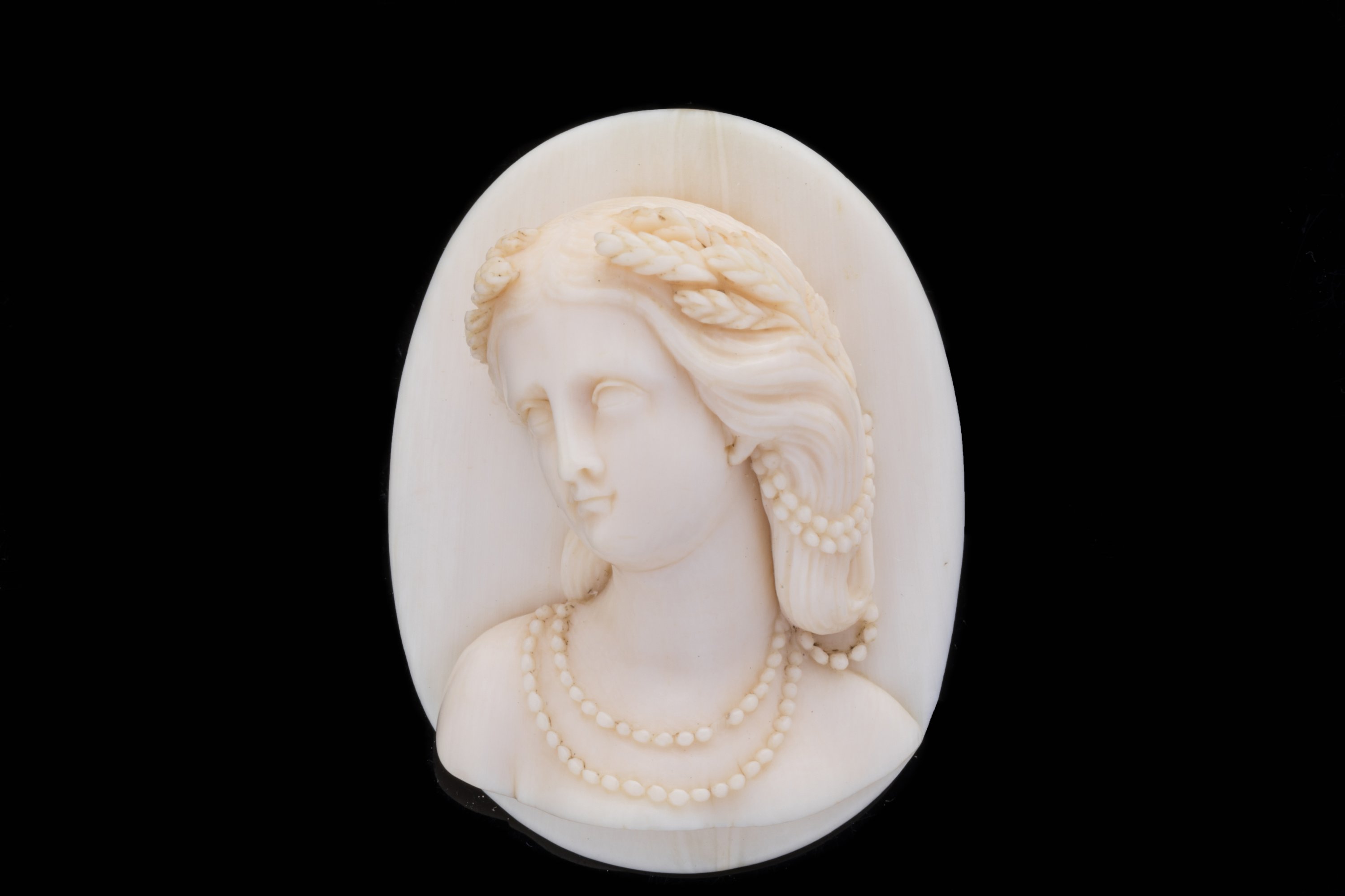 CAMÉE sur IVOIRE de forme ovale représentant une JEUNE FEMME de trois-quarts en haut-relief au collier à deux rangs de perles et à la coiffure aux gerbes de blé. Monture broche en métal.