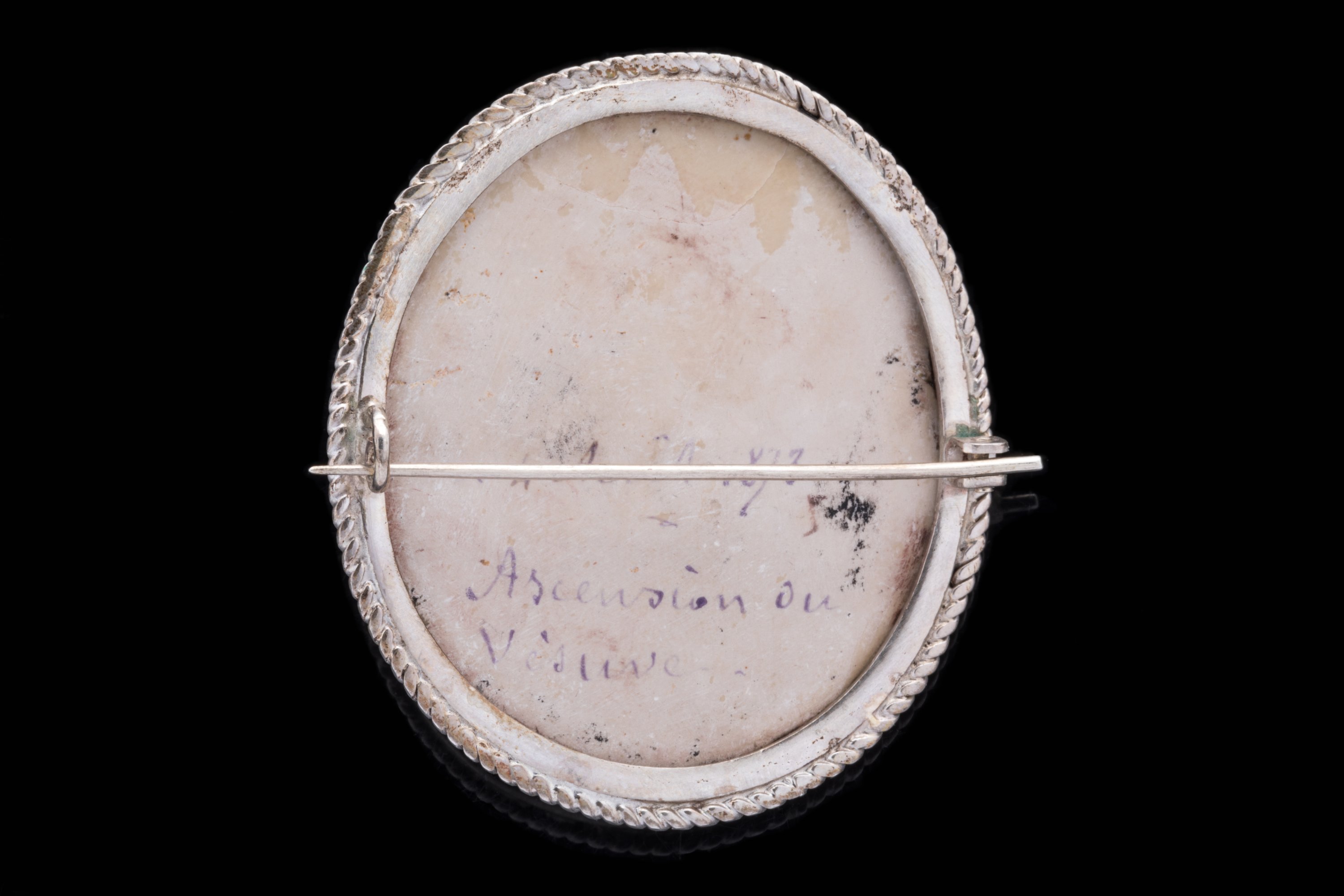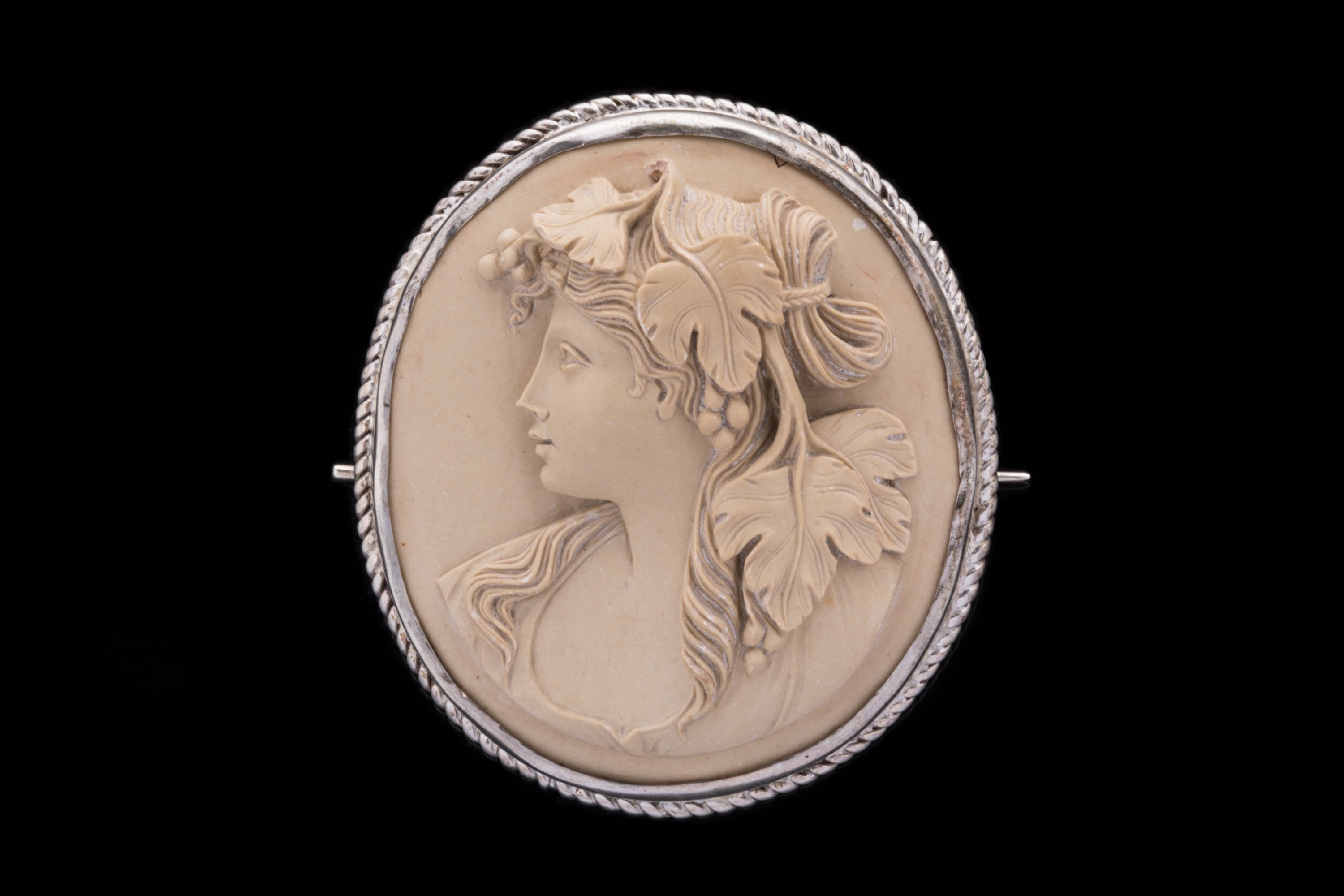 CAMÉE sur PIERRE de LAVE de forme ovale représentant un PROFIL de FEMME à la coiffure ornée de feuilles de vigne et fruits. Monture broche en argent orné d'un motif torsadé.