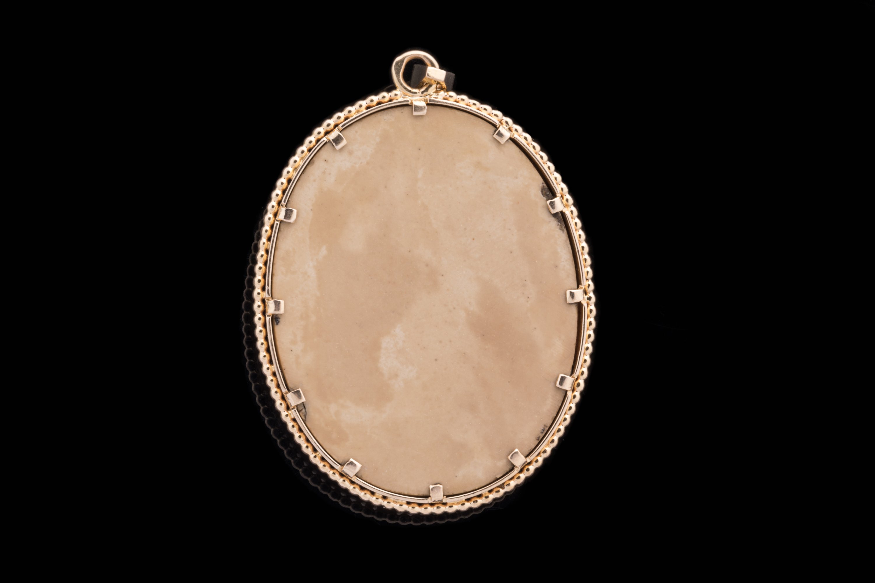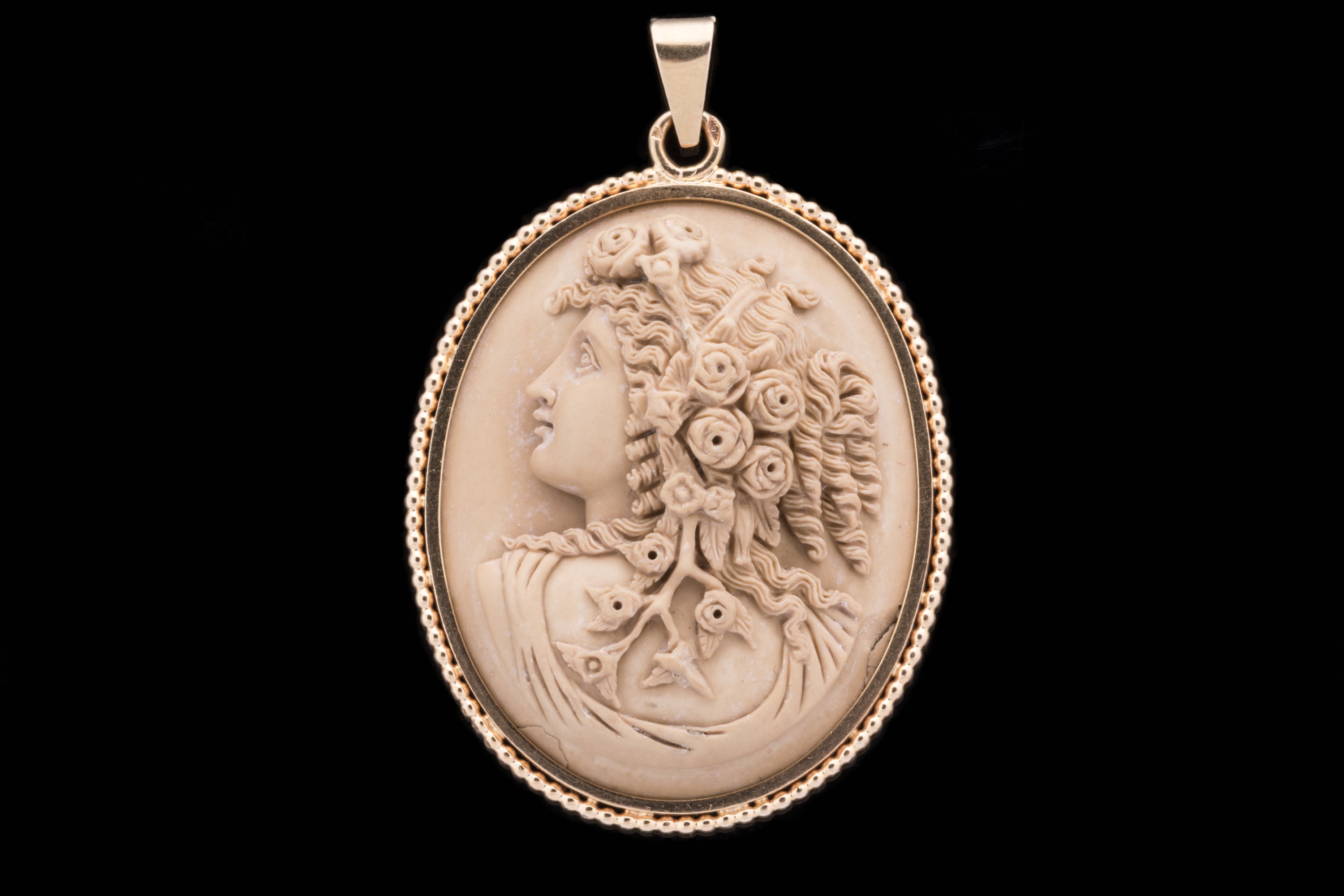 CAMÉE sur PIERRE de LAVE de forme ovale représentant un PROFIL de FEMME à la coiffure bouclée ornée de branches fleuries. Monture pendant en or 18k à rang de perles.