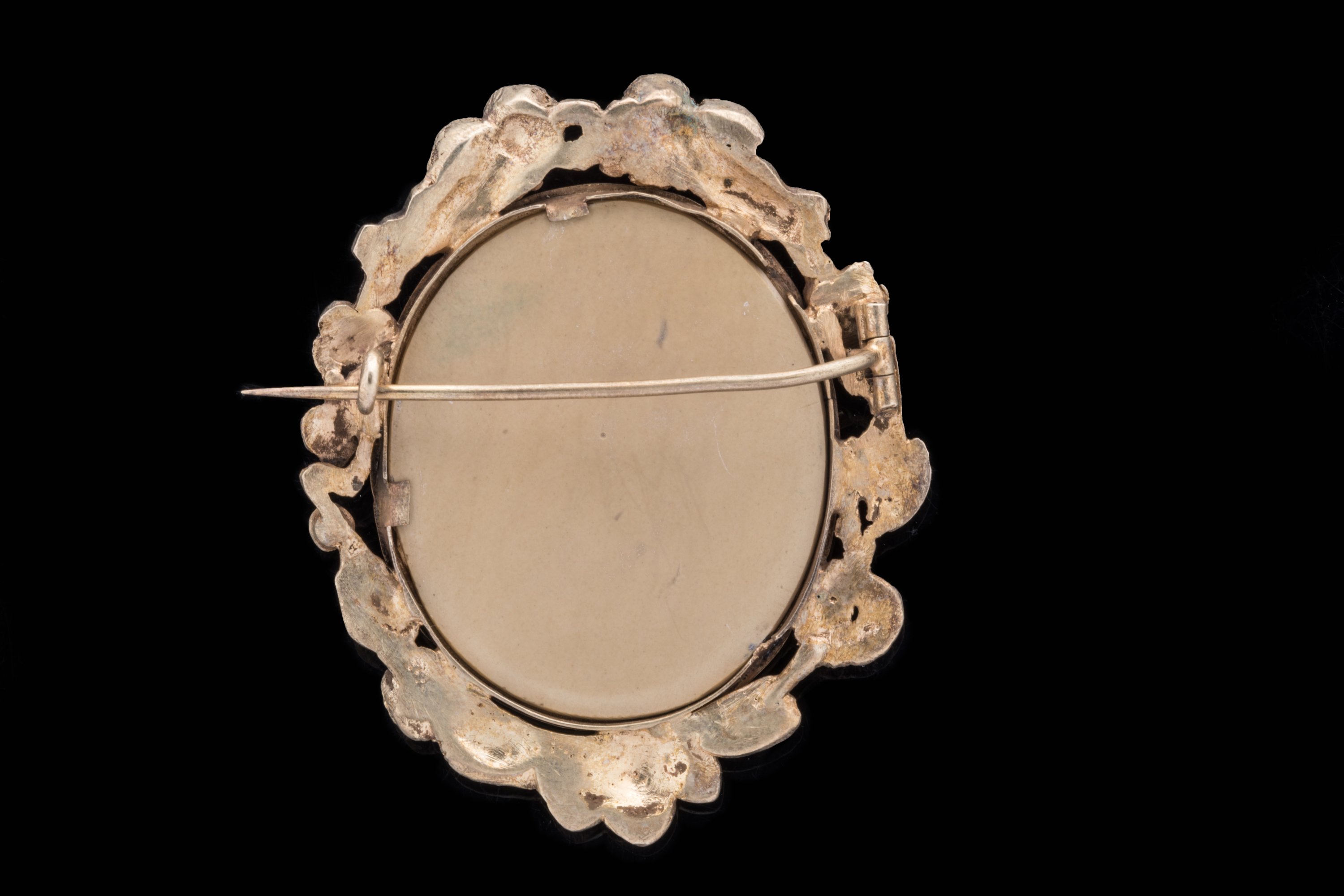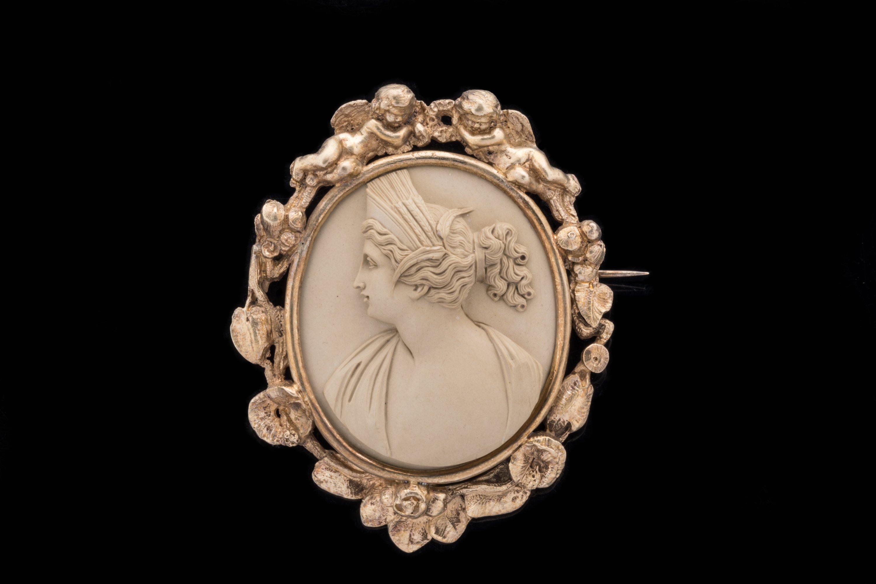 CAMÉE sur PIERRE de LAVE de forme ovale représentant un PROFIL FÉMININ aux épis de blé dans les cheveux possiblement une allégorie de l'ÉTÉ ou CÉRÈS. Monture broche en pomponne ornée de motifs végétaux et coiffée de deux amours tenant des couronnes de fleurs.