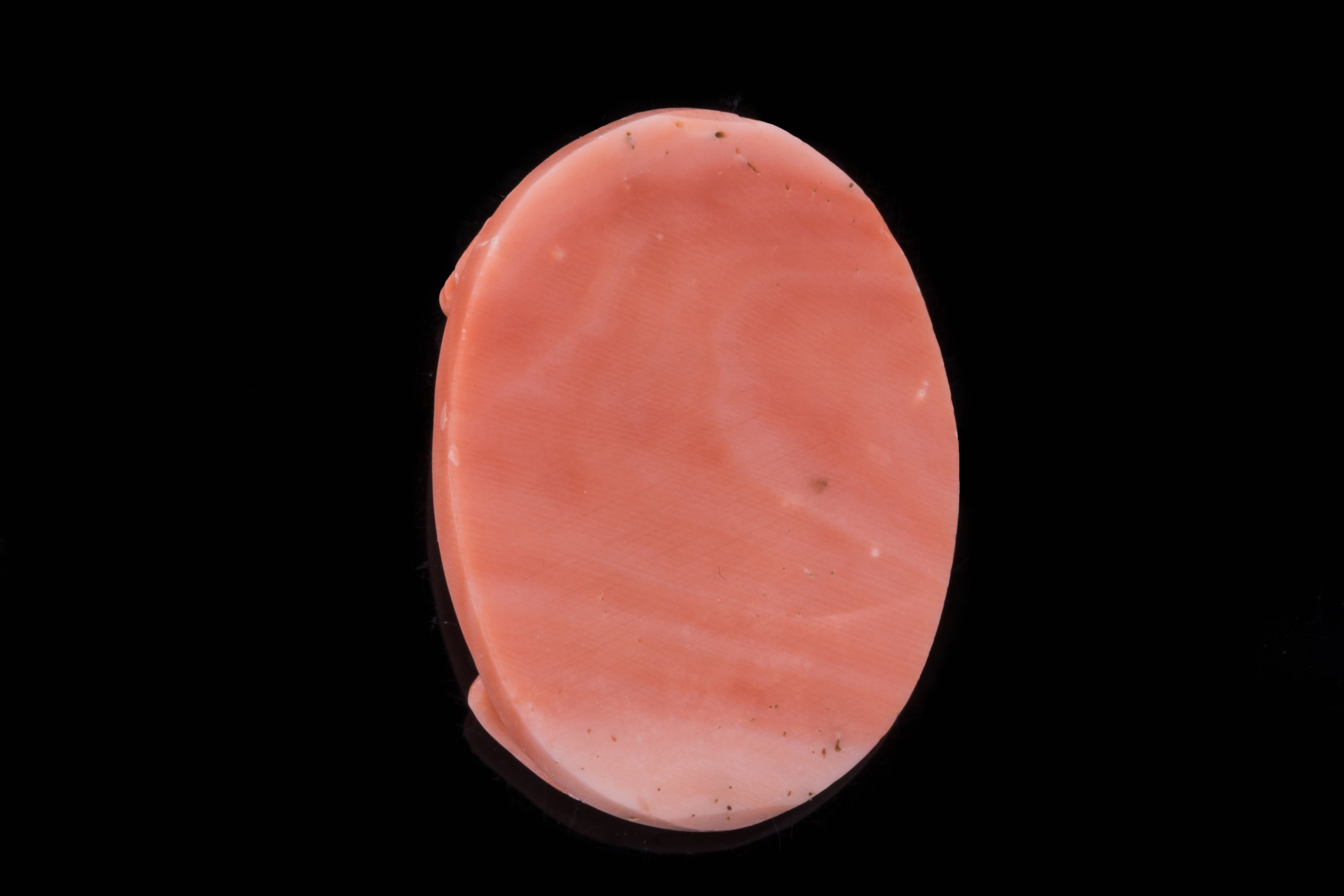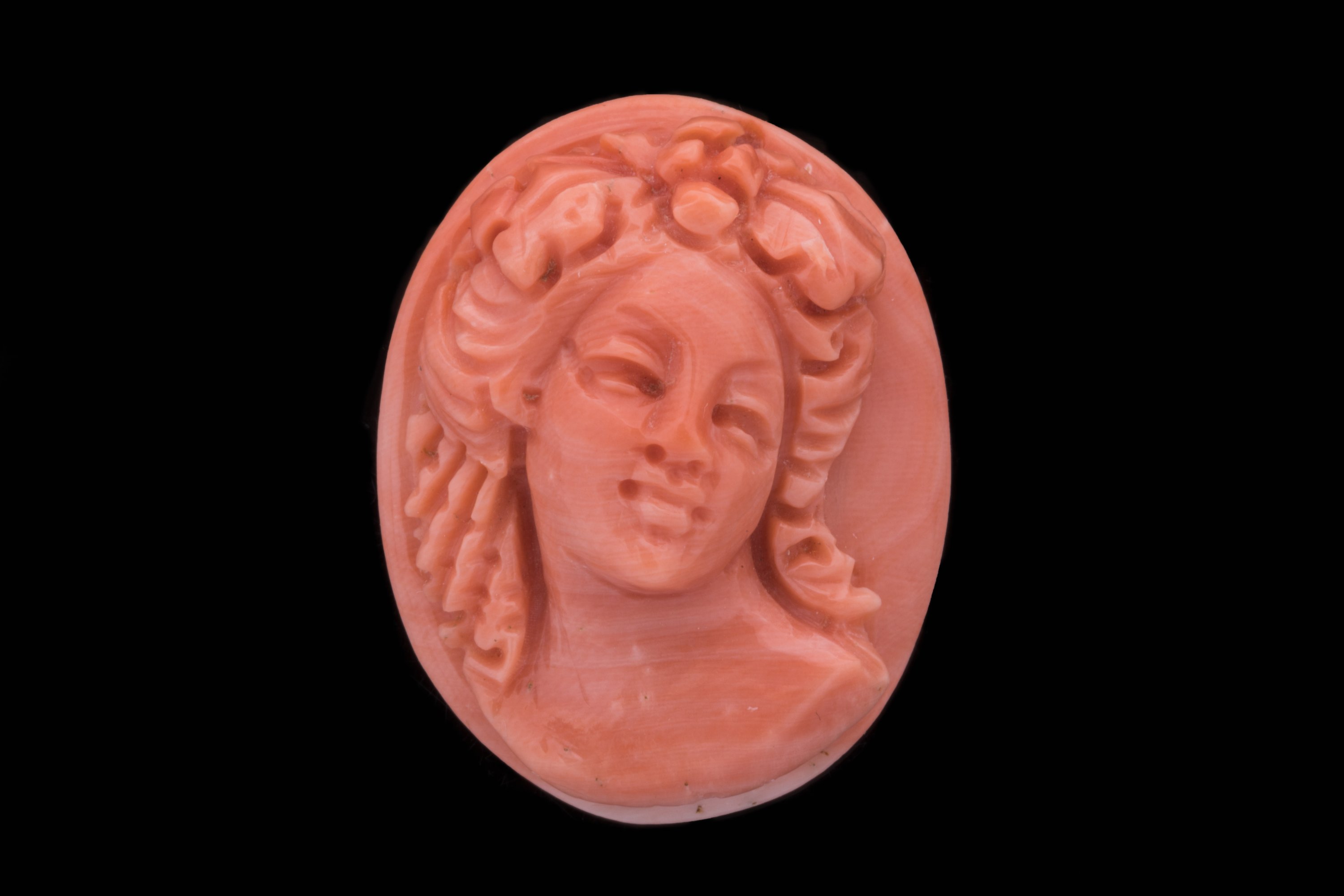 CAMÉE sur CORAIL de forme ovale représentant un PORTRAIT FÉMININ de trois-quarts.