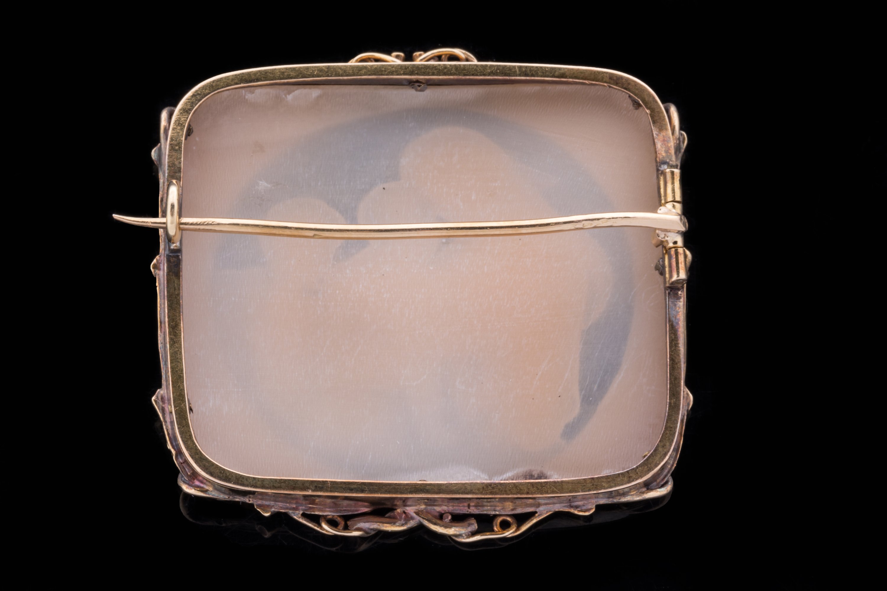 CAMÉE sur COQUILLAGE de forme rectangulaire représentant la SAINTE FAMILLE d'après la VIERGE à la CHAISE de RAPHAEL (1483-1520). Monture broche en or 14k à décor végétal tel que pampre de vigne.