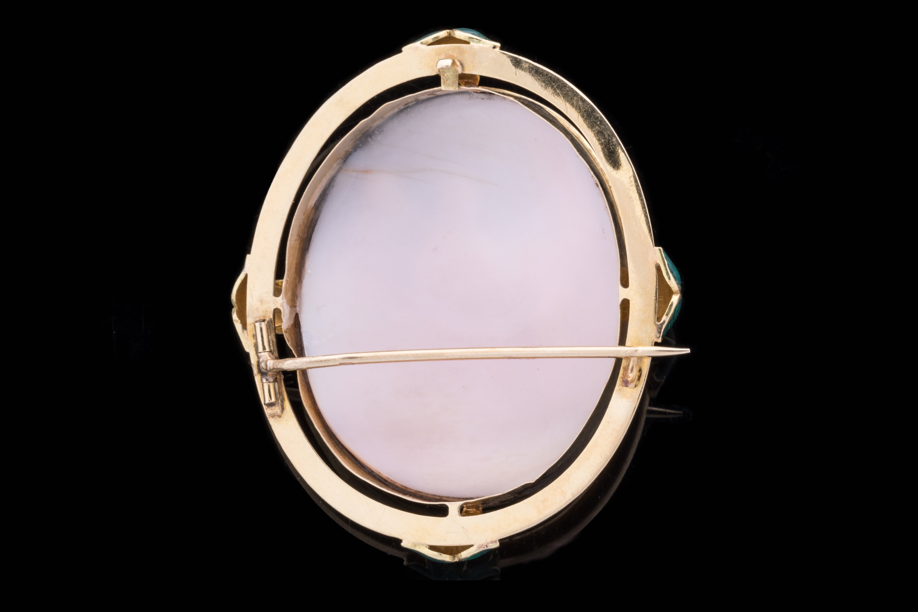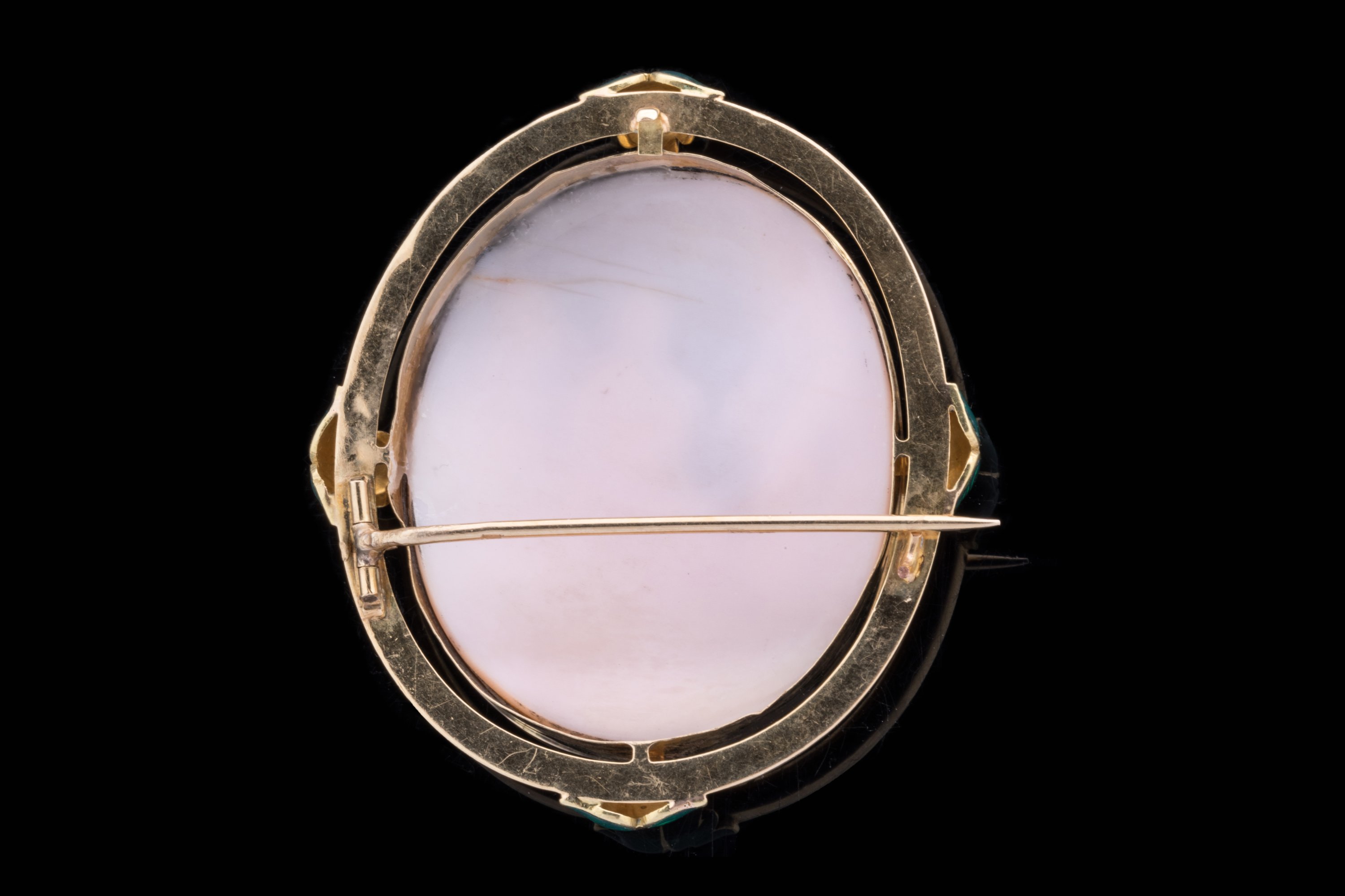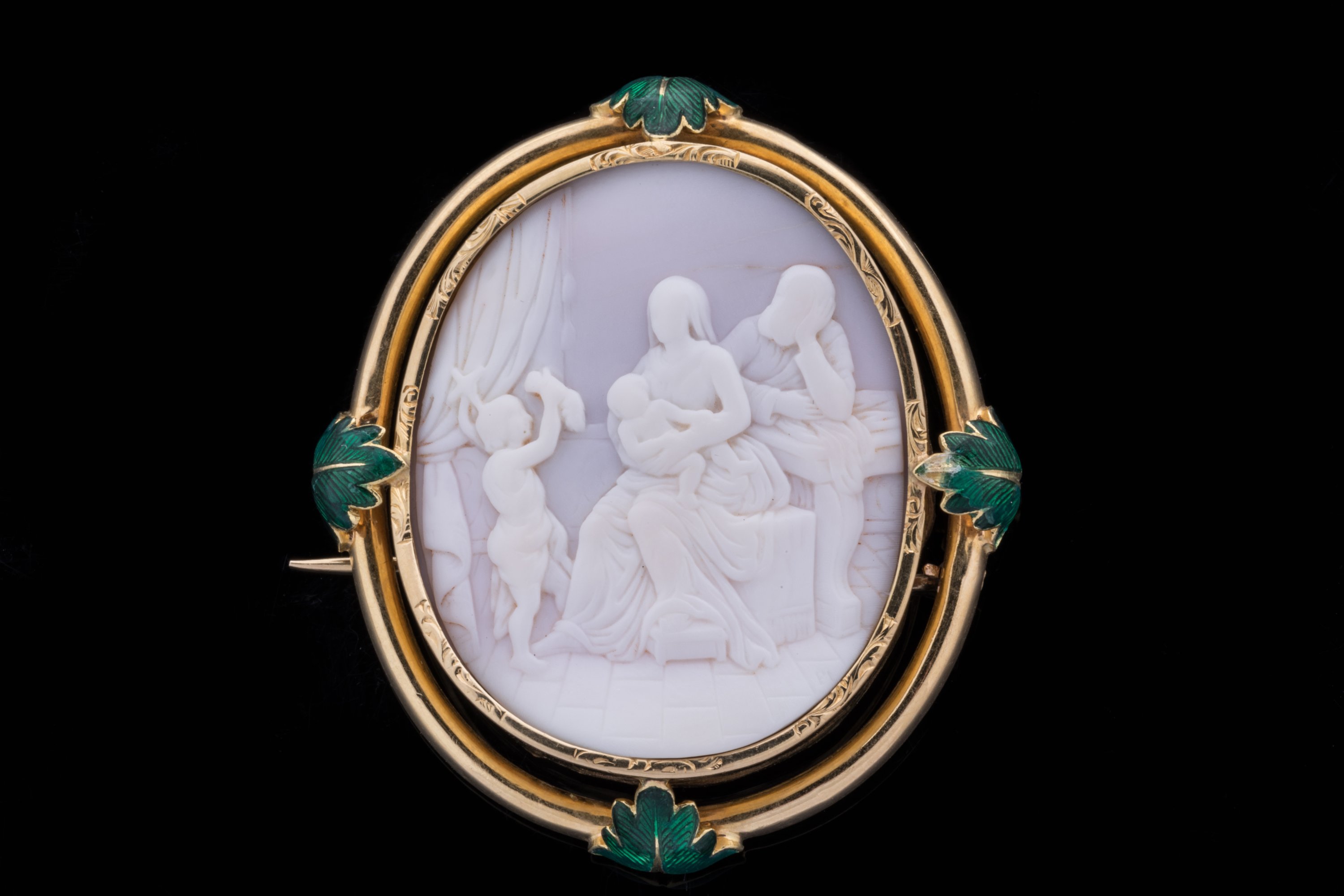 CAMÉE sur COQUILLAGE de forme ovale représentant la SAINTE FAMILLE dans l'atelier de saint Joseph. Monture broche en or 14k à décor de feuilles d'acanthe en émail vert aux quatre points cardinaux. (accident à l'émail d'une feuille, manque le fermoir).
