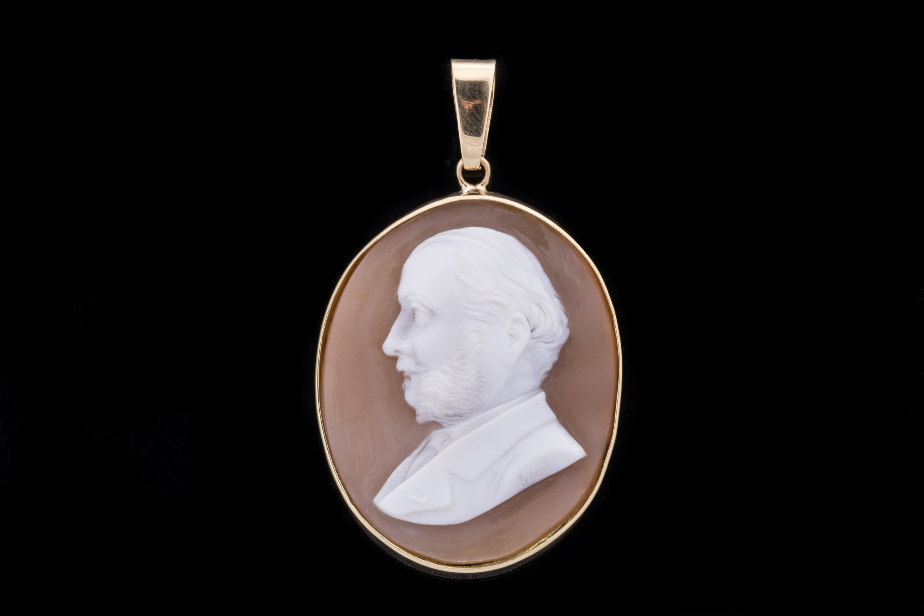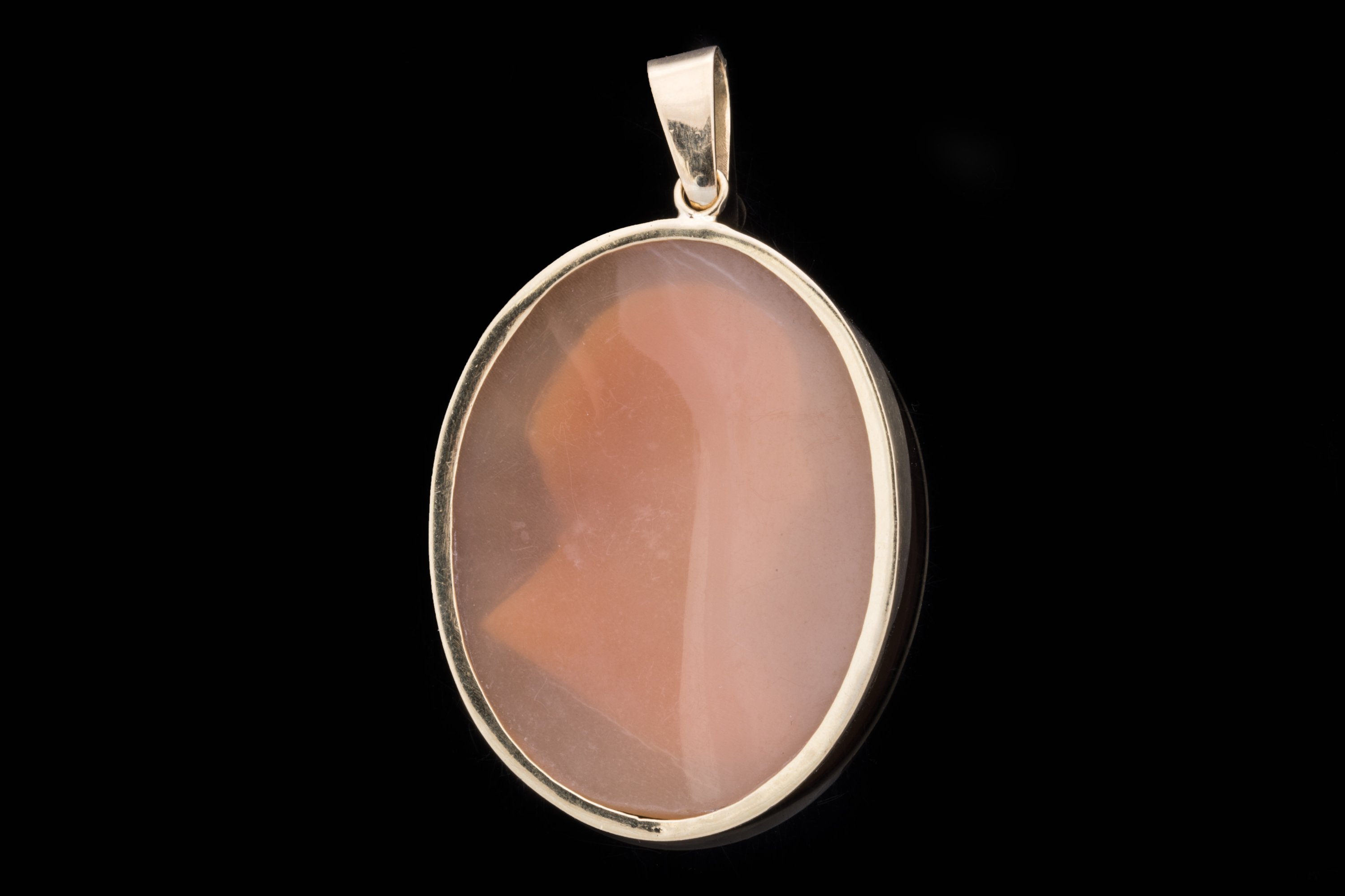 CAMÉE sur COQUILLAGE de forme ovale représentant un PROFIL d'HOMME moderne à la BARBE. Monture en pendant en or 14k.