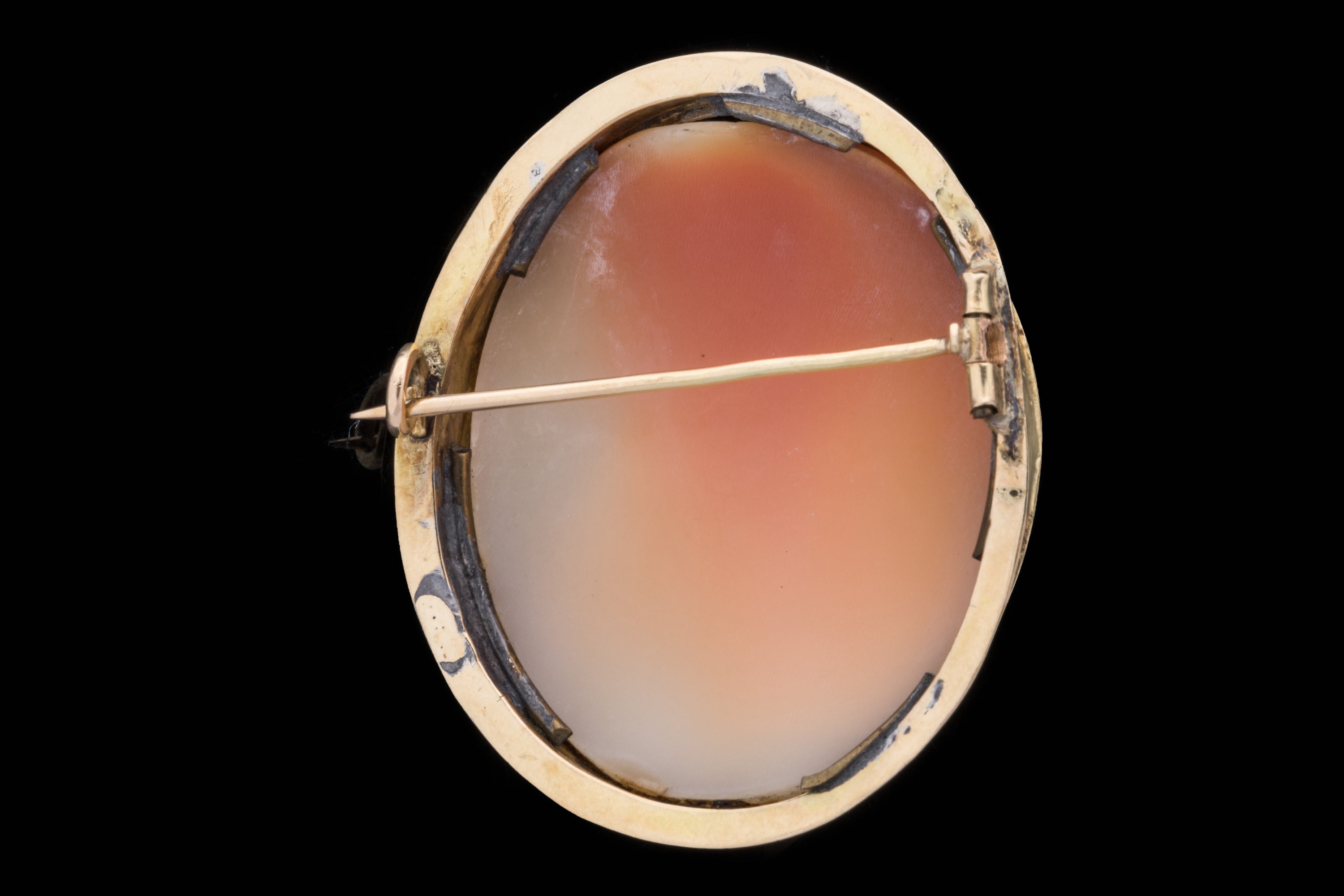 CAMÉE sur COQUILLAGE de forme ovale représentant un PROFIL d'HOMME moderne à la légion d'honneur. Monture en or 14k à décor de triangles et guirlandes de laurier.