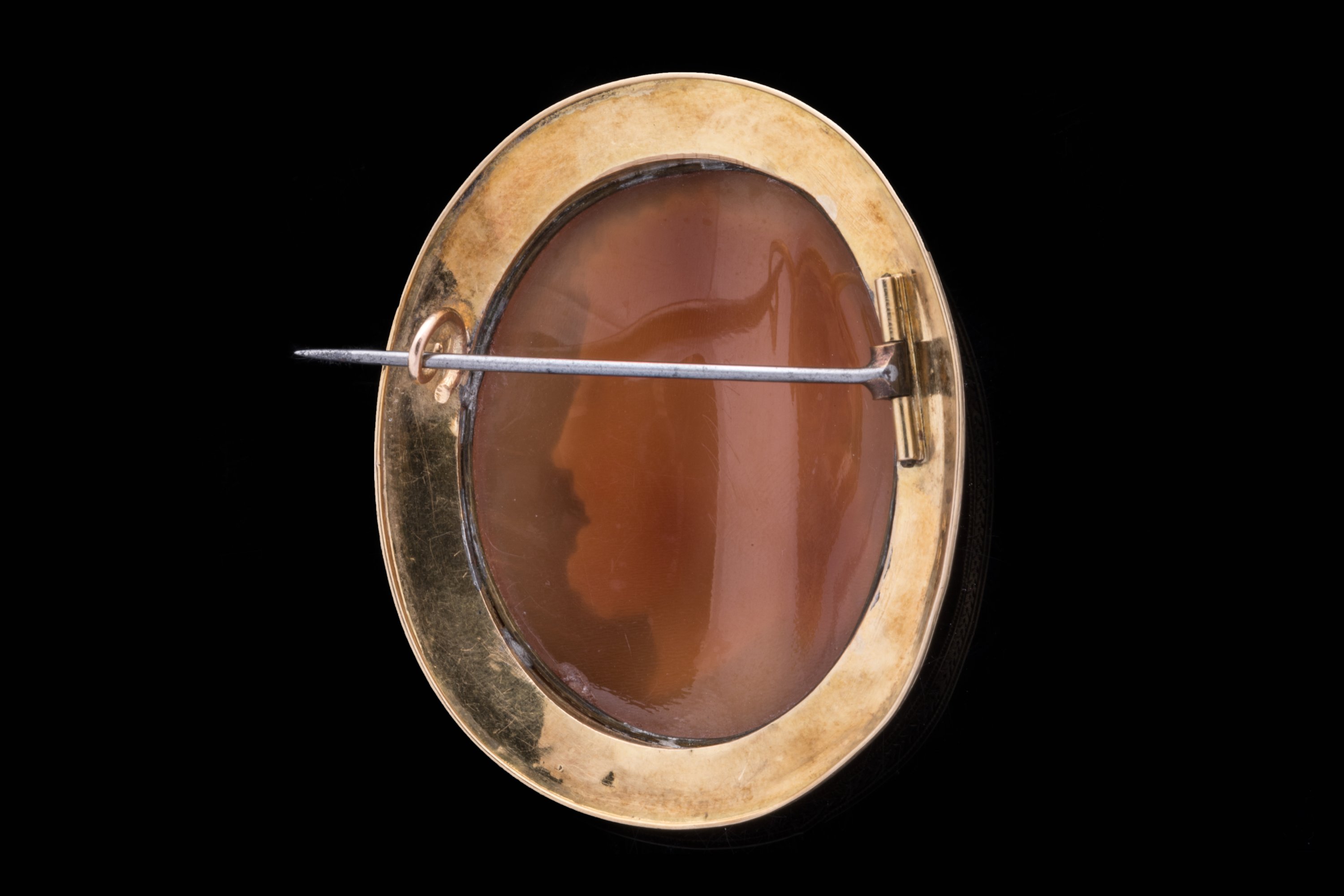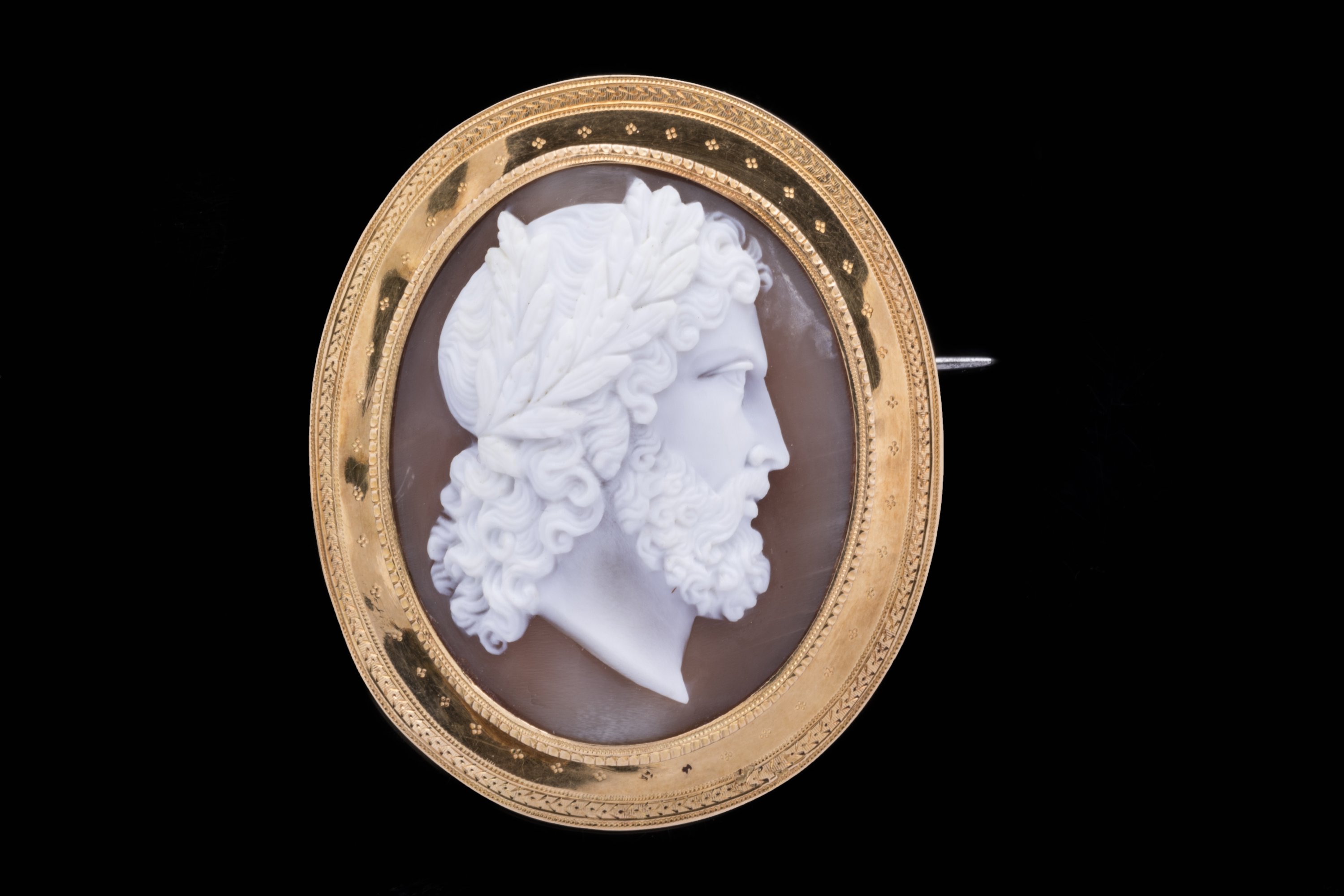CAMÉE sur COQUILLAGE de forme ovale représentant un PROFIL d'HOMME à l'antique couronné de laurier. Monture en or 14k ciselé à décor losangé et de frise. (épingle en métal).