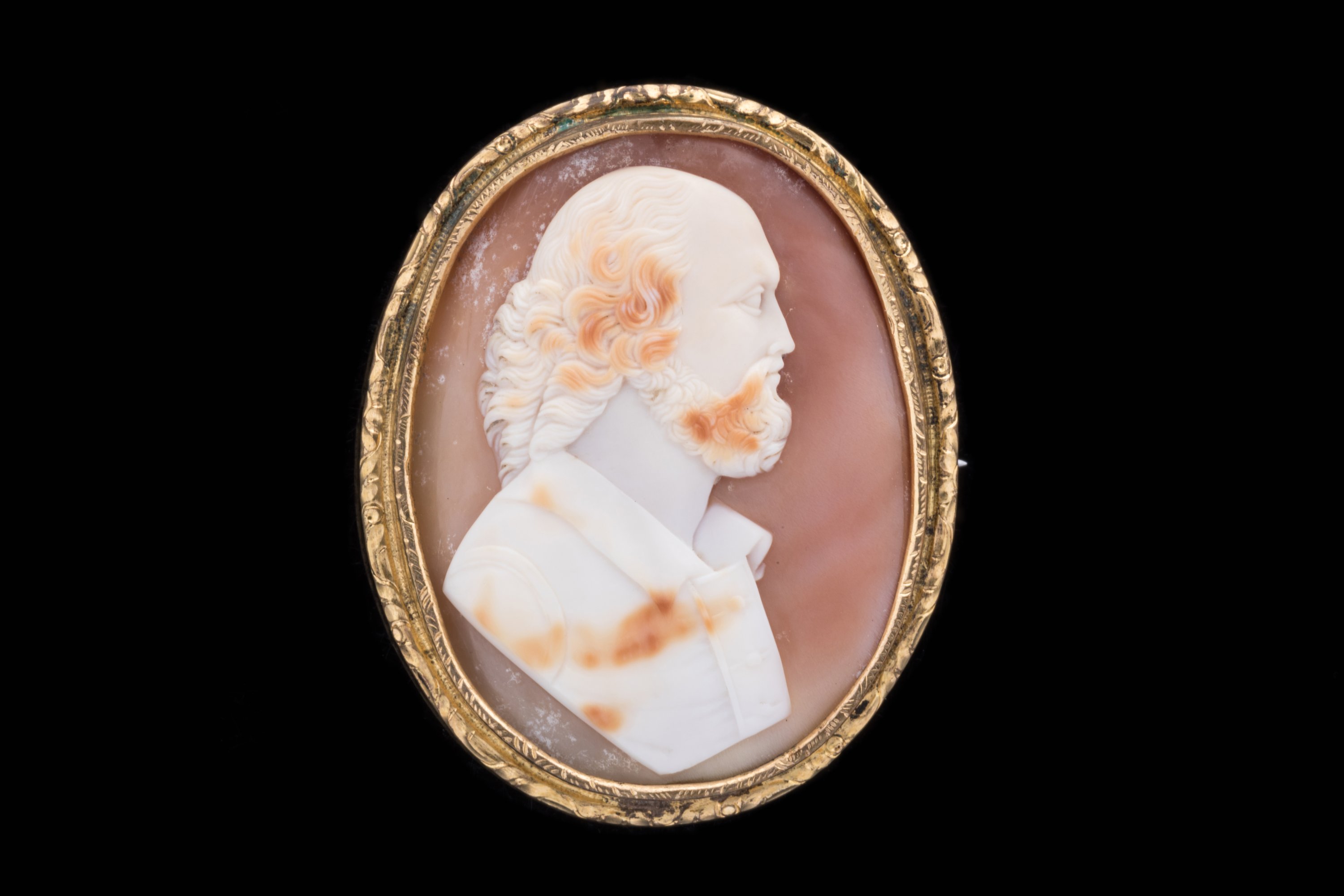 CAMÉE sur COQUILLAGE de forme ovale représentant un PROFIL d'HOMME moderne à la barbe et à la chevelure frisée et torsadée. Monture broche en pomponne à décor de rinceaux.