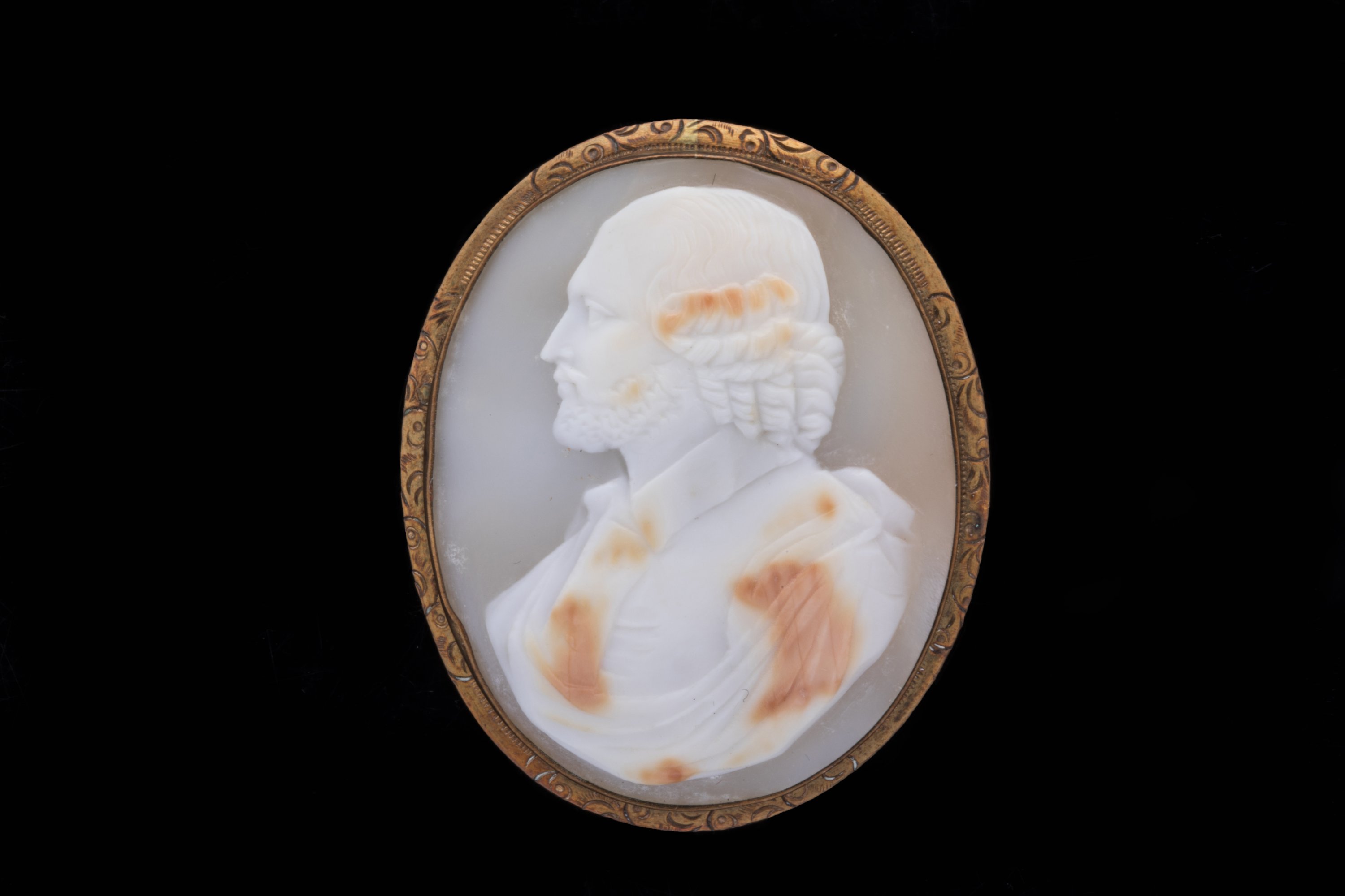 CAMÉE sur COQUILLAGE de forme ovale représentant un PROFIL d'HOMME moderne à la barbe et à la chevelure frisée et torsadée. Monture broche en pomponne à décor ciselé.
