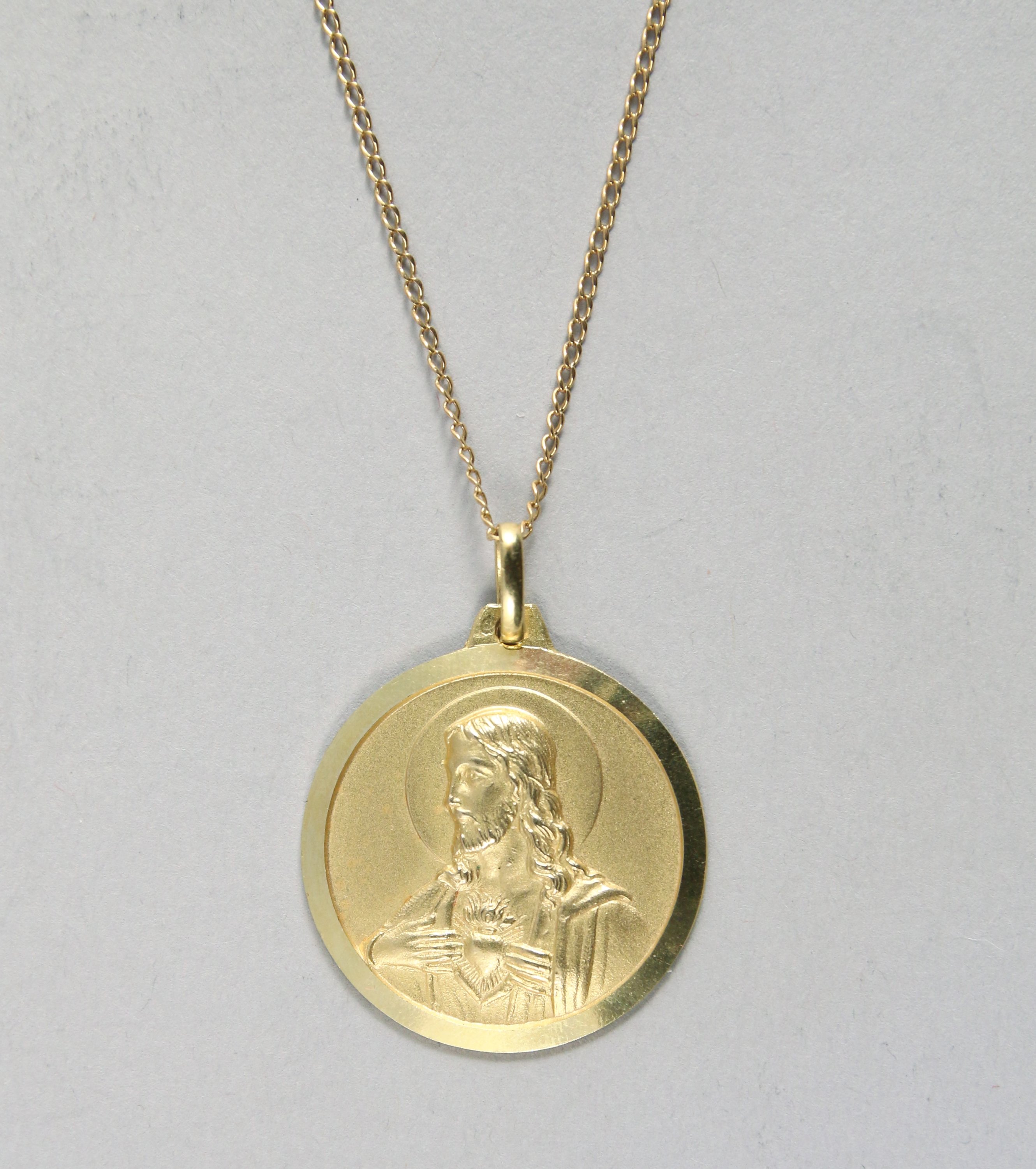 MÉDAILLE en or jaune 750 milièmes figurant le Christ montrant son coeur sacré. Avec une fine CHAÎNE en or jaune 750 milièmes à maille entrelac.