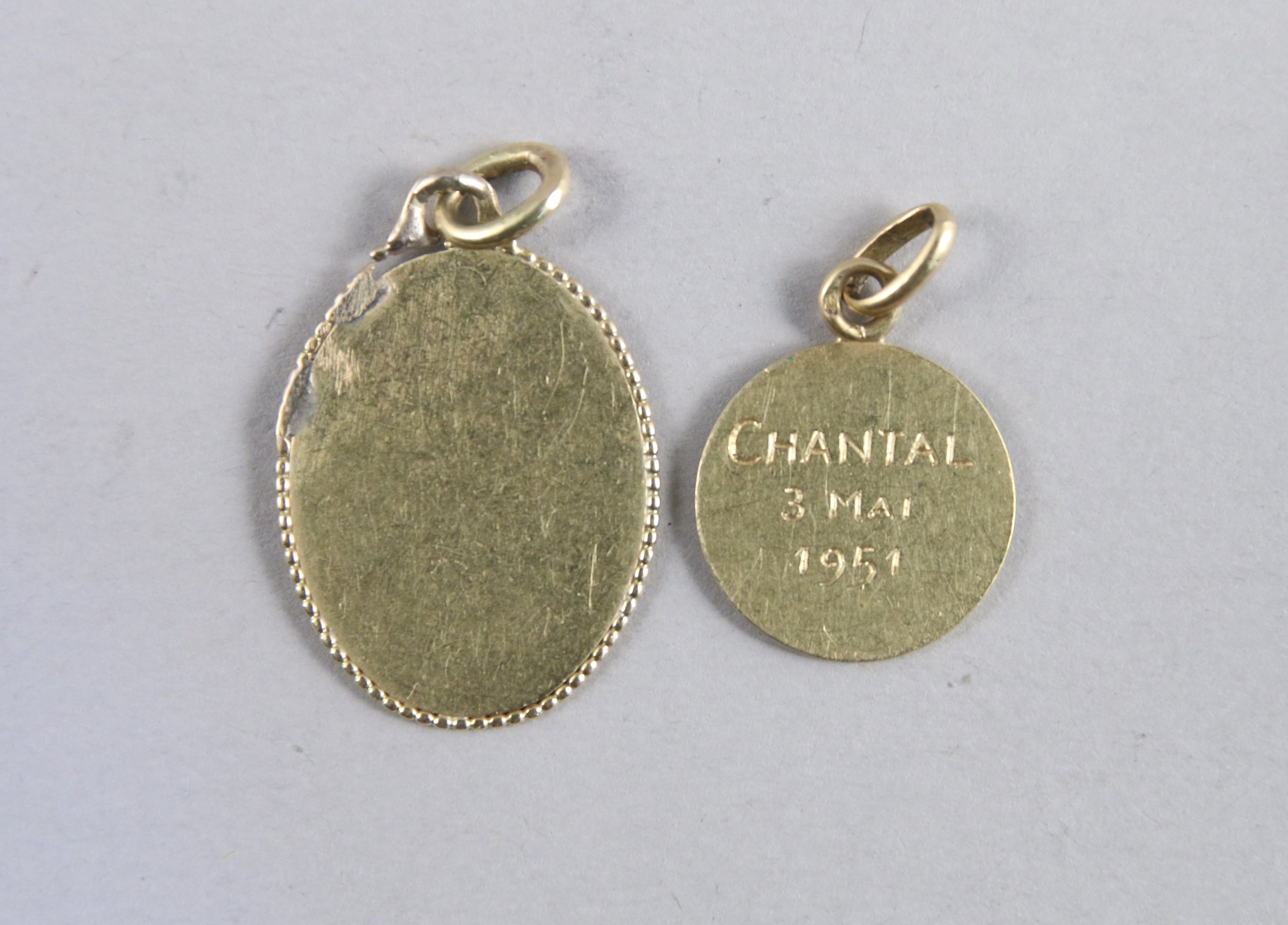Deux MÉDAILLES de la SAINTE VIERGE en or jaune l'une ovale signée E.Dropsy (pour Jean Baptiste Émile Dropsy (1858-1923)). Et l'autre signée Becker, au revers gravée "CHANTAL 3 MAI 1951". Poinçon tête d'aigle.