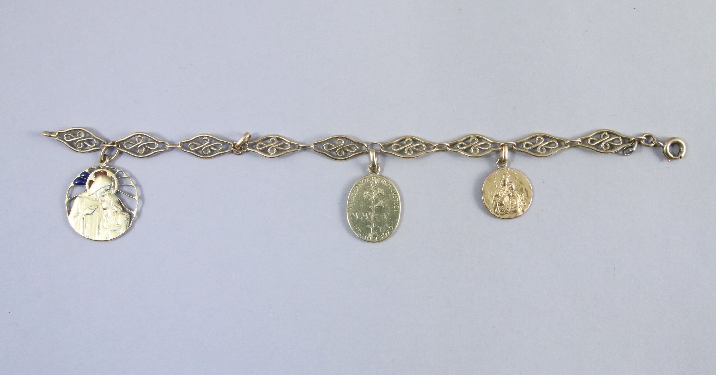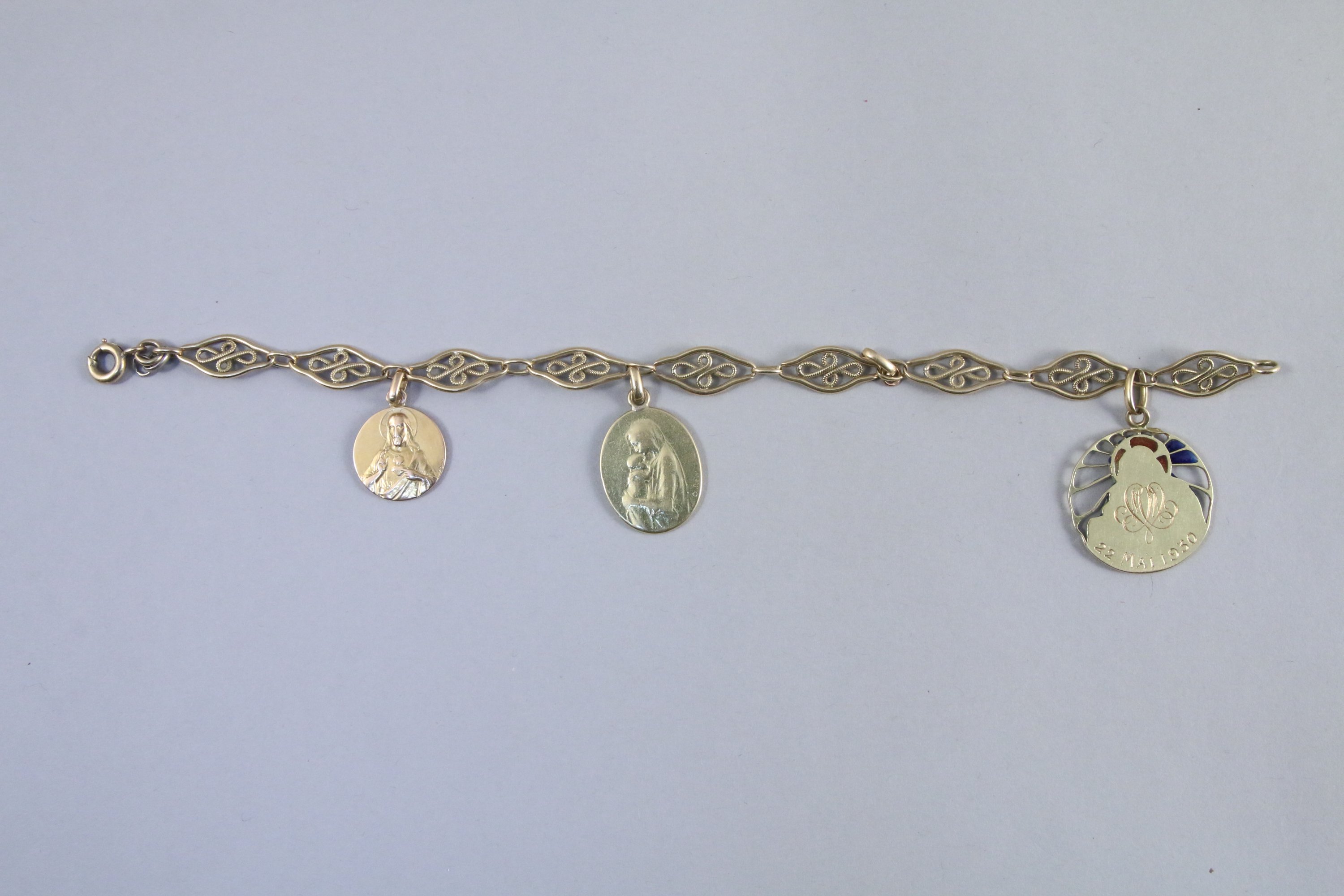 BRACELET PENDELOQUE en or jaune orné de trois médailles dont une anciennement en plique à jour.