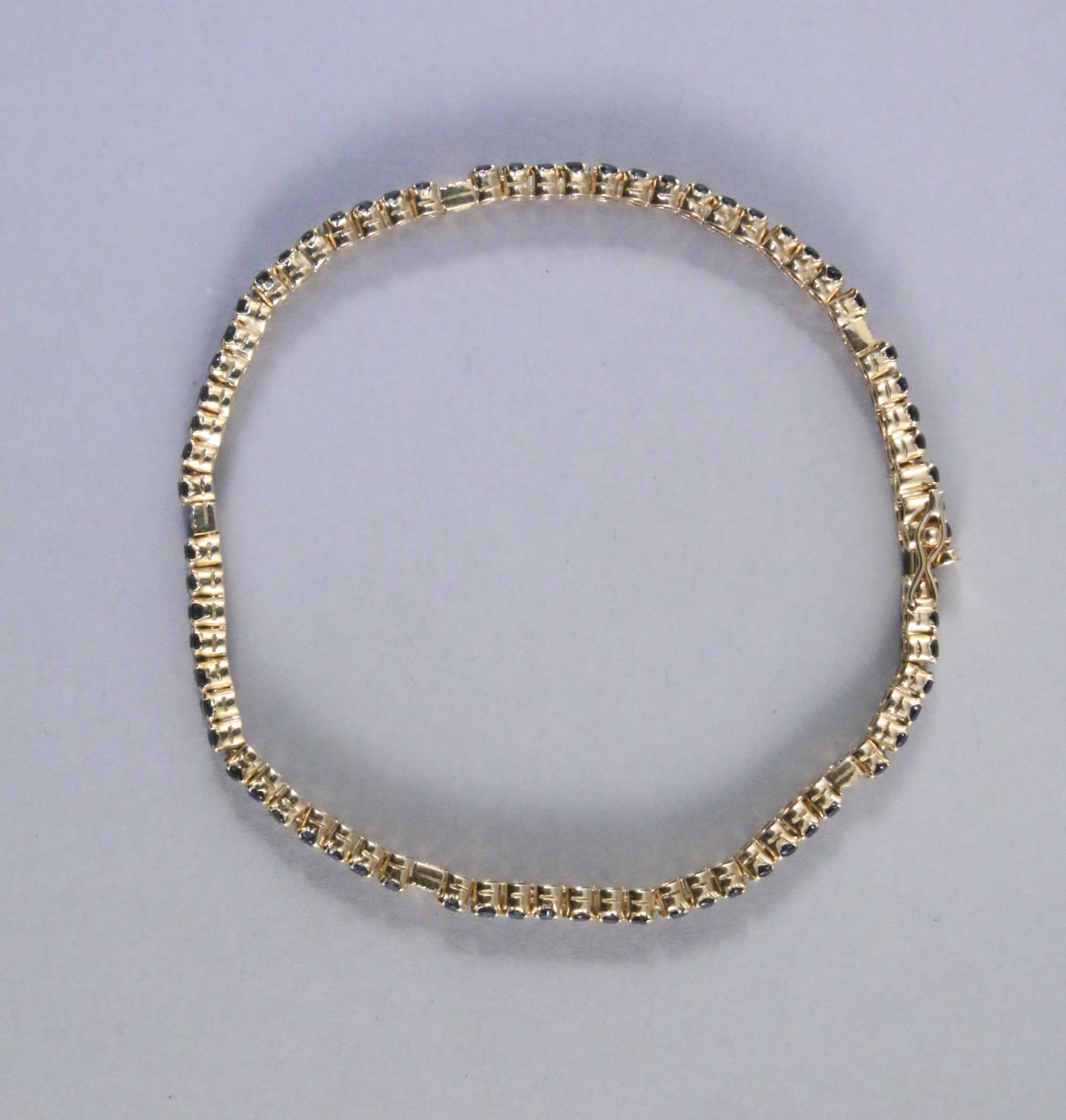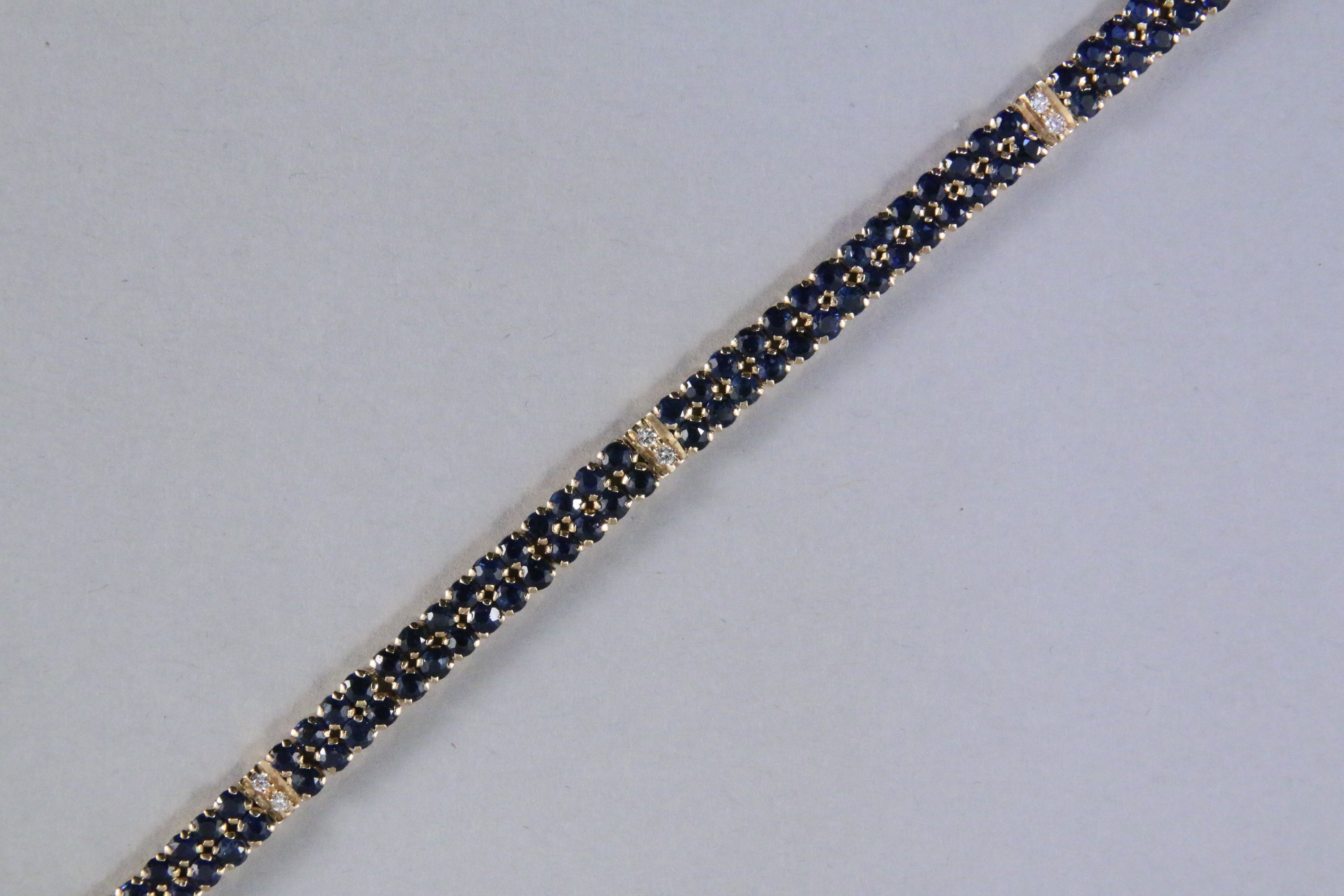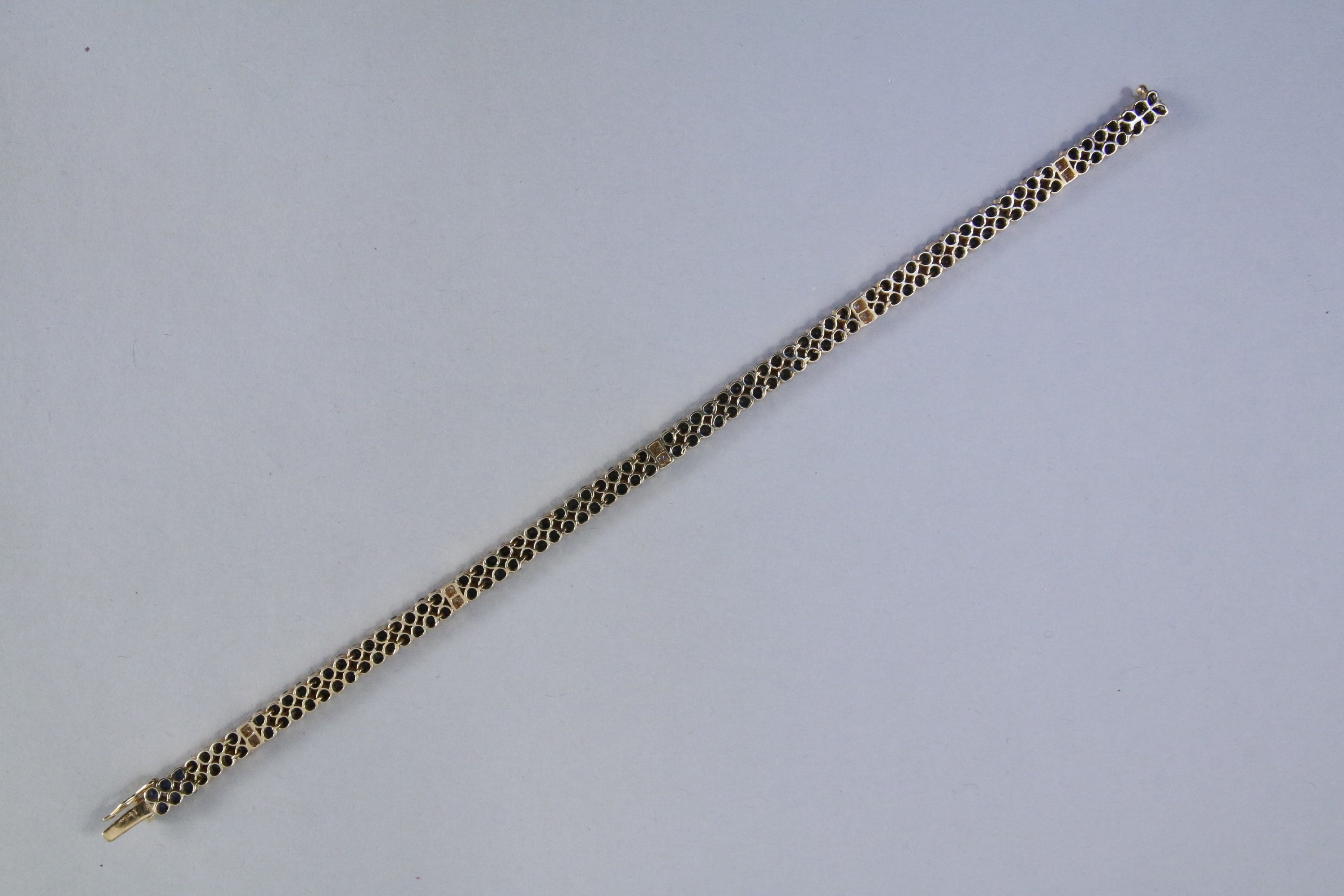 BRACELET SOUPLE en or jaune orné de 40 SAPHIRS et 10 DIAMANTS en ligne sur deux rangs.