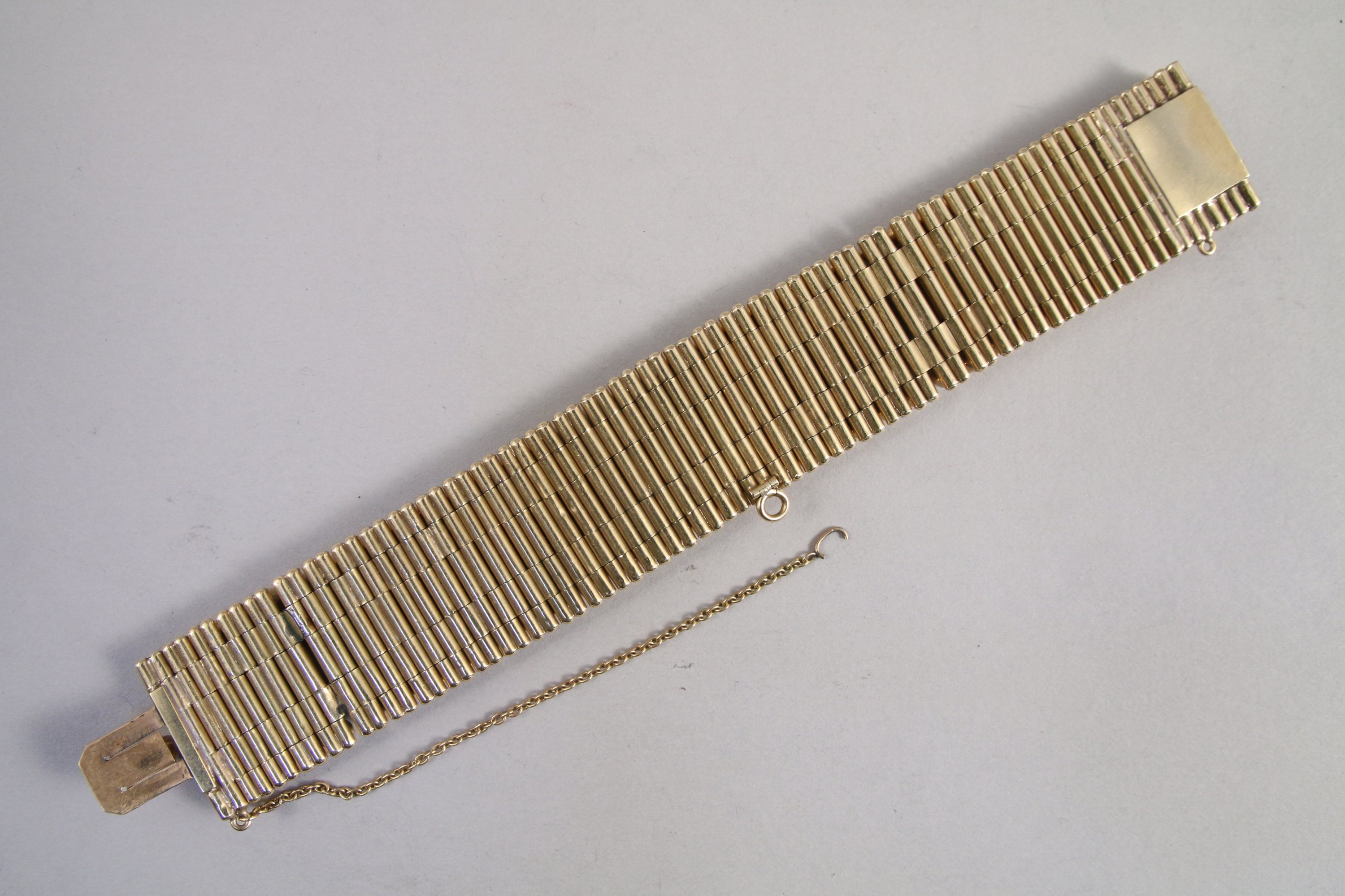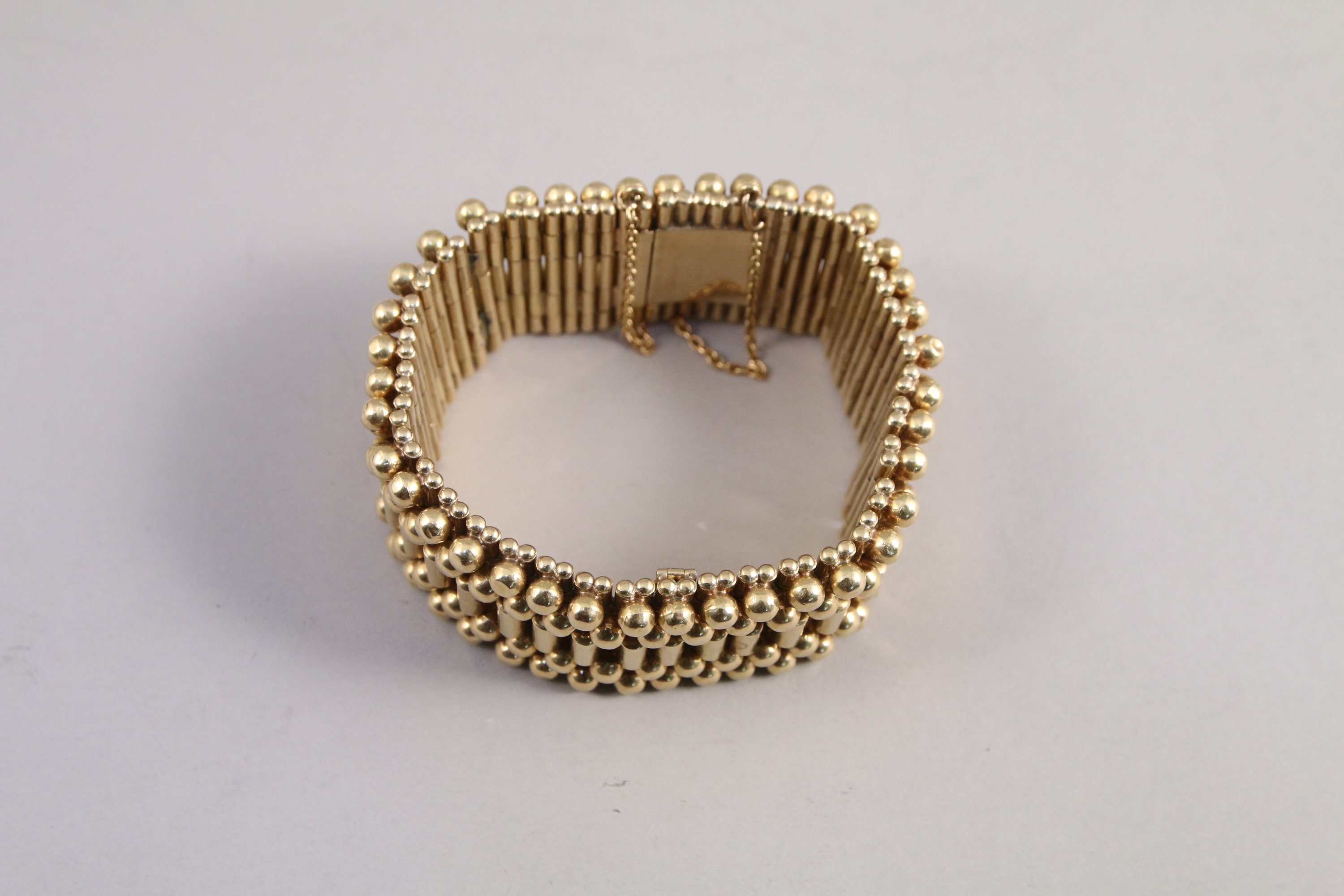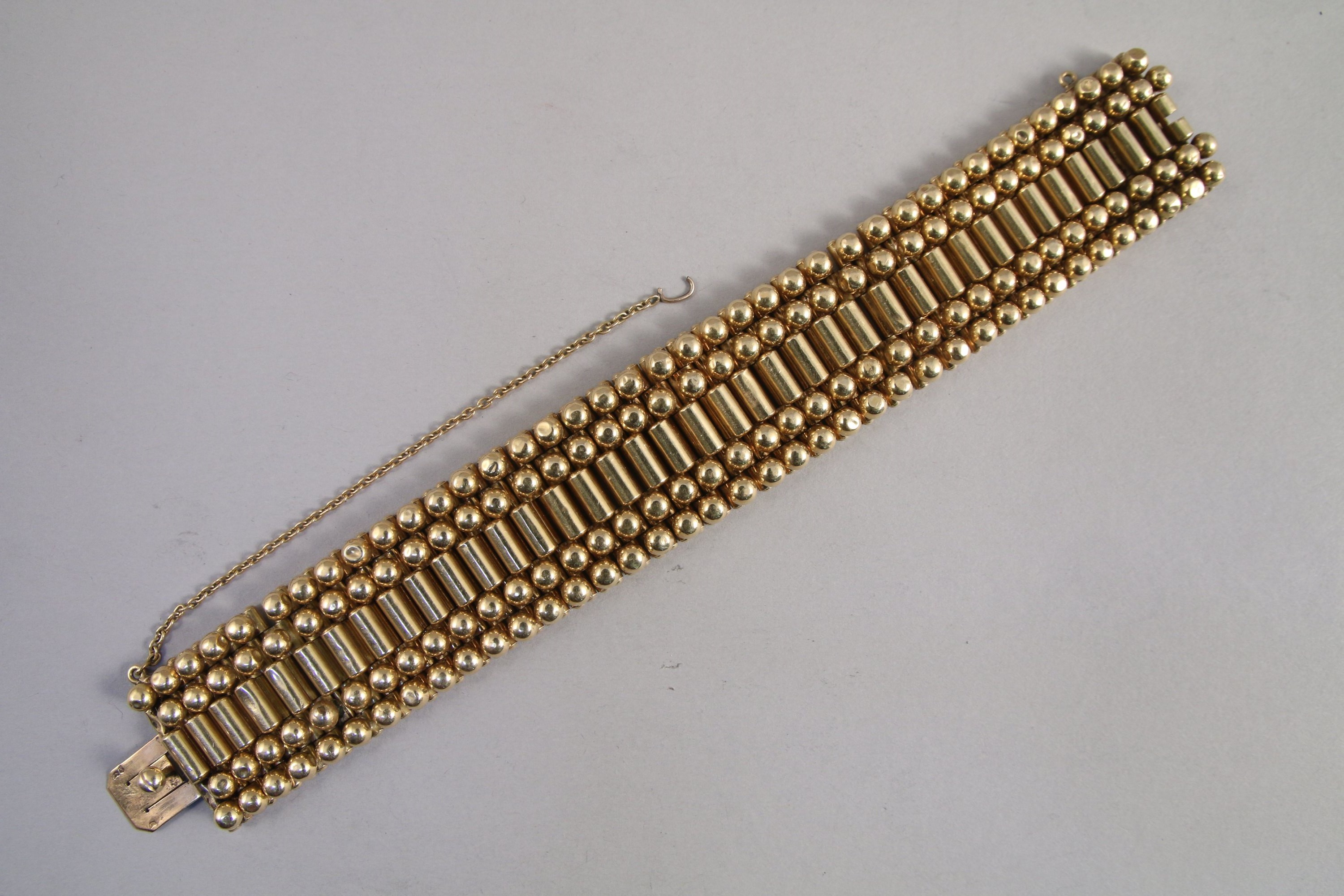 BRACELET ARTICULÉ en or 750 millièmes à décor appliqué d'une frise de bâtonnets flanquée de deux frises de perles.
