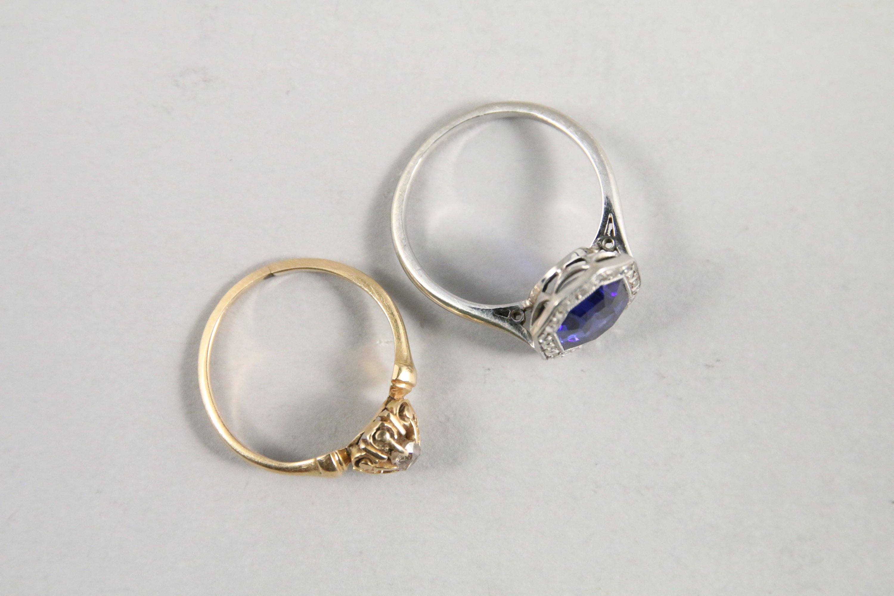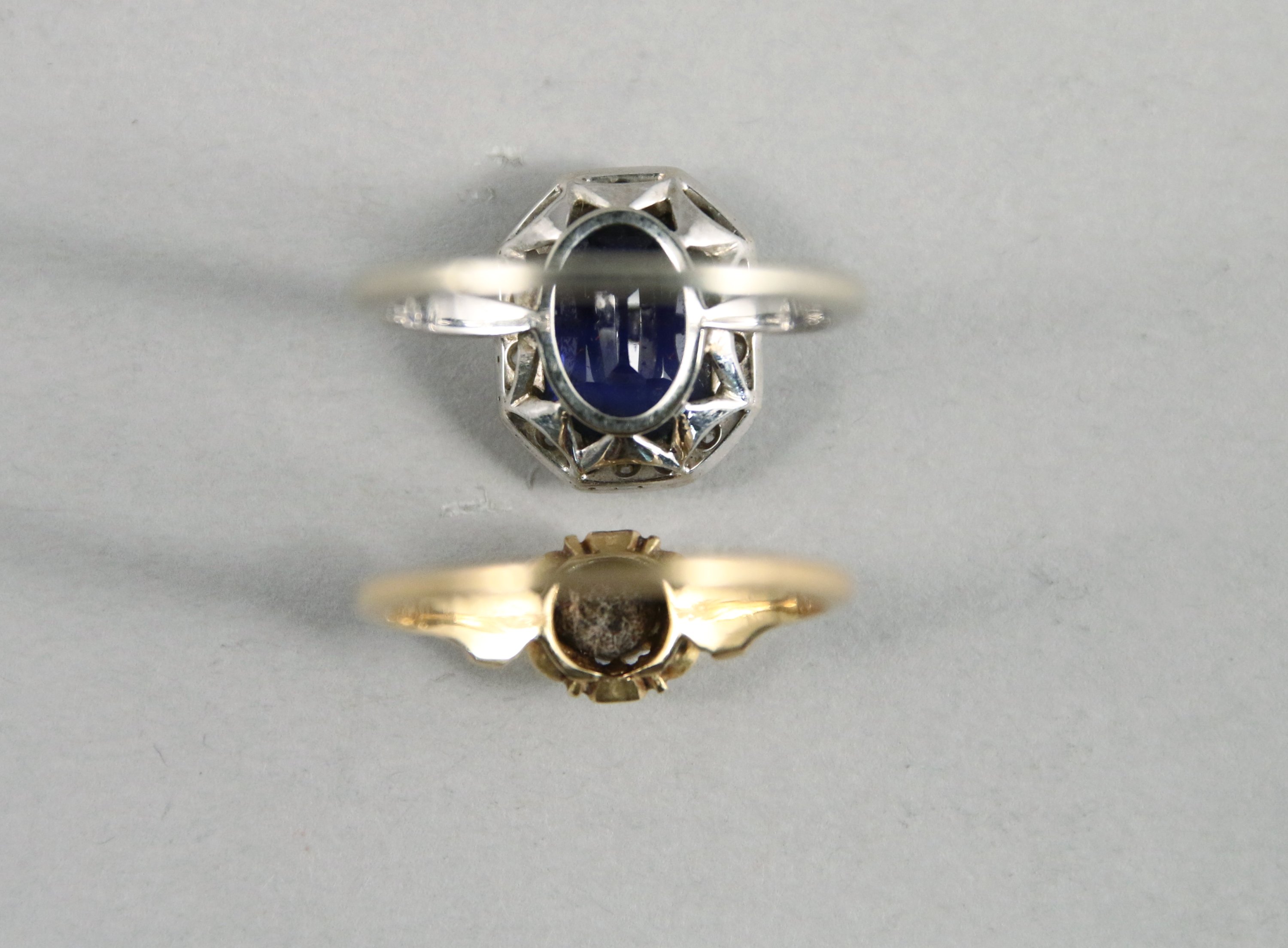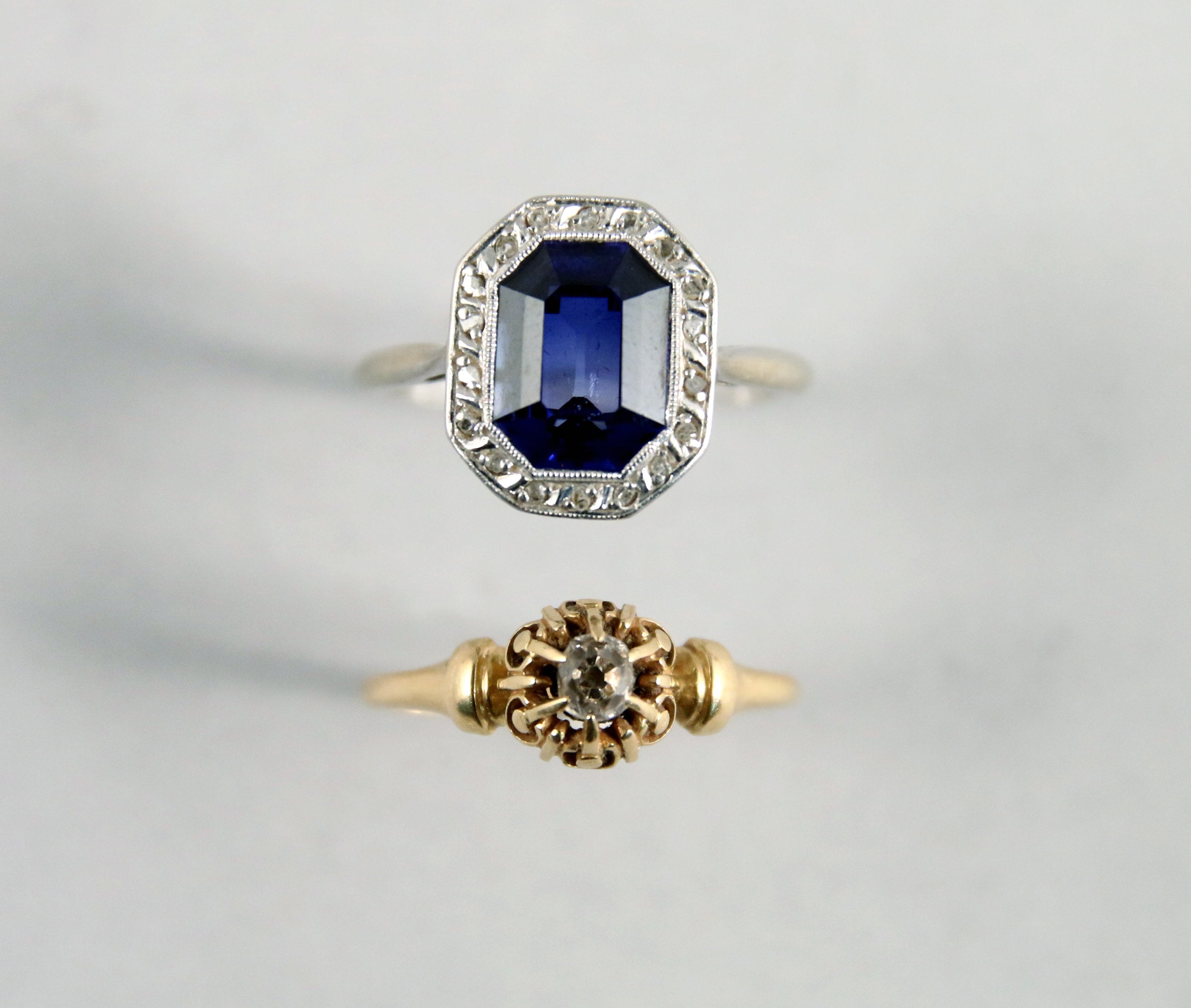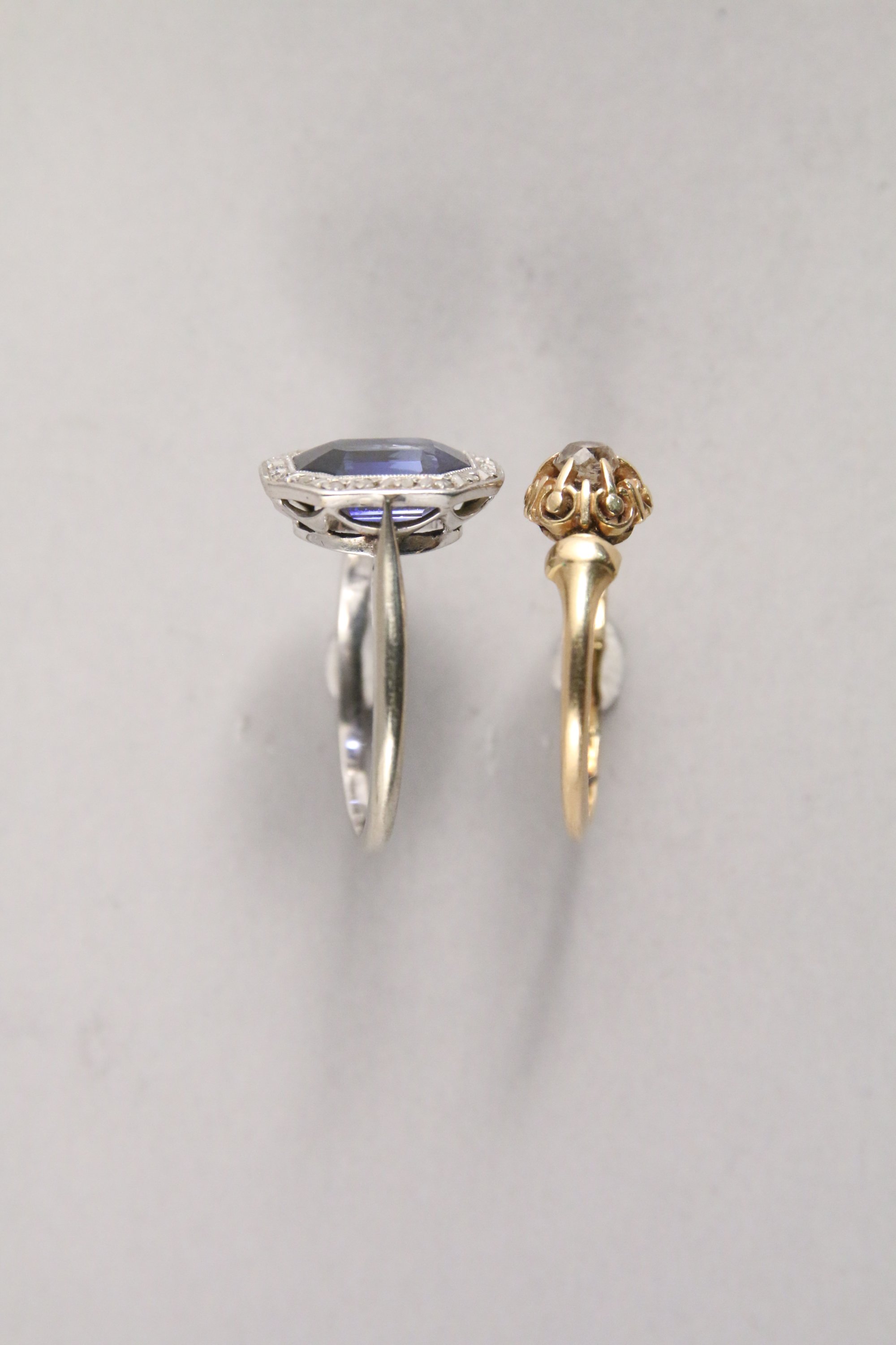 Deux BAGUES, l'une en or jaune 750 milièmes ornée d'un petit DIAMANT (TDD 51, poids 2,1 g), l'autre en or blanc 750 milièmes ou platine ornée d'une pierre bleue (?) dans une entourage de brillants (TDD 53, Poids 3,4 g).