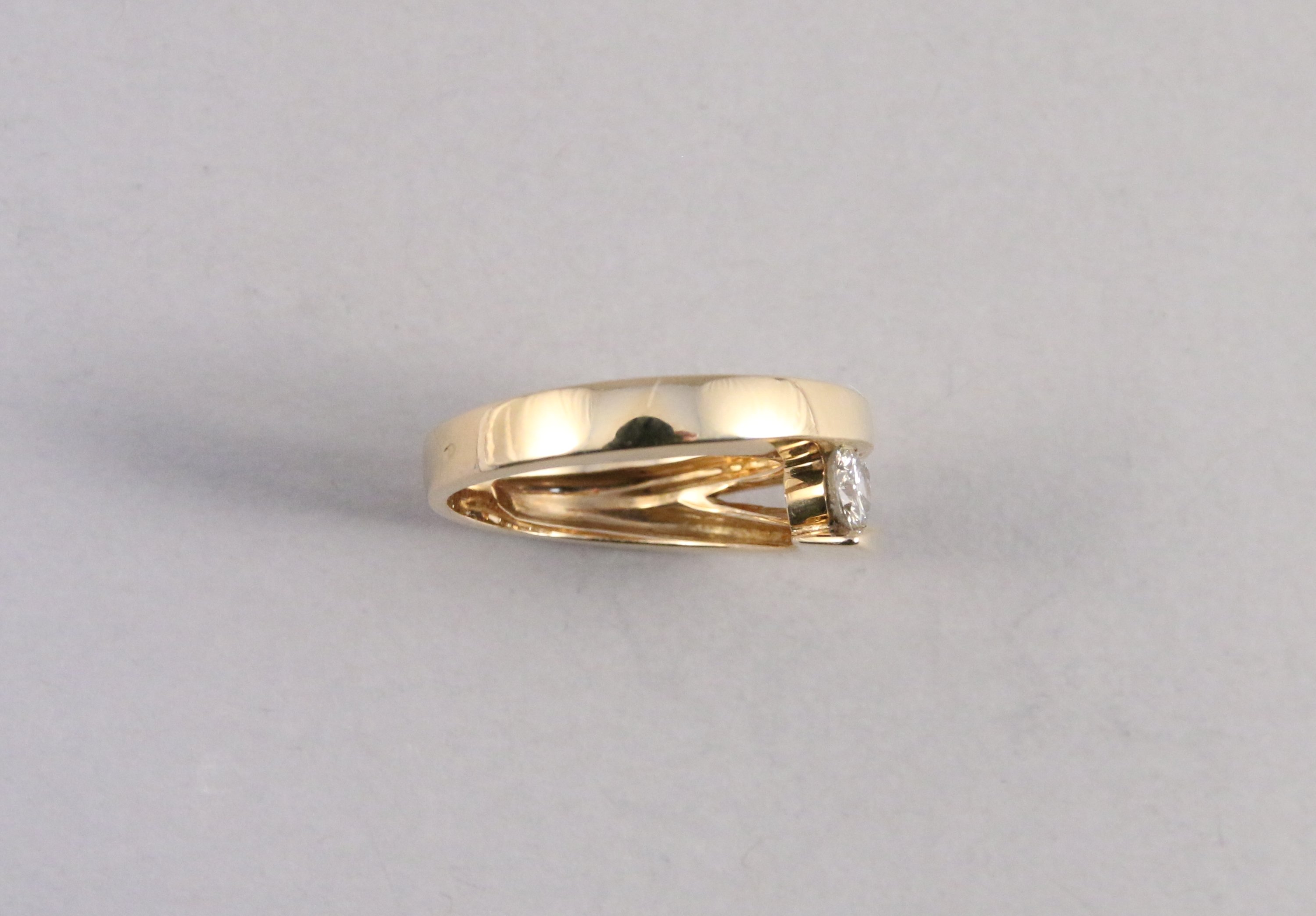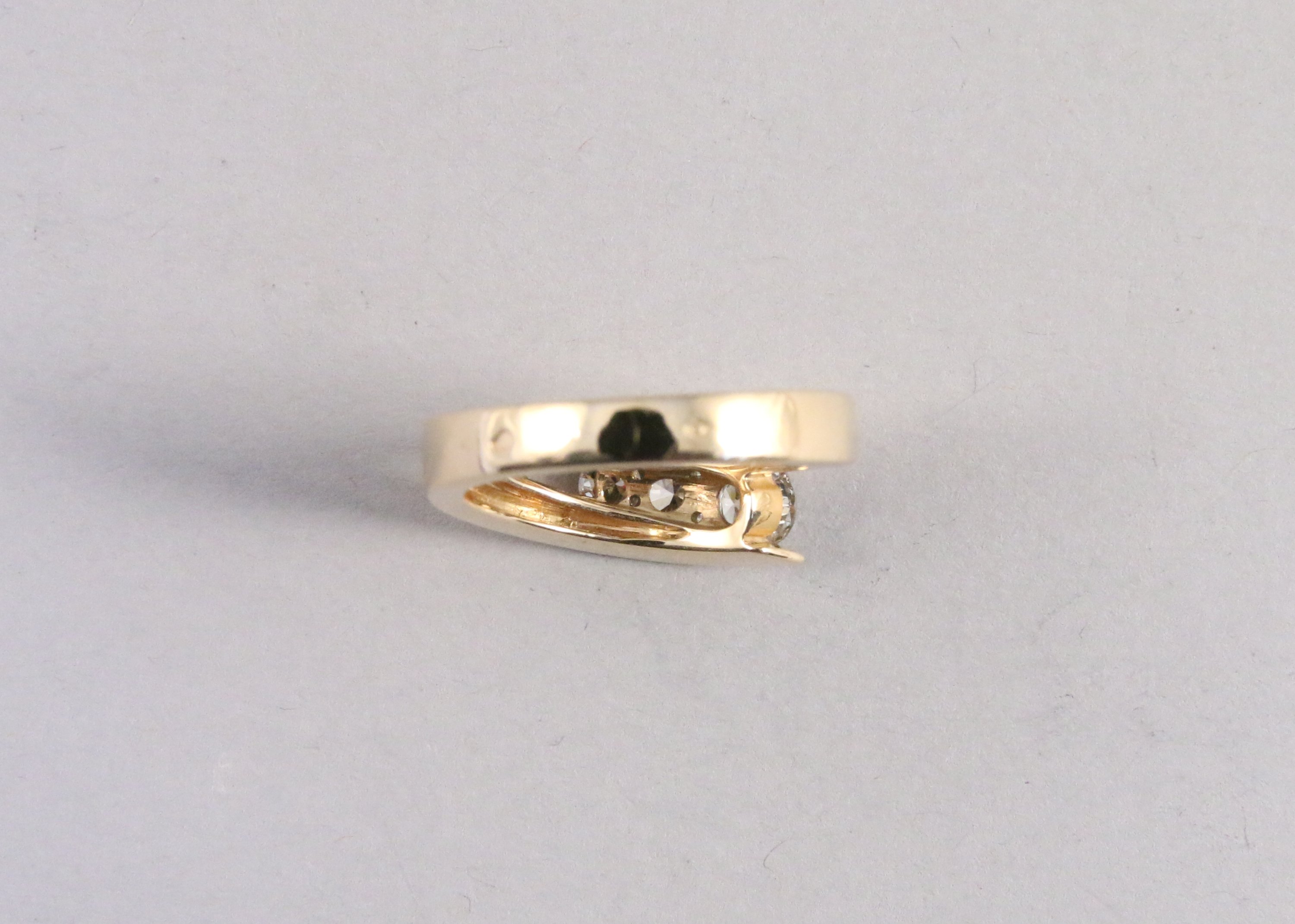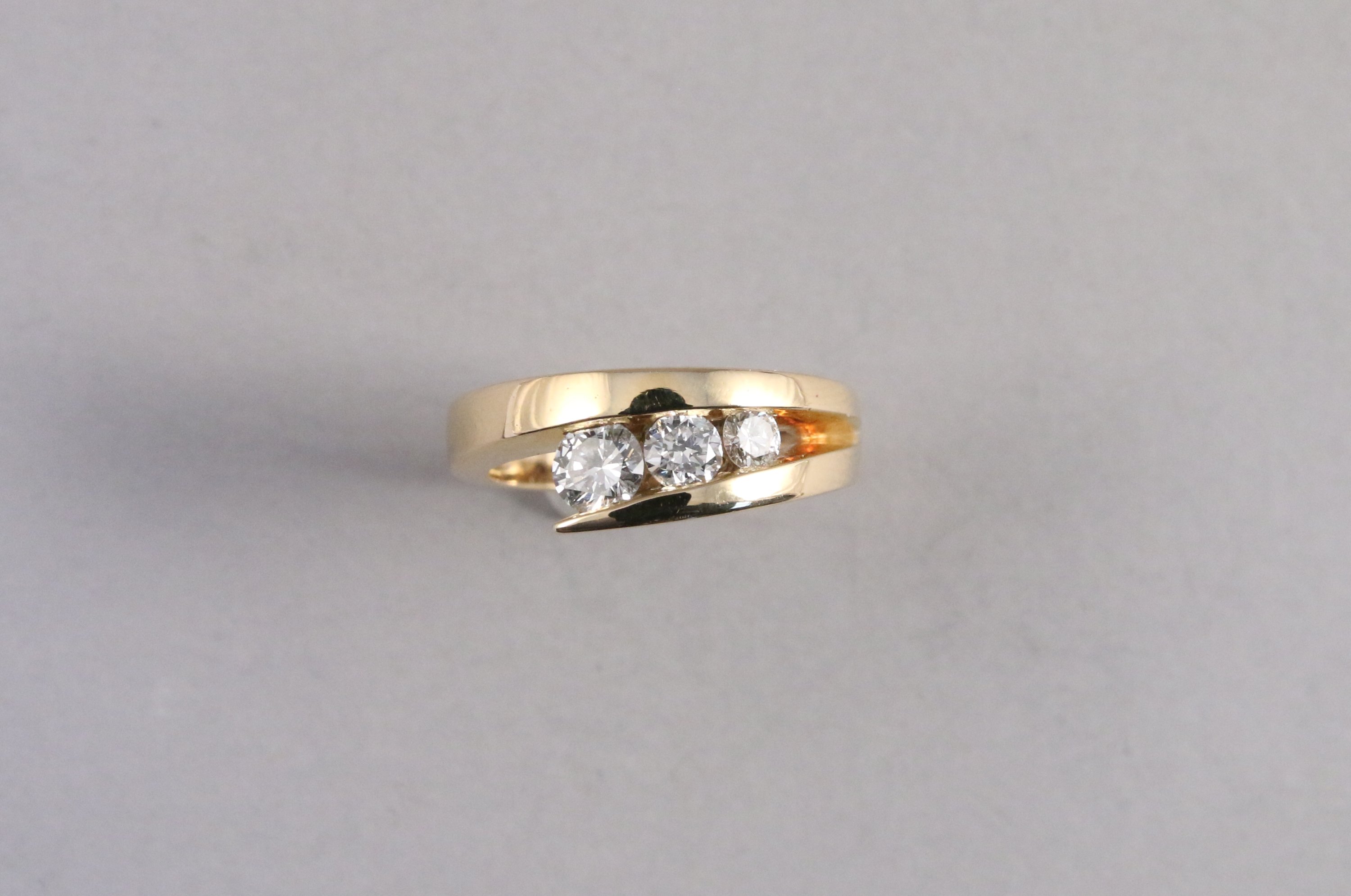 BAGUE en or jaune 750 millièmes à deux joncs écartés élégament ornée de trois DIAMANTS en ligne d'environ 0,10, 0,20 et 0,40 ct.